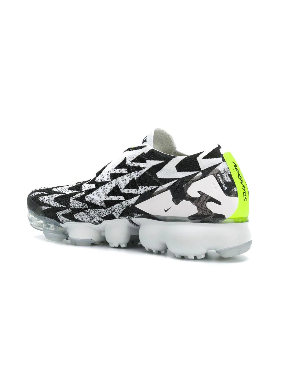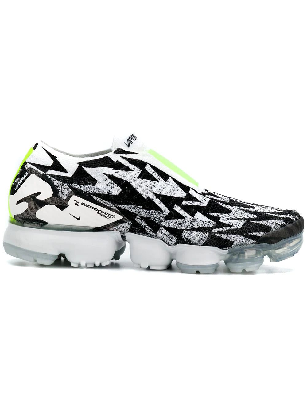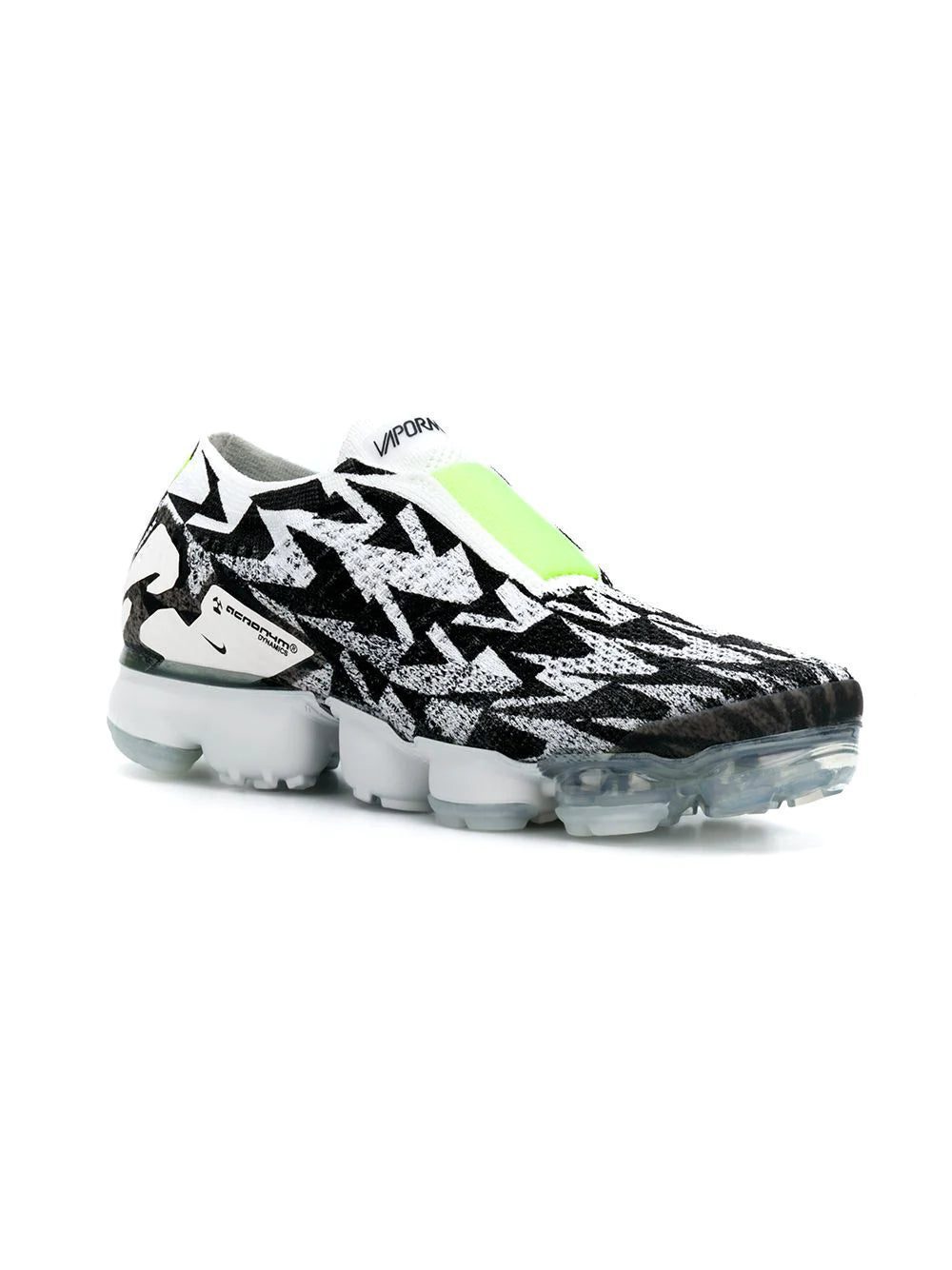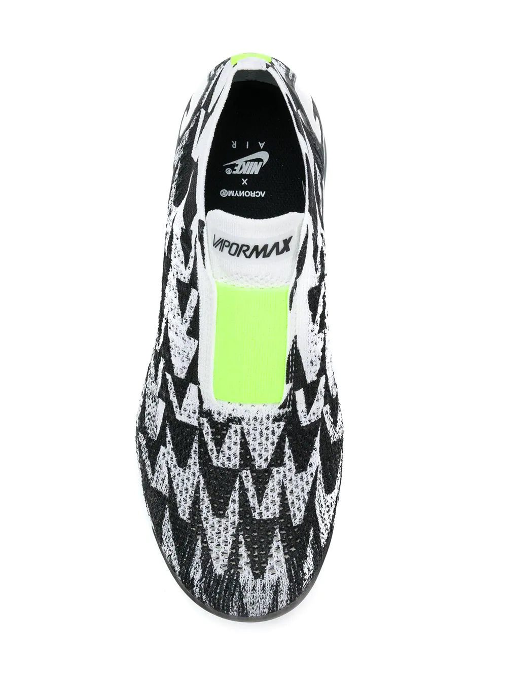 Black and white Vapormax slip-on sneakers from Nike featuring a knitted style, an abstract print, a round toe, a brand embossed tongue, neon trimming, branded heel counter, a ridged rubber sole and a slip-on style.