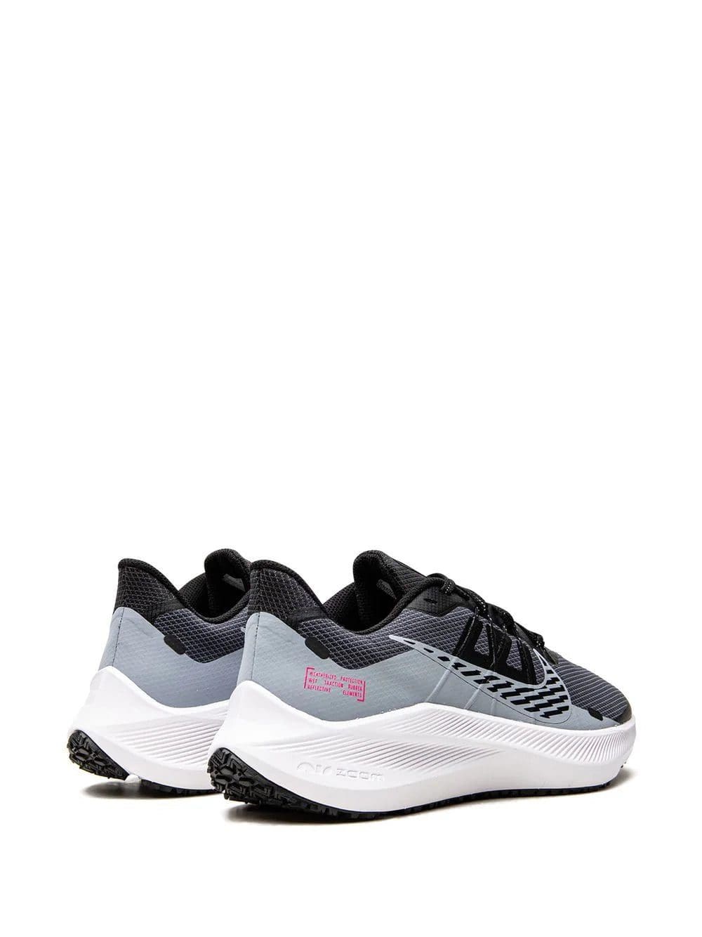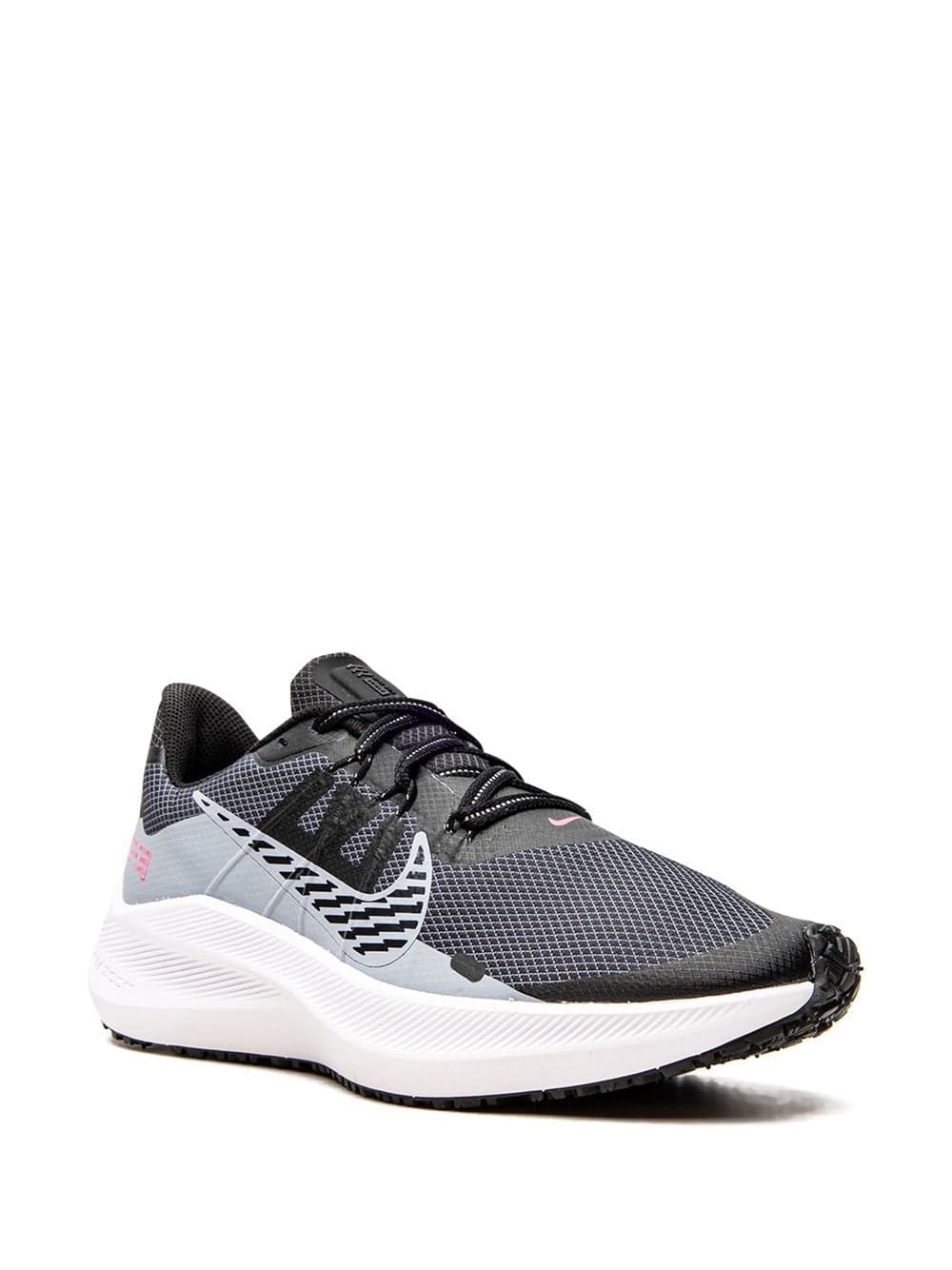 The Nike Zoom Winflo 7 Shield offers an excellent fit and cushioning. This black version is highlighted by a Swoosh logo on the sides and on the upper. Underneath, the rubber sole has been altered with an organic-inspired waffle pattern that increases traction and flexibility.