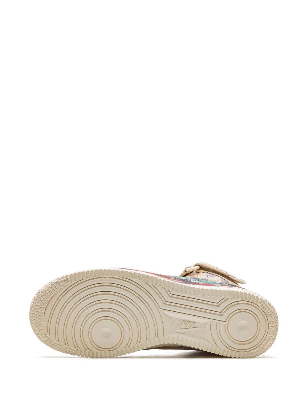 The Louis Vuitton x Nike Air Force 1 Mid "Graffiti" features a leather upper with a beige and brown checkerboard pattern. Its design stands out thanks to the multicoloured graffiti on the quarter panel - a work of the artist Ghusto Leone. This high-top sneaker is secured by a side touch strap at the ankle and is finished by a cream rubber sole.