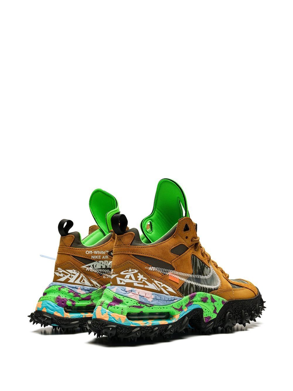 The Nike x Off-White Air Terra Forma features a bold and chunky design. This pair is crafted from light brown suede, coupling a multi-coloured marbling effect and is enhanced with Helvetica text along the profiles in true Off-White fashion. Underneath, a chunky rubber sole with a visible Air unit completes the design.