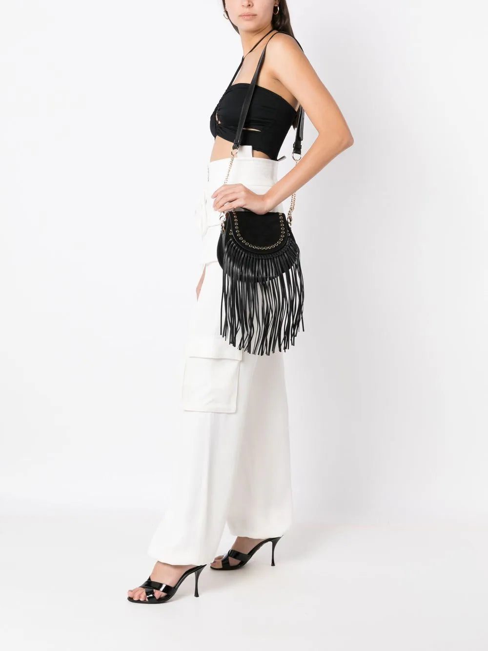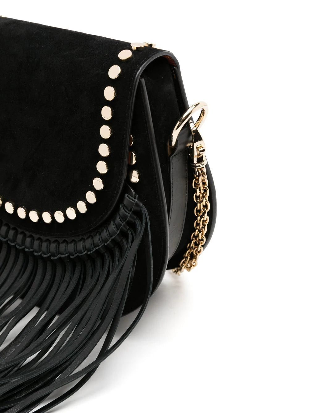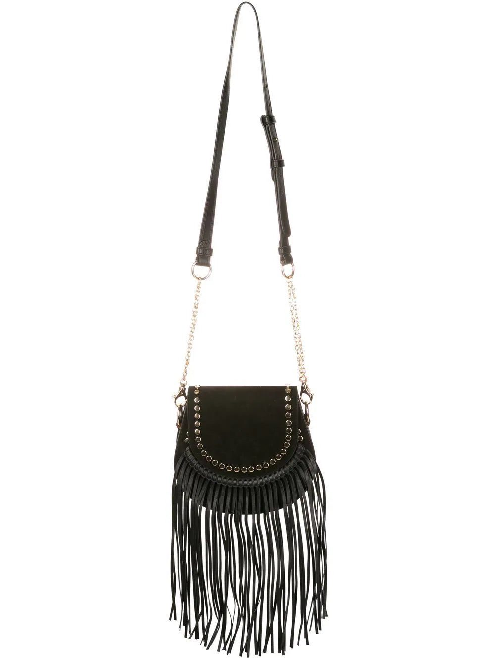 Clara fringed shoulder bag from NK featuring black, calf leather, gold-tone stud detailing, fringed edge, foldover top and leather and chain-link shoulder strap.