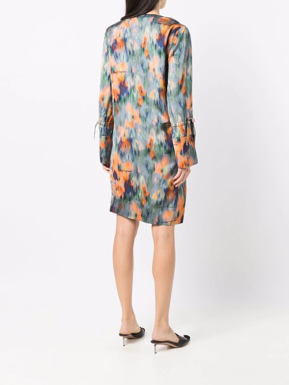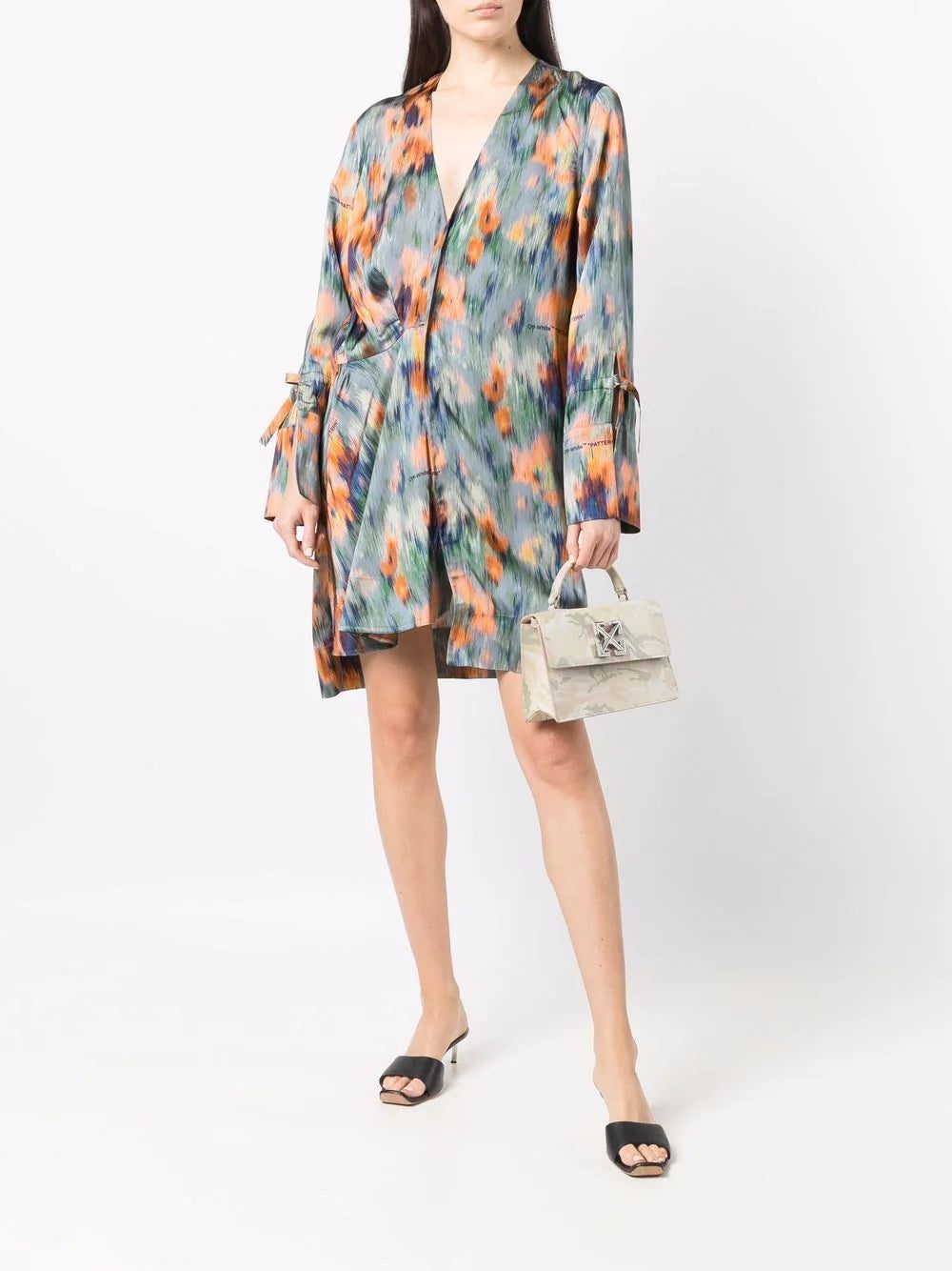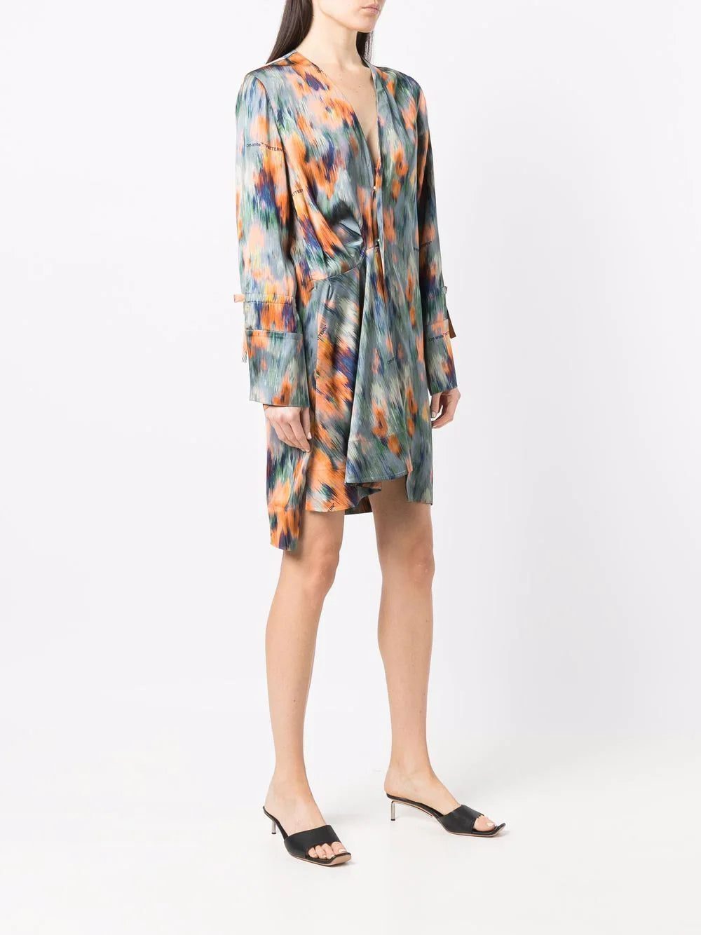 Off-White lends their irreverent style to dressing up with this fluid dress. Adorned with an abstract 'Chine Flowers' pattern, the dress is cut for an asymmetric design with a slightly draped front. The unexpected silhouette is finished with tie-details at the cuffs and the label's logo lettering dotted throughout.