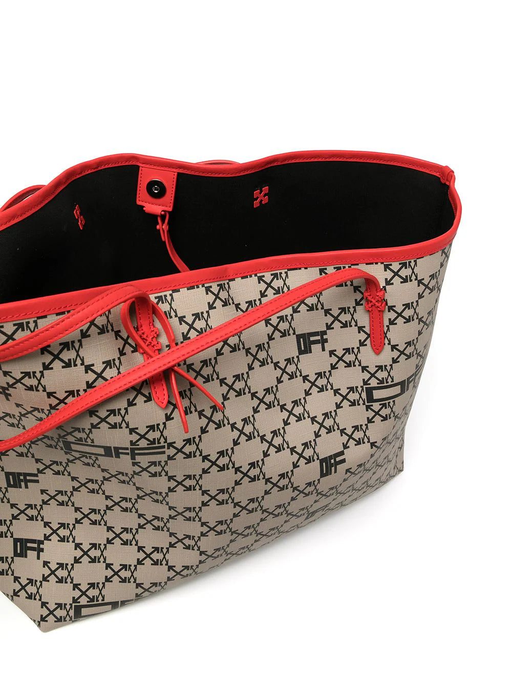Streetwear label Off-White puts a signature irreverent twist on a classic tote bag, by accenting it with iconic branded motifs such as the Arrows logo print and zip-tie tag. The contrasting bold red trim is complemented by a matching removable pouch, emblazoned with a Swimming Man logo.