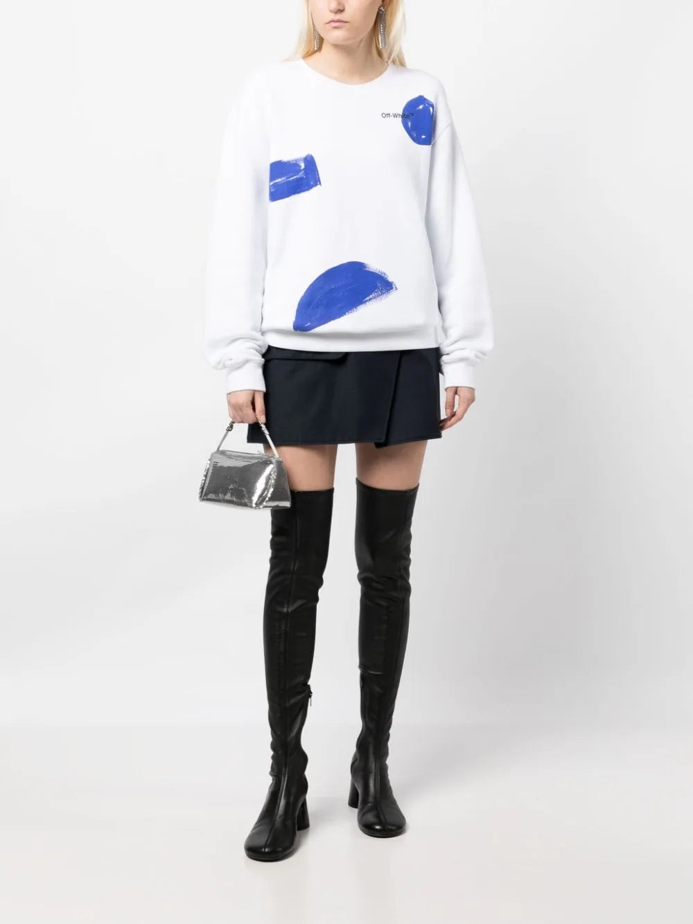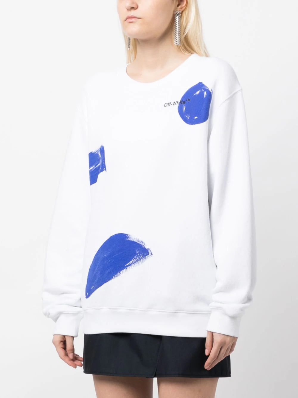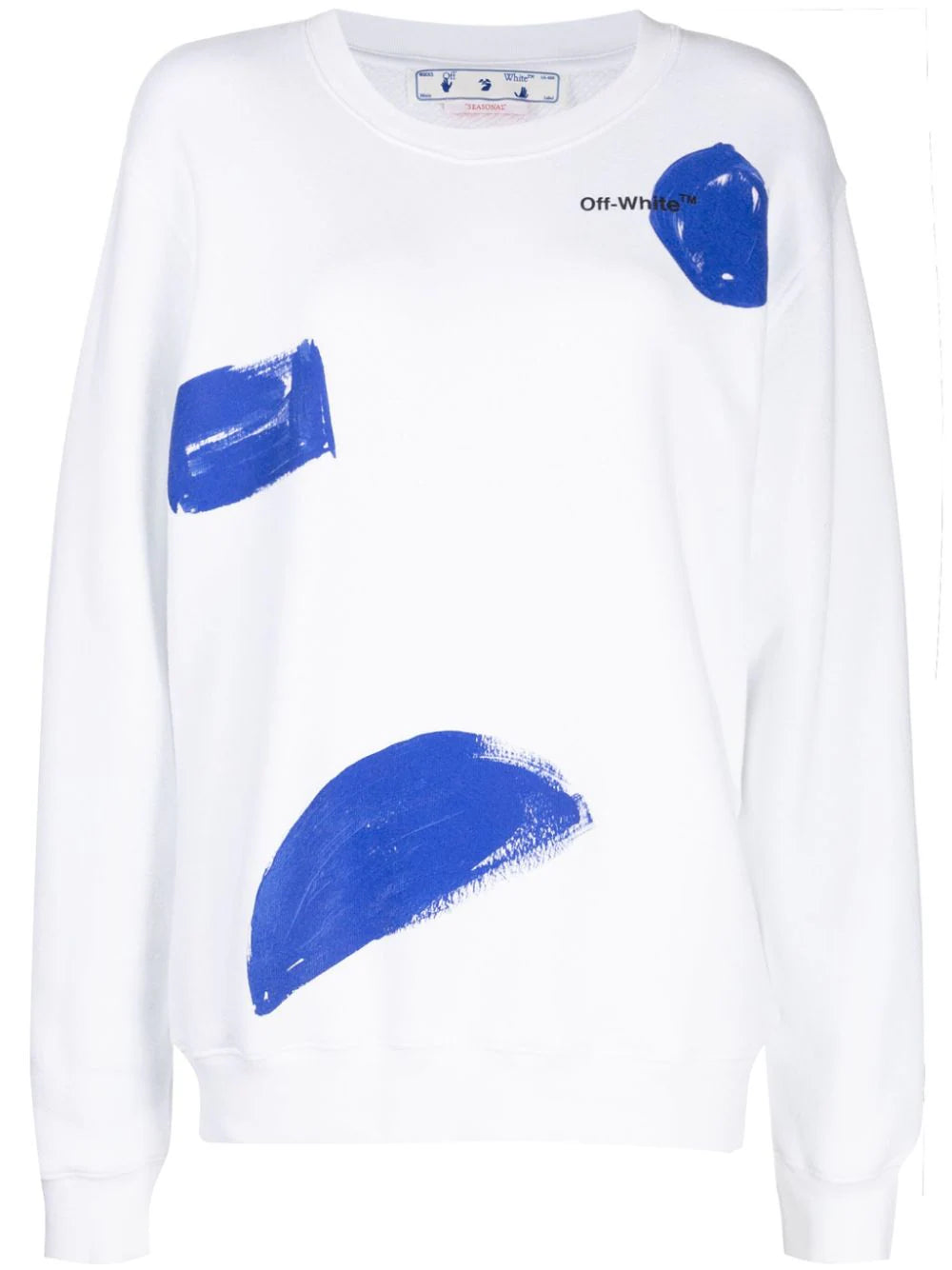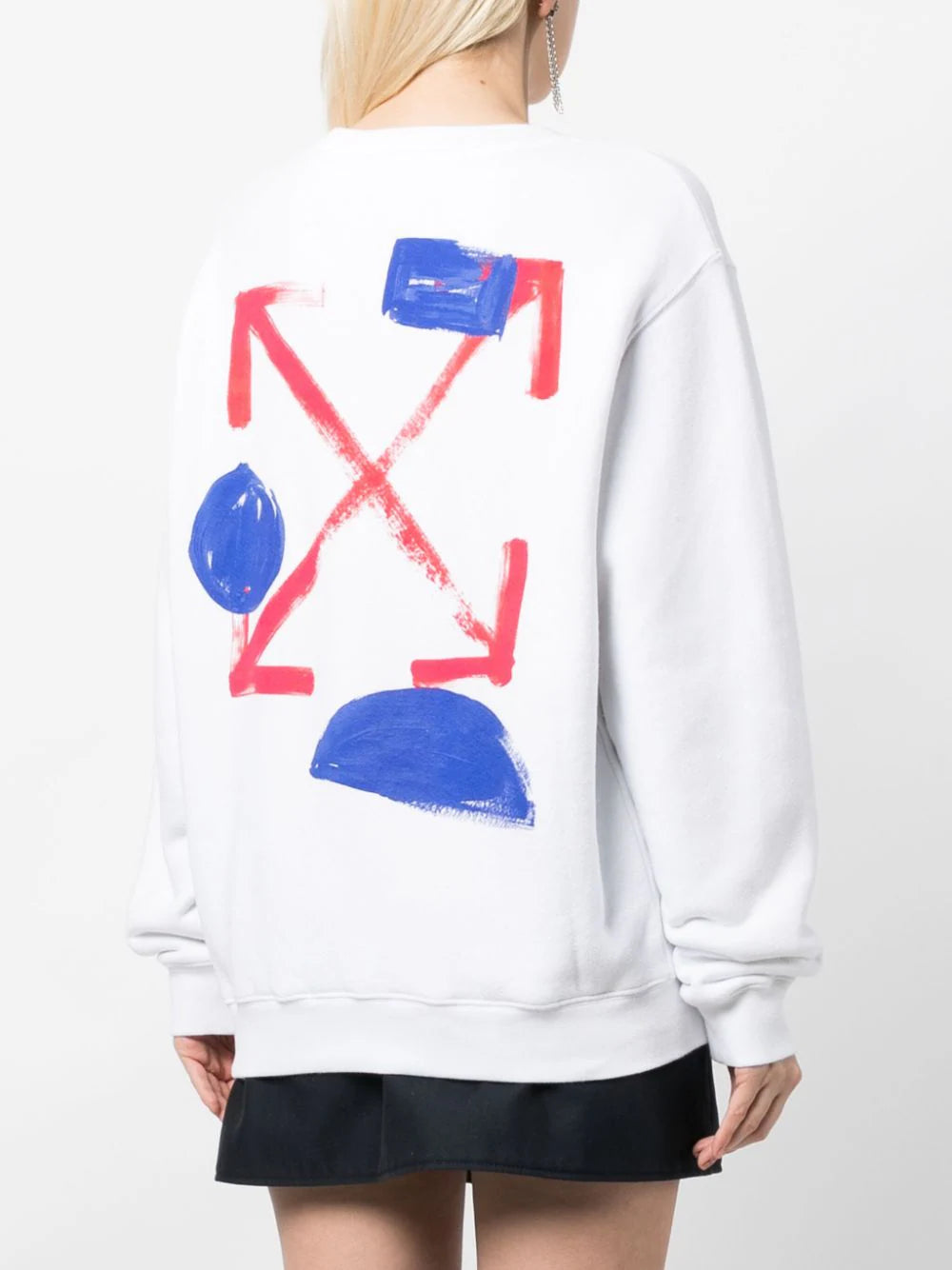 Off-White's captivating sweatshirt is adorned with a painterly print that seamlessly blends white, blue and red hues. Crafted from stretch-cotton, it showcases the brand's iconic logo at the chest and the signature Arrows motif to the rear, creating a harmonious fusion of art and fashion.