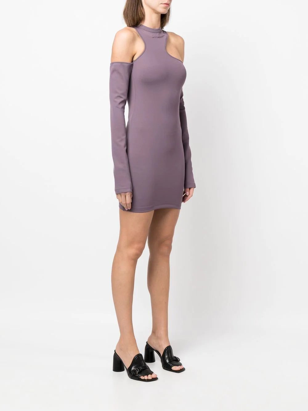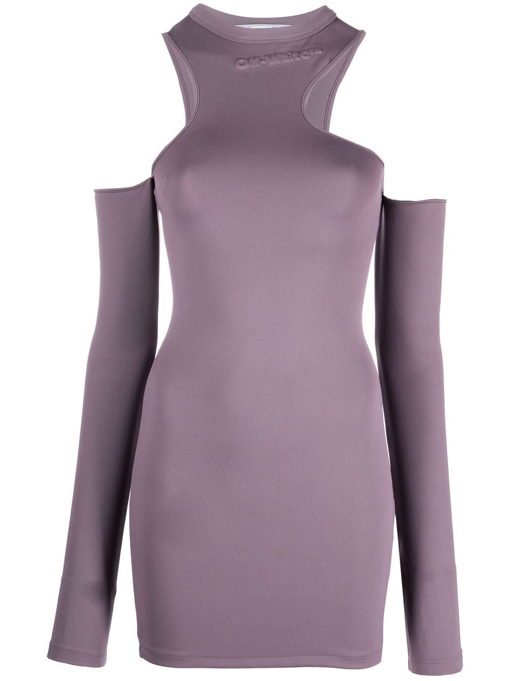 Off-White showcases their signature contemporary style with this minidress. Crafted to an asymmetric silhouette, it is finished with tonal logo lettering for a subtle take on branding.