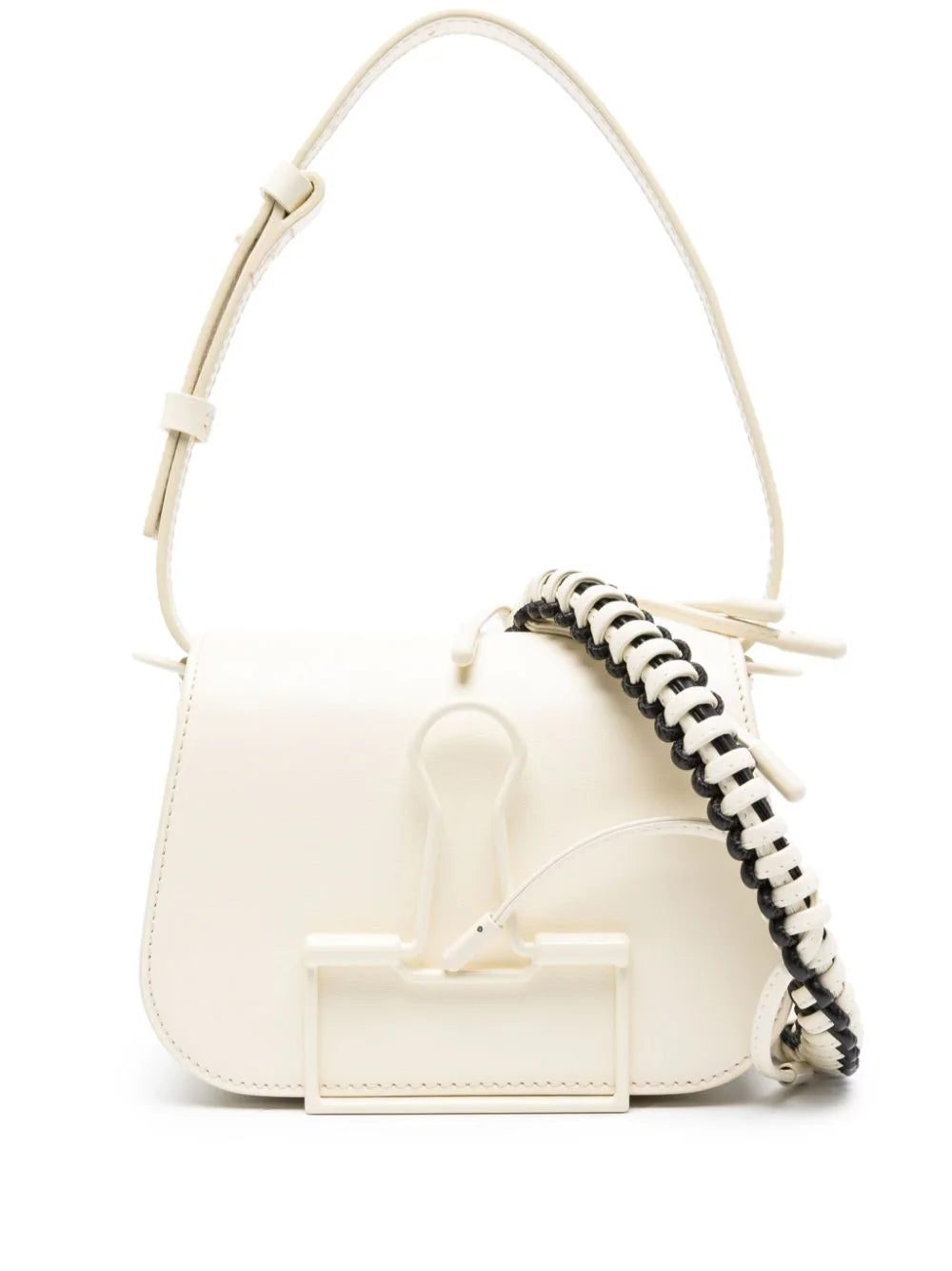 Off-White's Binder leather shoulder bag is a testament to the brand's industrial aesthetic. Crafted from beige leather with a detachable two-tone braided shoulder strap, the focus of the design lies in the tonal hardware to the front that mimics stationary binder clips.