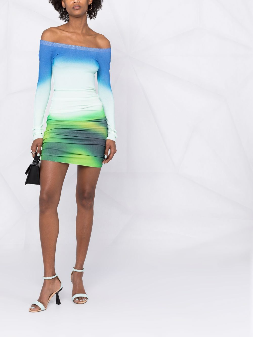 Decorated throughout with Off-White's Blurred print, this mid-length fitted dress is woven in a knitted construction. Produced in hues of blue and green, the off-shoulder design exhibits the brand's penchant for bold graphic-led aesthetics.
