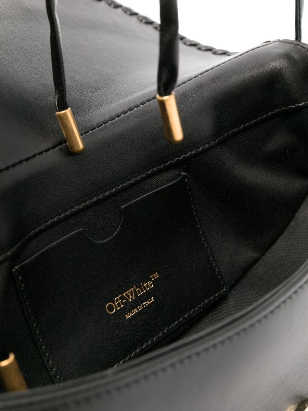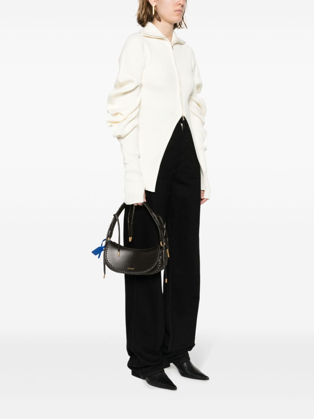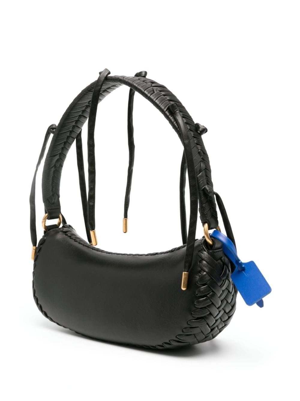 Off-White spotlights its artisanal side with this tote bag: note the intricately woven braided trim that contrasts the smooth black leather base. It’s finished with a signature blue Zip Tie charm that evokes distinctive appeal.