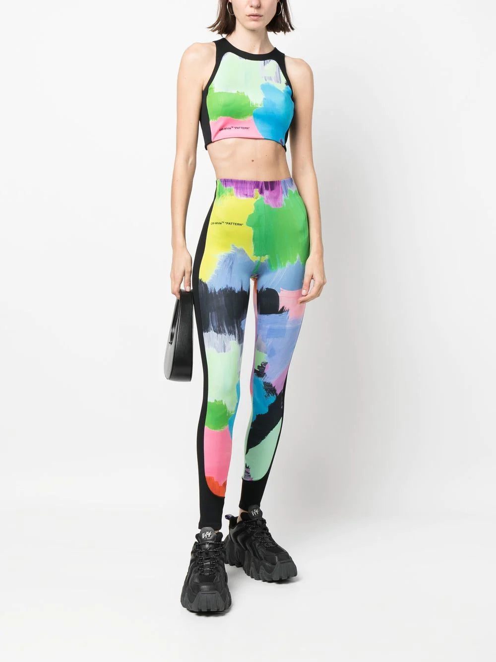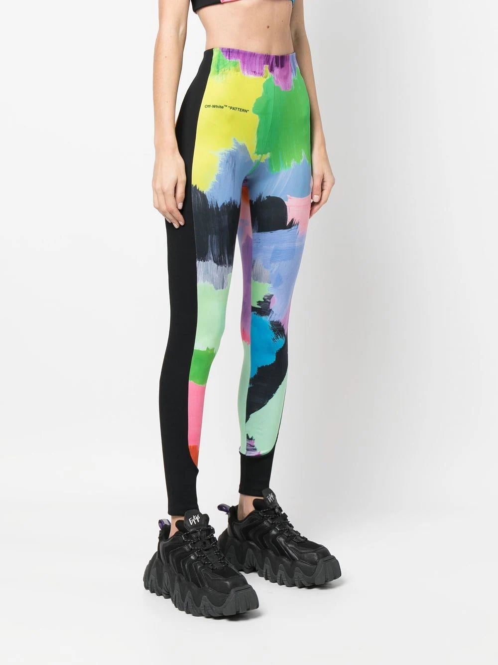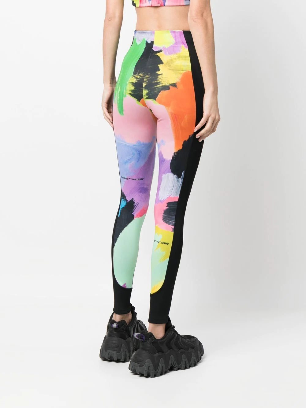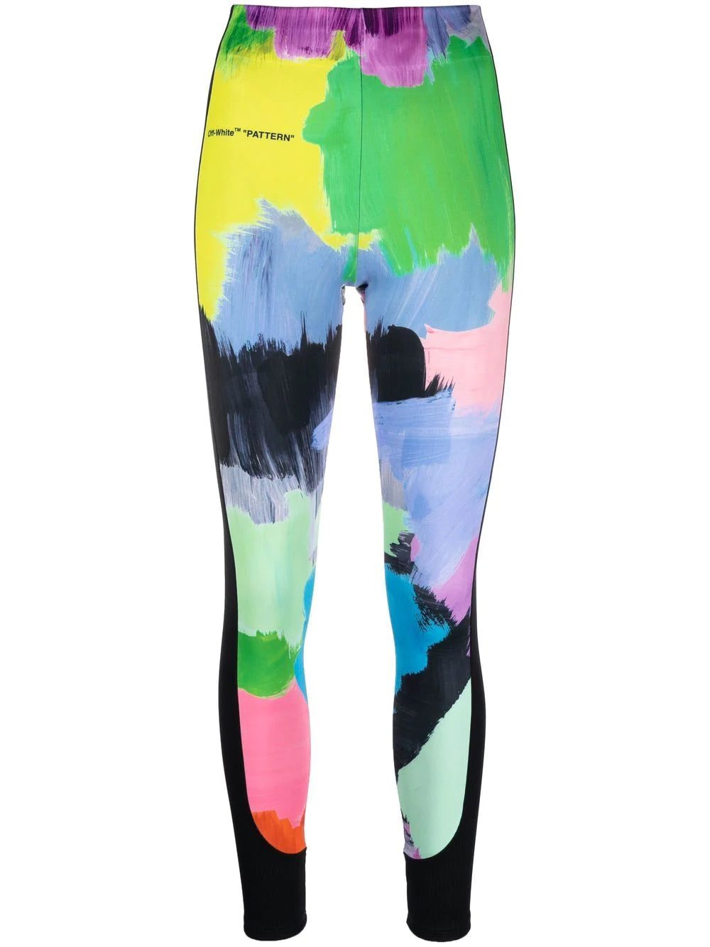 Off-White's leggings are defined by a multicoloured brush stroke pattern reinforced with the brand's characteristic quote marks, labelled here as "PATTERN". A wide black stripe to the sides adds a sporty touch to the garment.