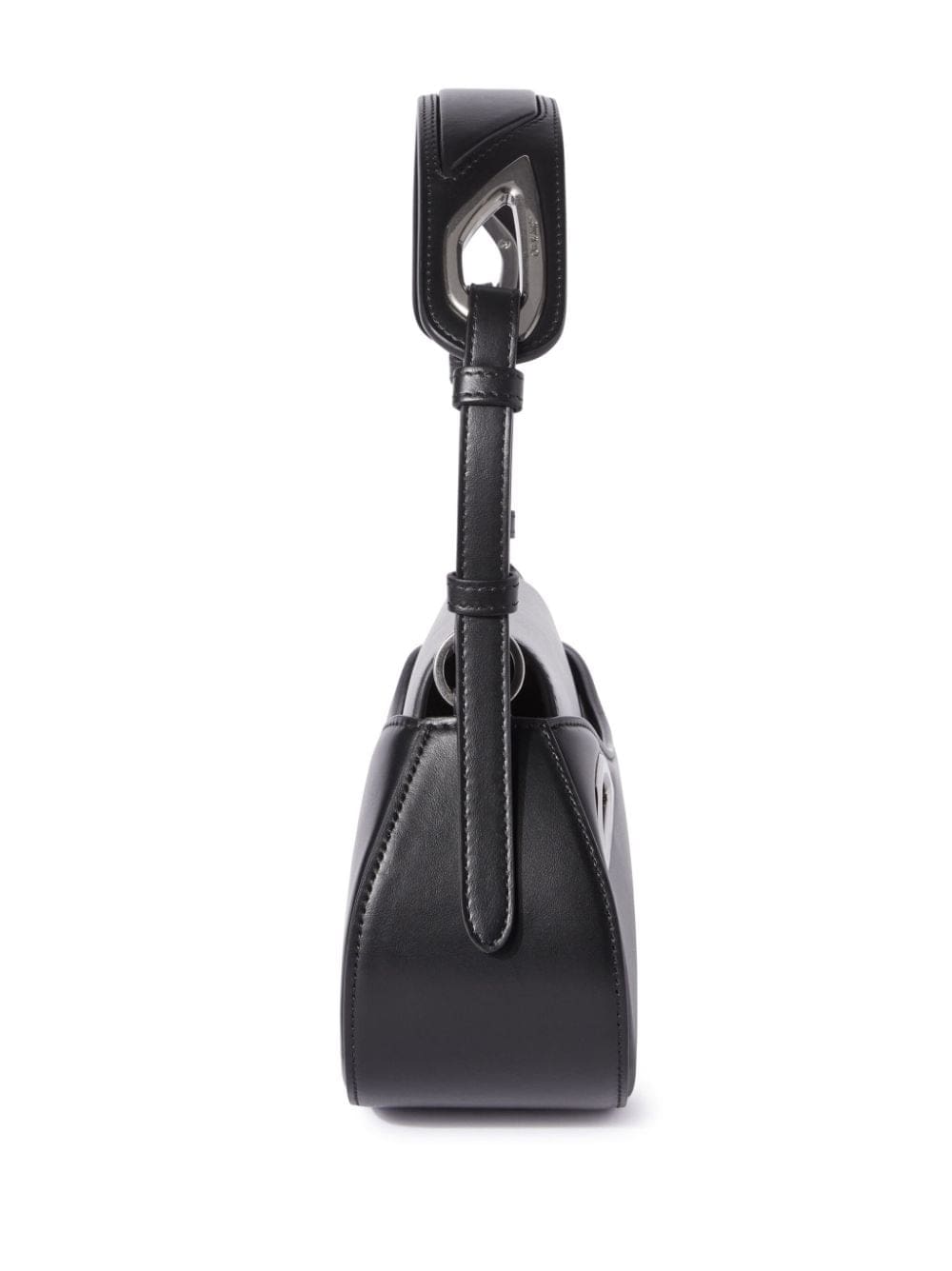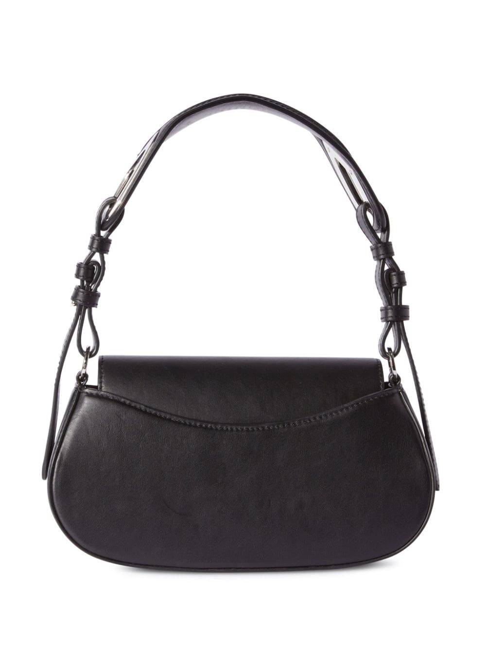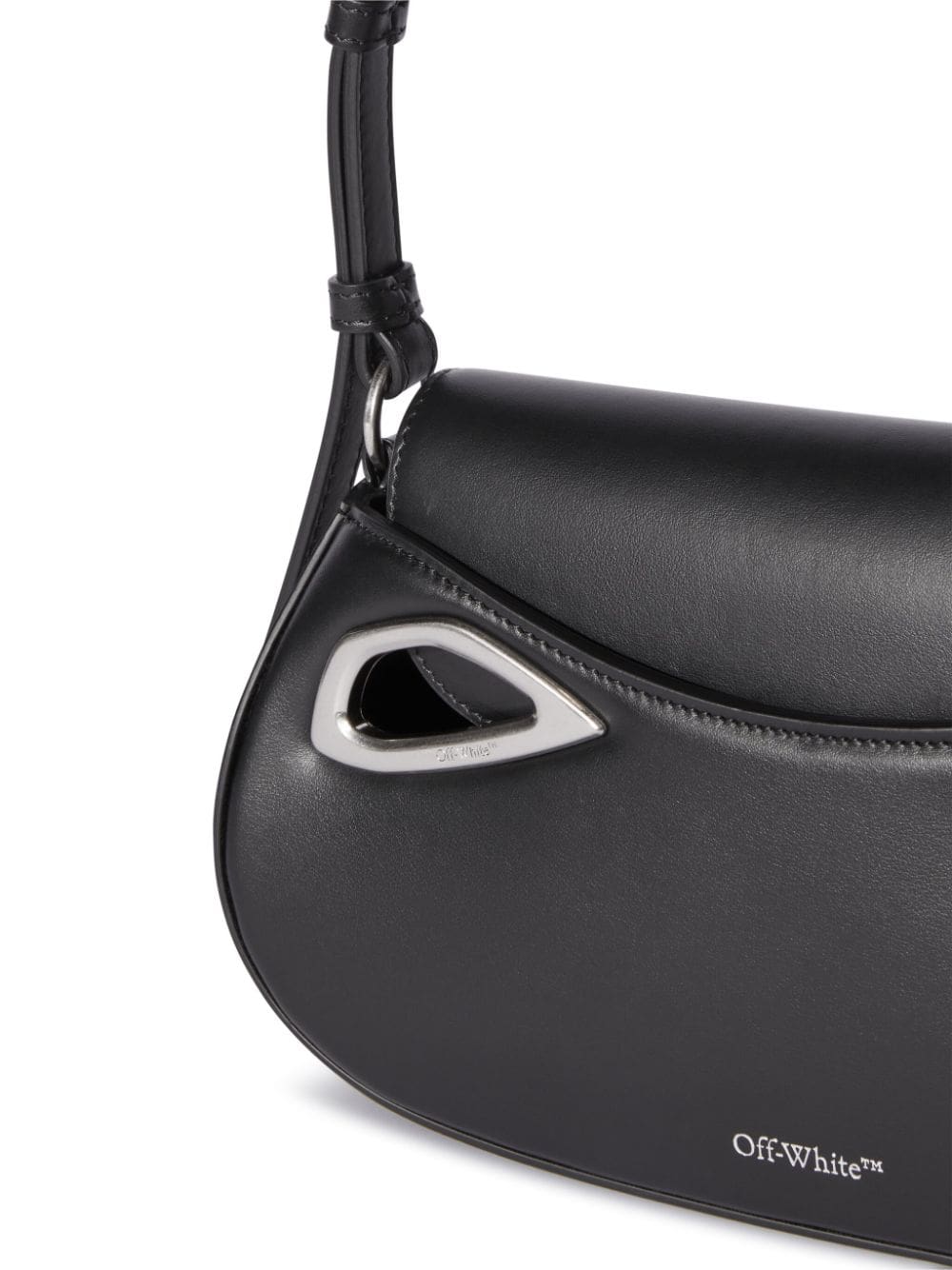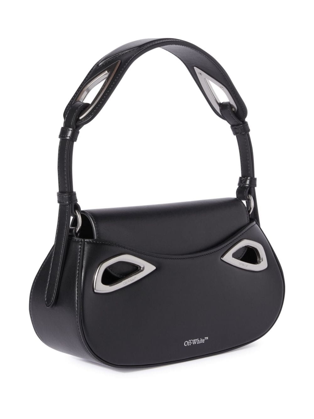 Off White's Clam shoulder bag is distinguished by the oval flap-fastening silhouette that gives it its name. Silver-tone metal edges and a cut-out shoulder strap act as sleek yet futuristic elements against the black leather construction.