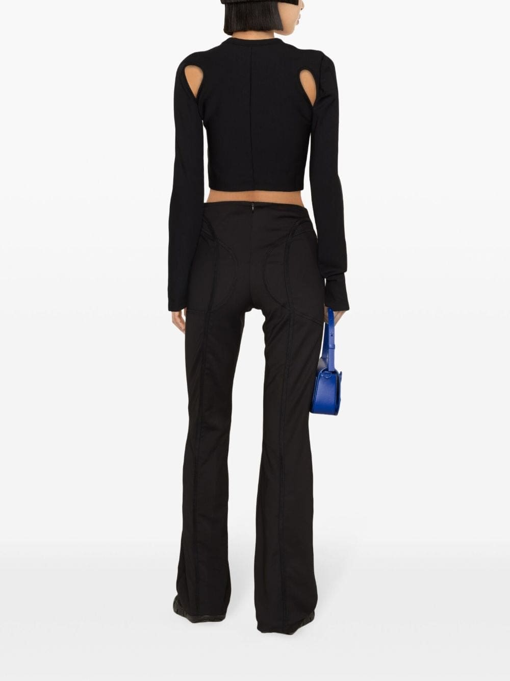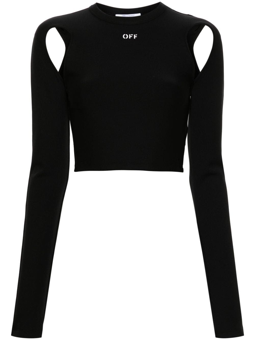 A futuristic fusion of fabric and form, this black Off-White top is made from scuba jersey to a cropped silhouette with cut-outs at the shoulders. The logo print at the chest is designed to look like it’s been stamped on.