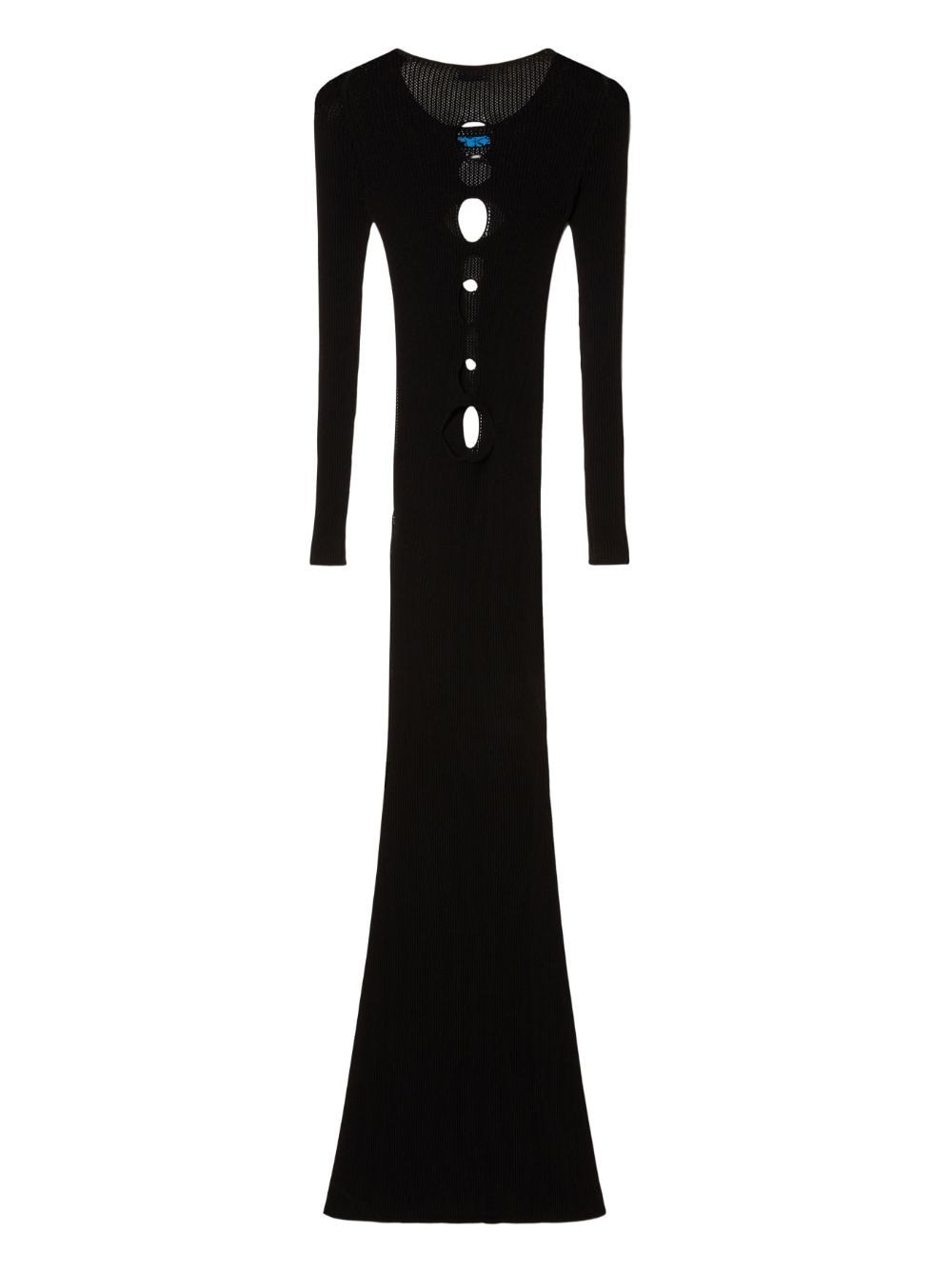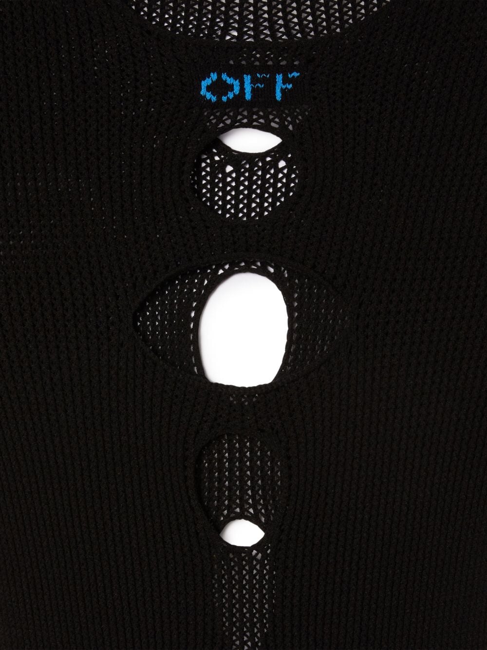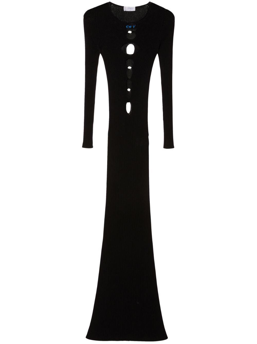 The simple silhouette of this black Off-White knitted dress is elevated by vertical cut-outs of varying shapes and sizes at the front and back. It features a ribbed design and is stitched with the label's logo lettering in blue threads at the neckline.