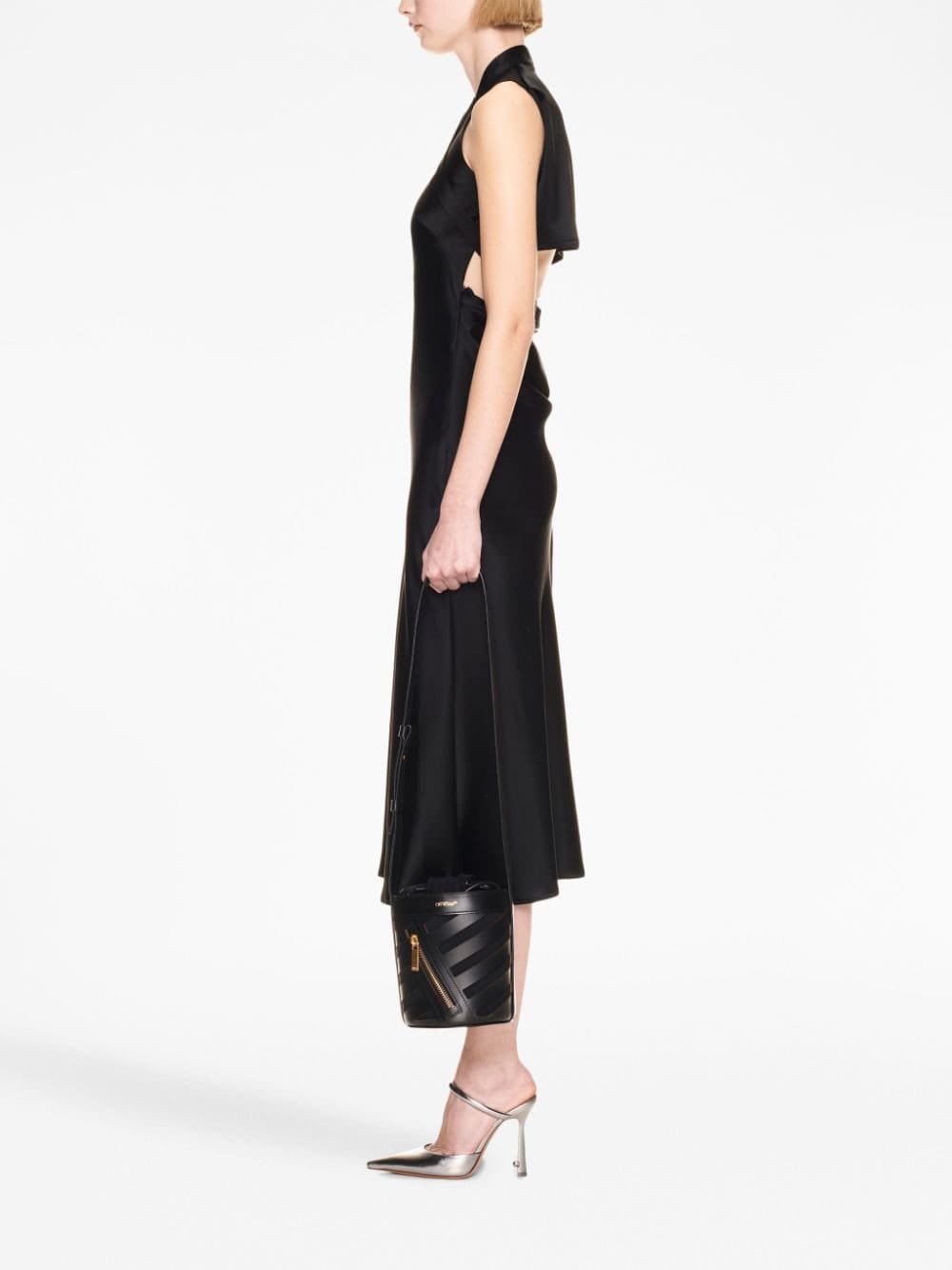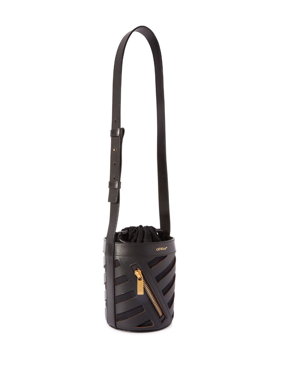 The Diag-print is one of Off-White's most celebrated motifs, appearing throughout the brand's collections. Here it adorns this leather bucket bag, complemented by gold-tone logo lettering for a distinctive finish.
