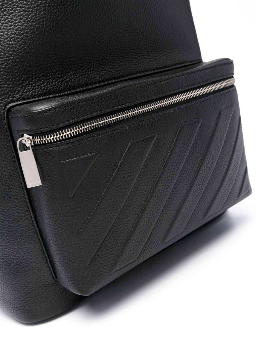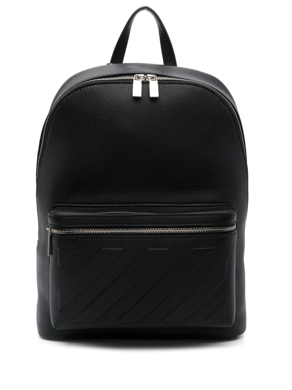 Off-White's famous Diag stripes take the focus of this black backpack from the brand's SS24 collection. The detail appears at the front, with a 3D effect, standing out from the rest of its black leather construction.