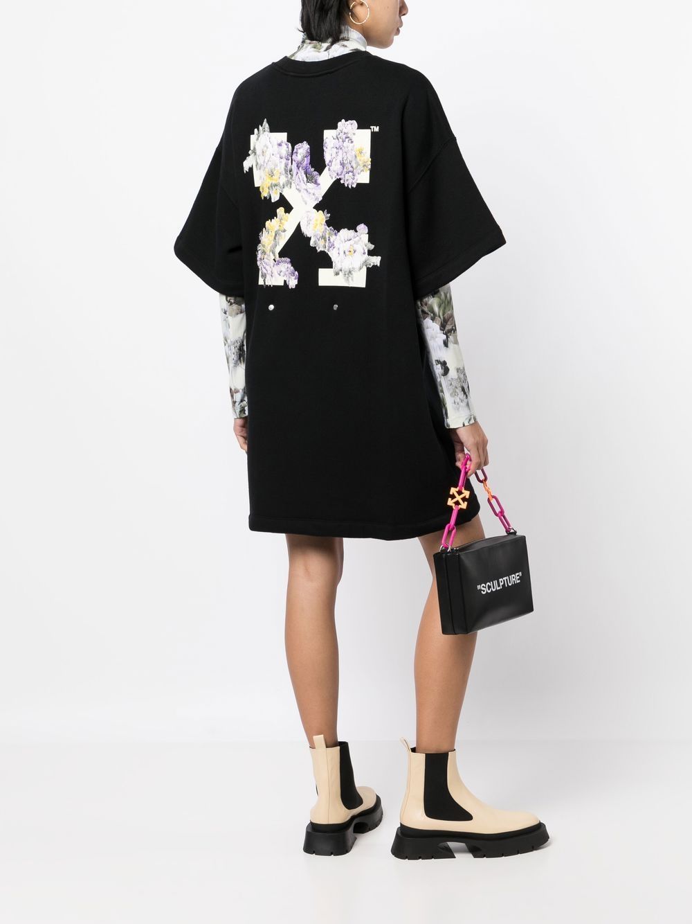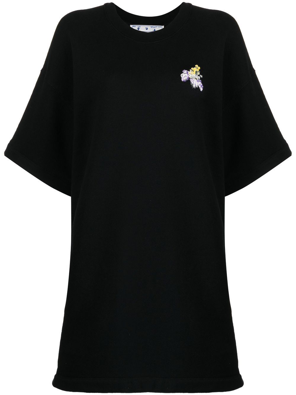 Off-White lends its streetwear aesthetic to the classic LBD. Showcasing a jersey construction, this relaxed style is finished with signature motifs including the brand's logo print and iconic arrows detail with floral embellishment that speaks to the label’s bold design approach.