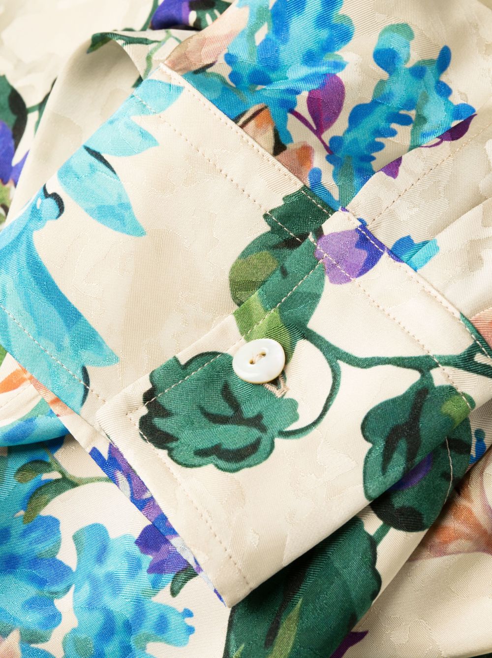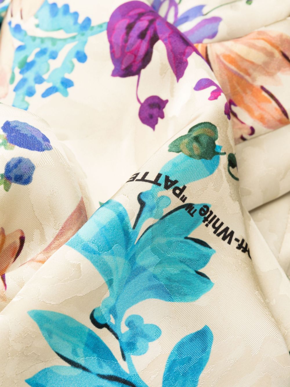 This shirtdress from Off-White is defined by its asymmetric silhouette and bold floral motif. The wrap-effect construction plays host to a draped panel and colourful blooms interspersed with black logo lettering.