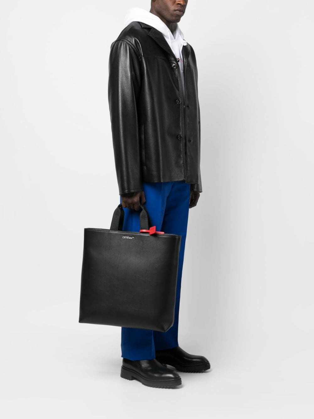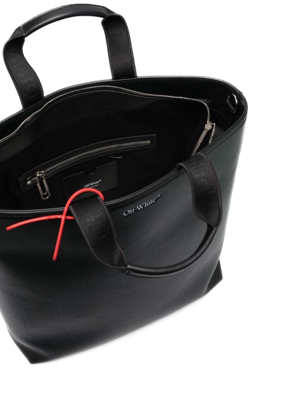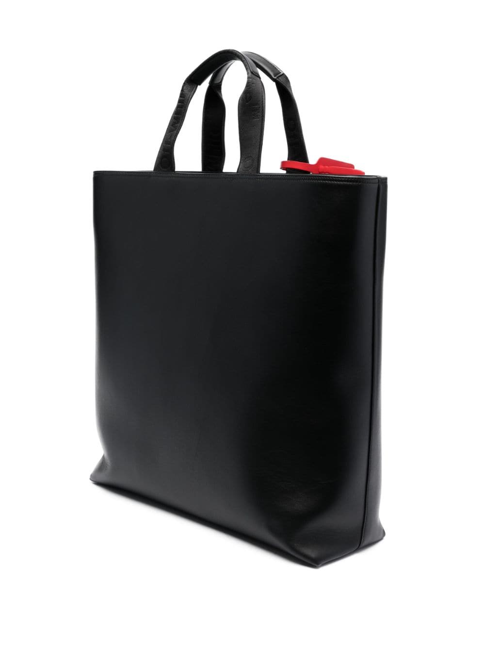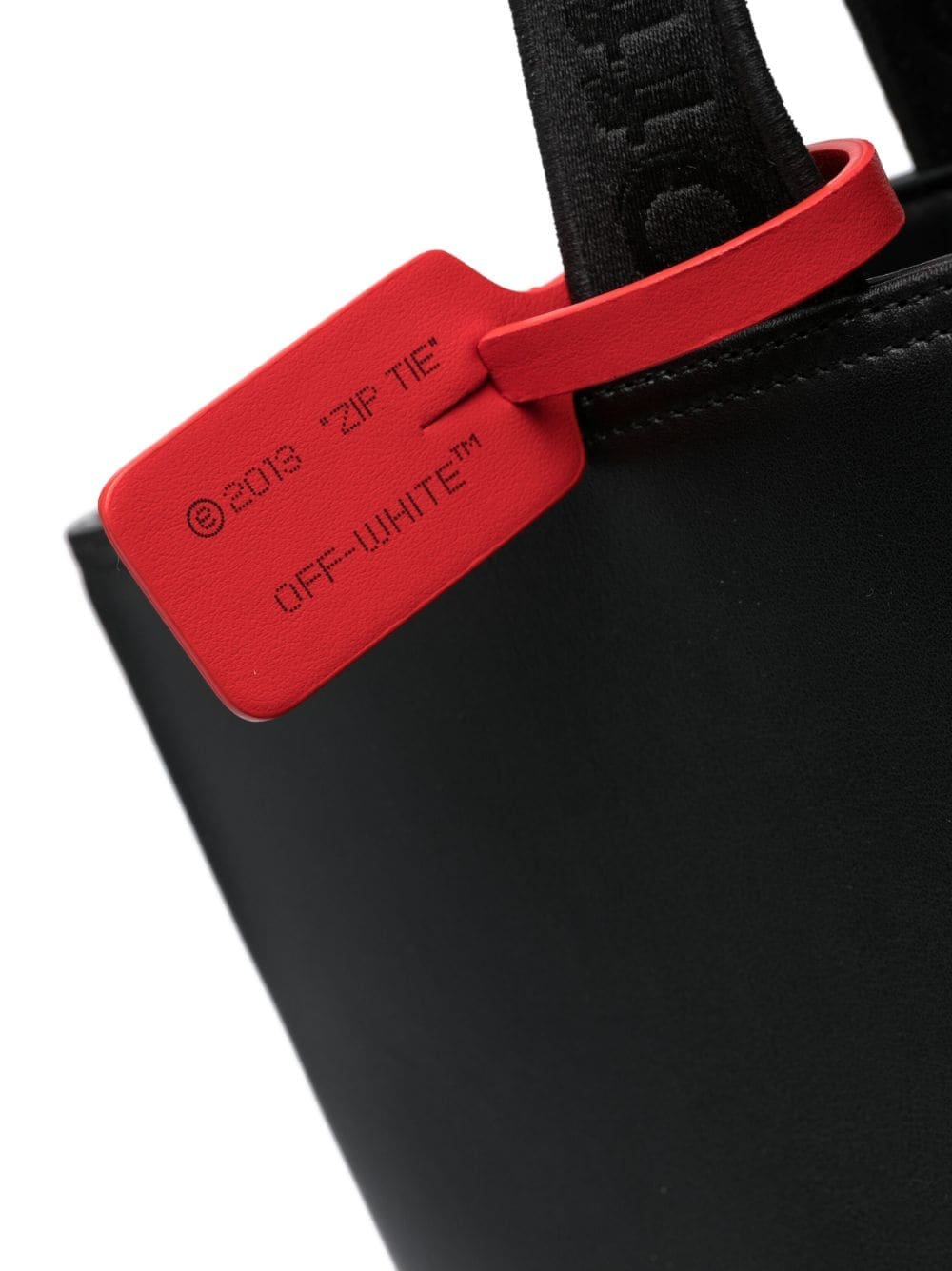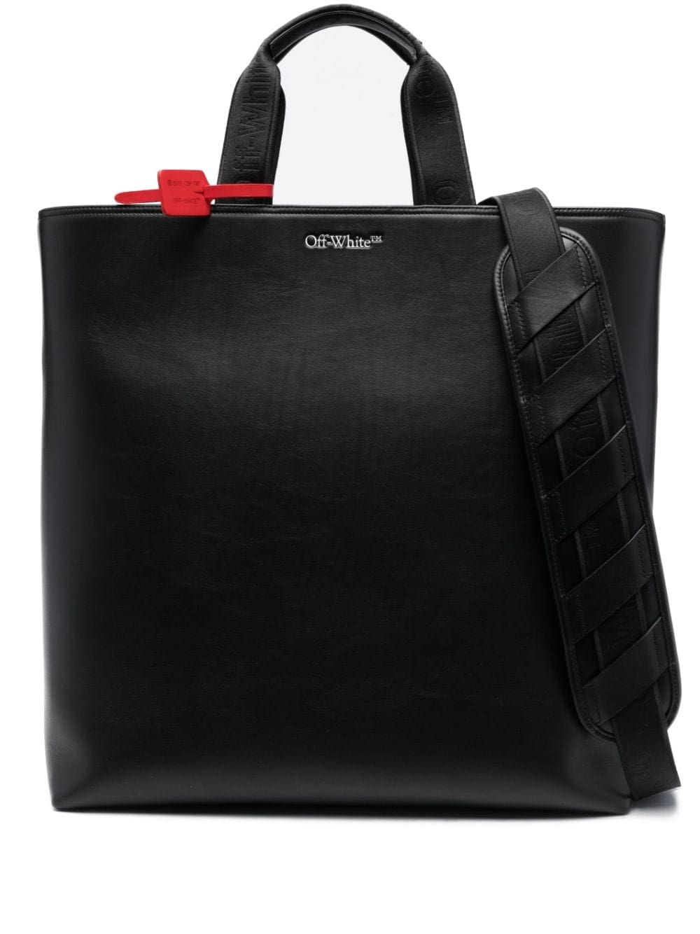 Channelling a sleek aesthetic, Off-White adorns this leather tote bag with a debossed iteration of the brand's iconic trademark logo to the front while the signature Zip Tie tag appears in a striking red hue to contrast against the black leather construction.