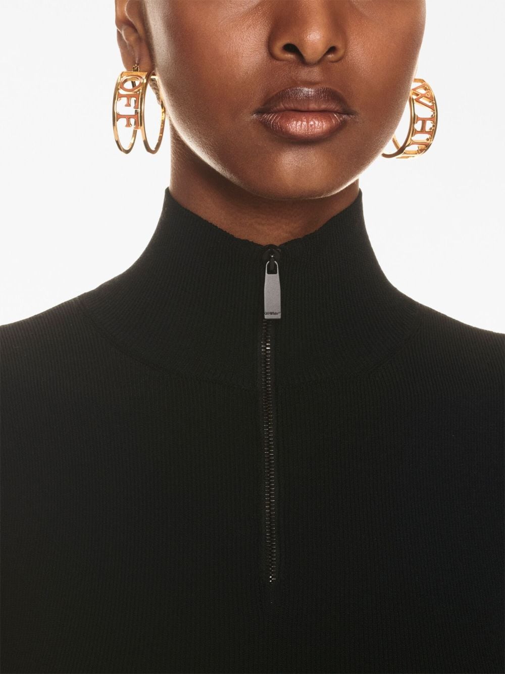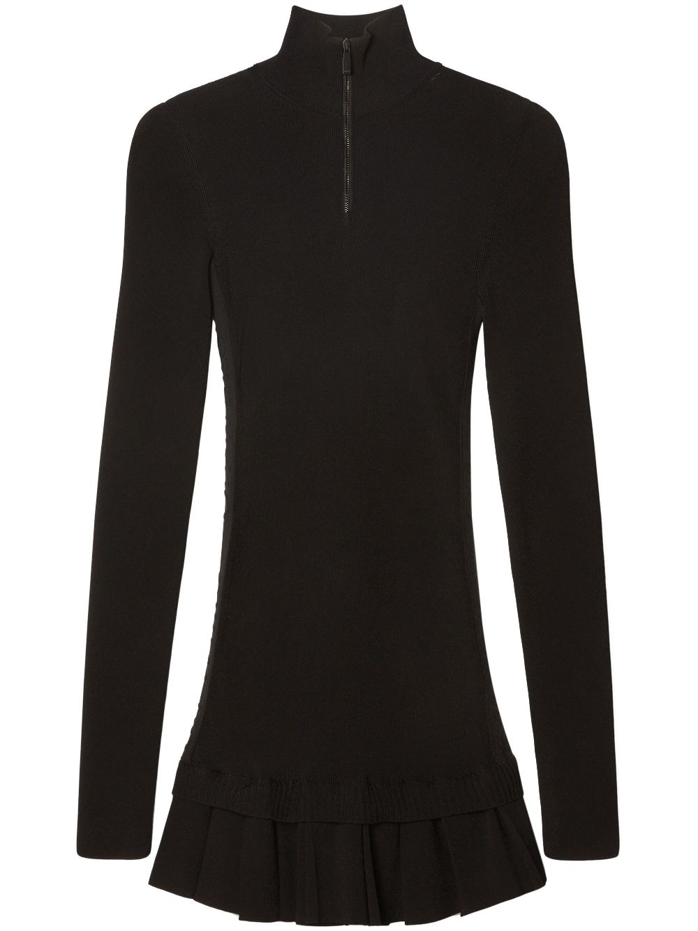 Presented in black, this minidress by Off-White boasts a fine-knit construction that opens to a narrow pleated skirt. Designed for a fitted silhouette, it features a high-neck and comes with a short front zip.