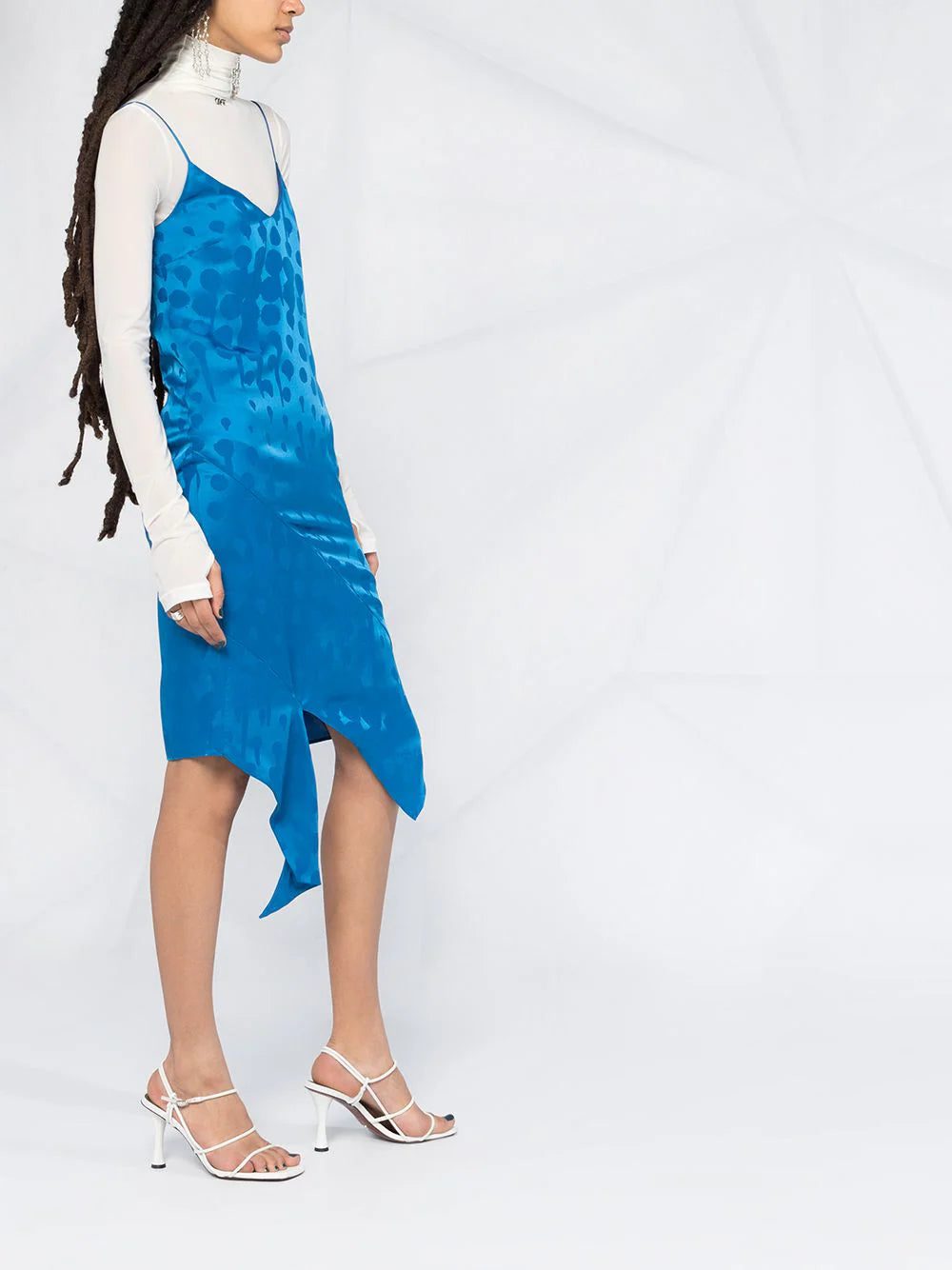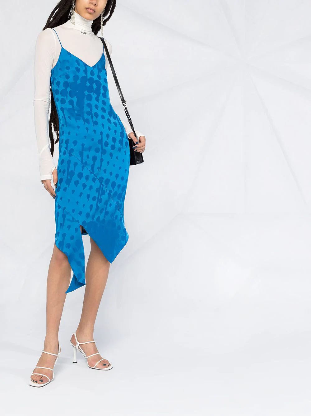 There's nothing easier than a slip dress for instant elegance. Slip on this cobalt blue jacquard-woven slip dress from Off-White to add pizzazz to your looks, whether you're going to the office or for evening drinks. Versatility is key. Featuring a sleeveless design, spaghetti straps, a v-neck, a rear zip fastening, a jacquard effect, an asymmetric hem and draped details.