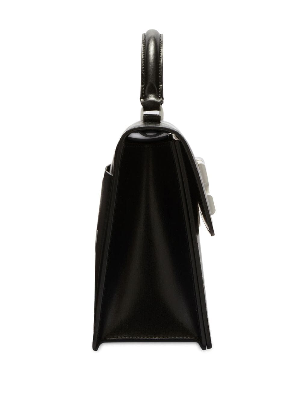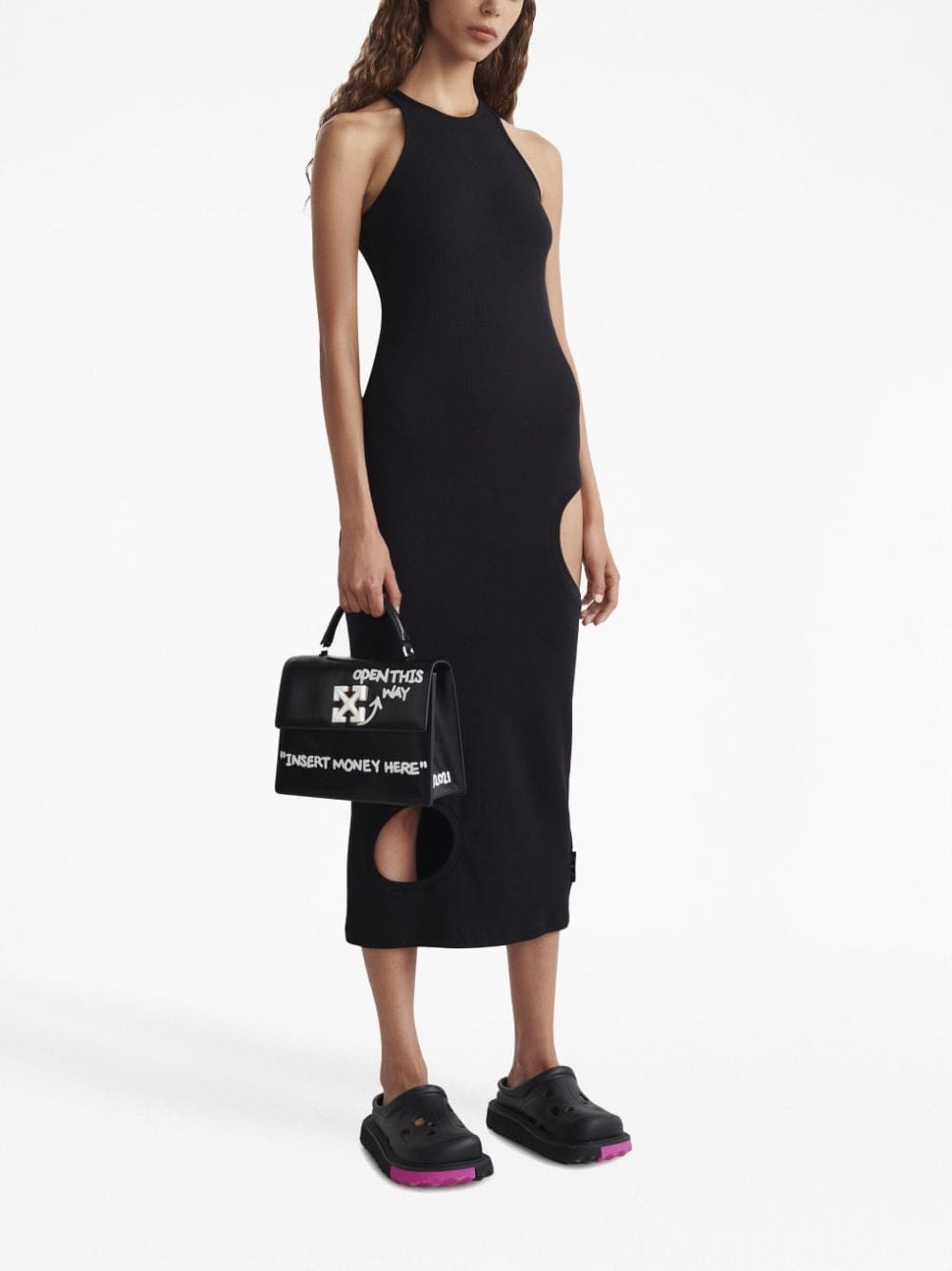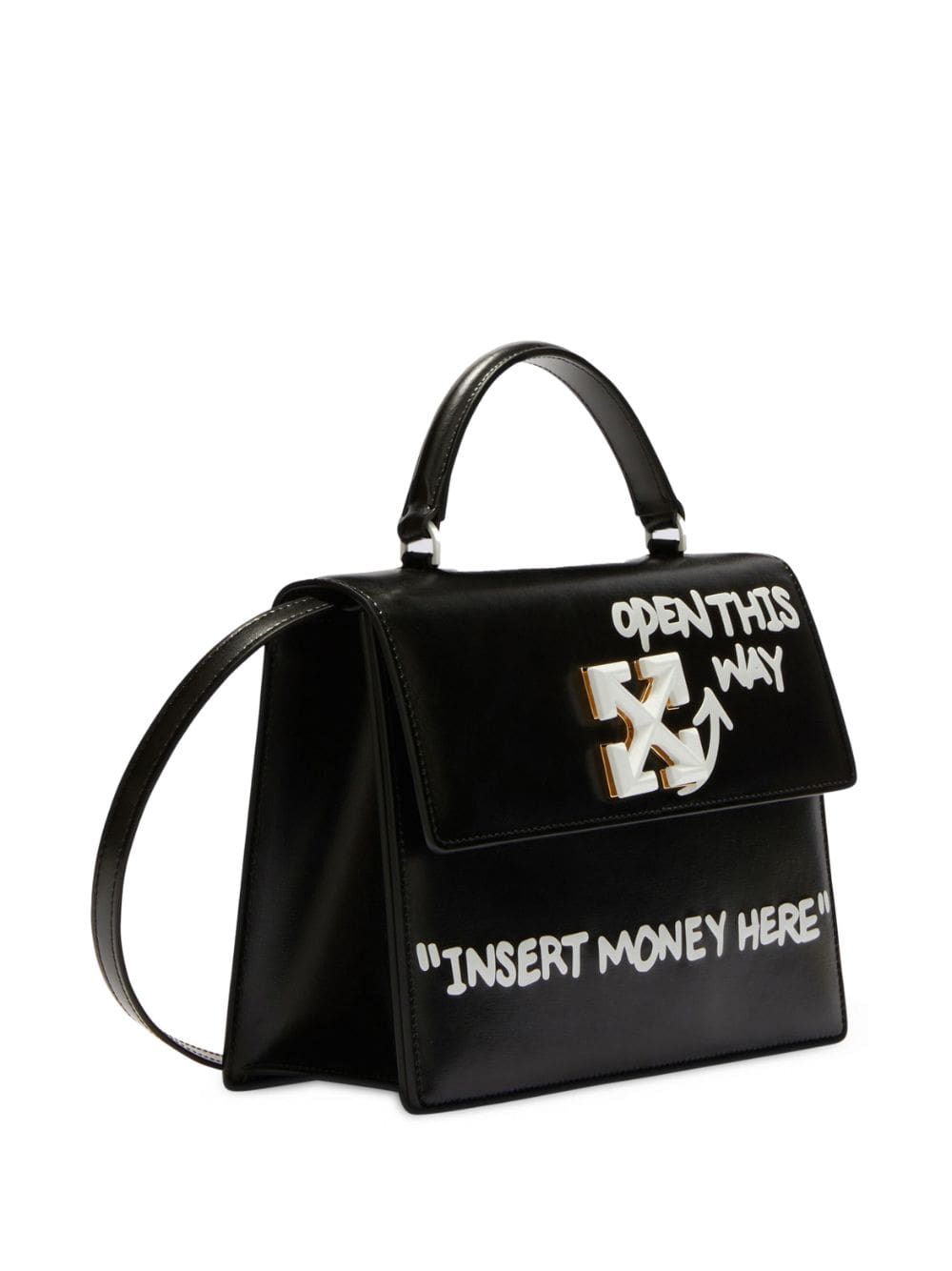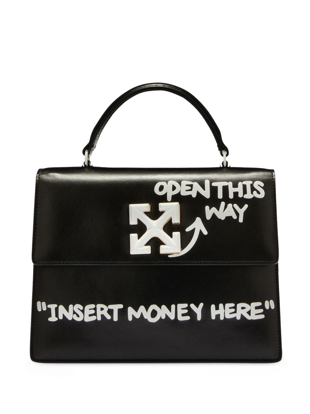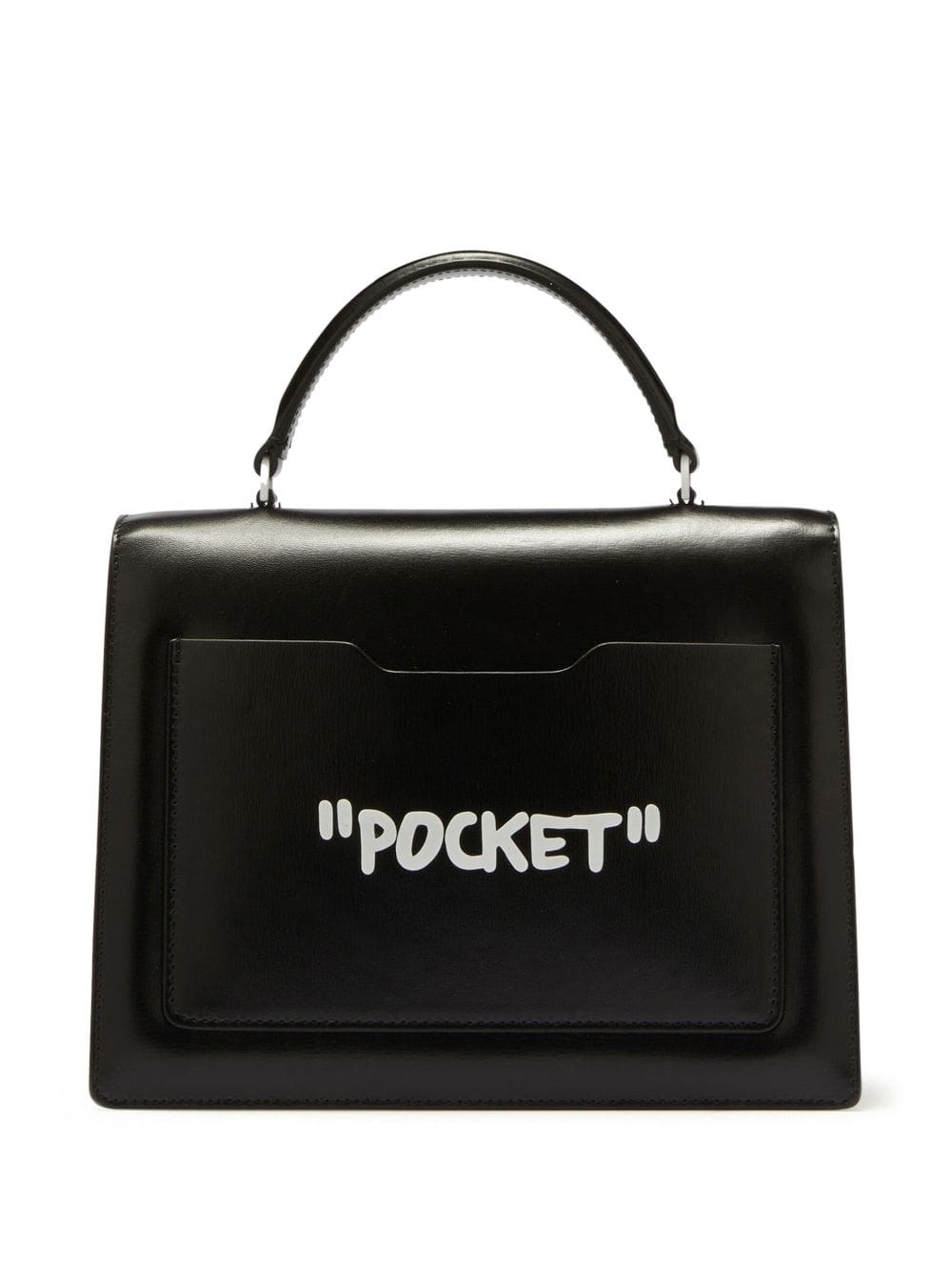 Off-White doesn't hesitate to proudly showcase its branding on creations. For this SS23 black top-handle bag, the label places the contrasting white Arrows logo to the front flap, along with playful slogan prints for a humorous finish.