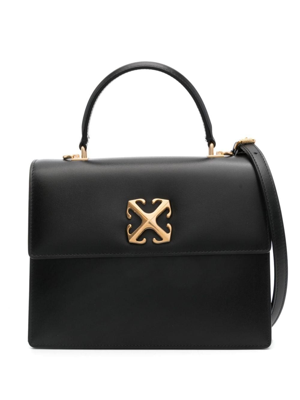 Off-White's signature Jitney bag appears here in buttery-smooth black leather, complimented by gold-tone accents. The iconic Arrows logo — a ubiquitous motif inspired by airport signage, takes the central focus at the front of the accessory.