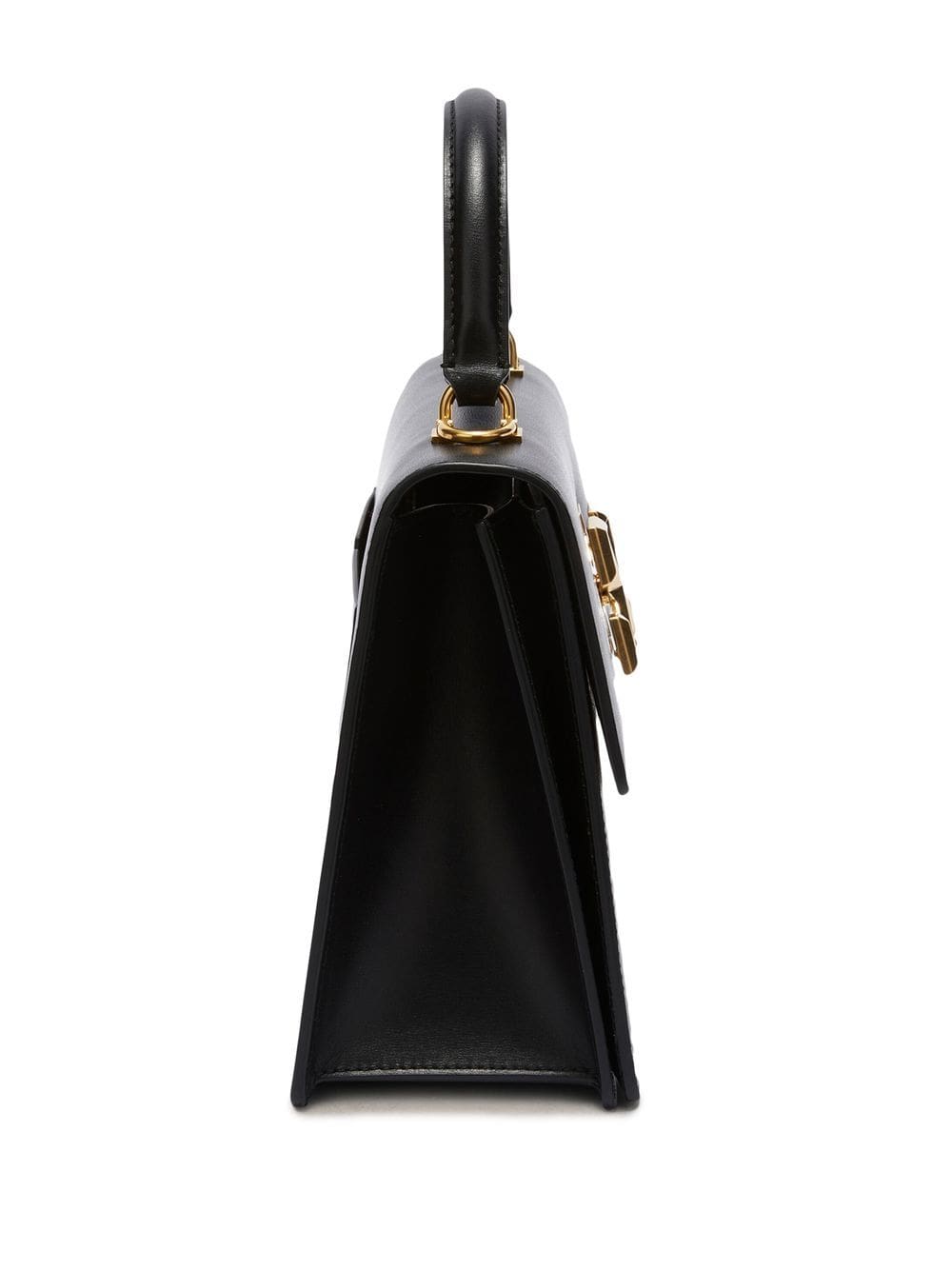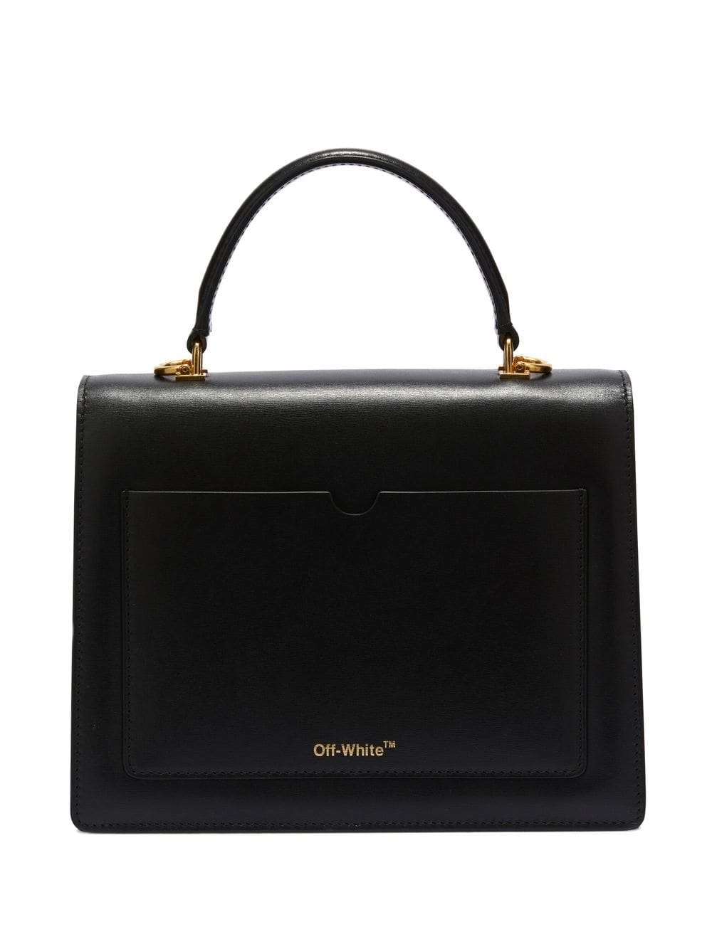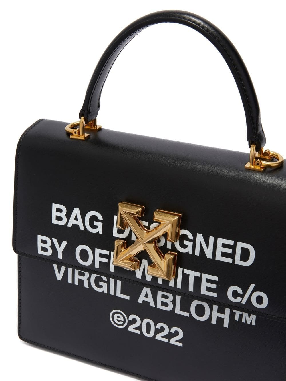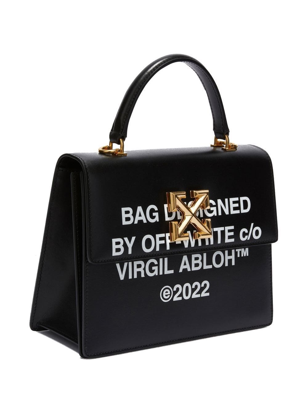 black/white lambskin gold-tone logo plaque slogan print to the front single rounded top handle foldover top internal card slot internal zip-fastening pocket