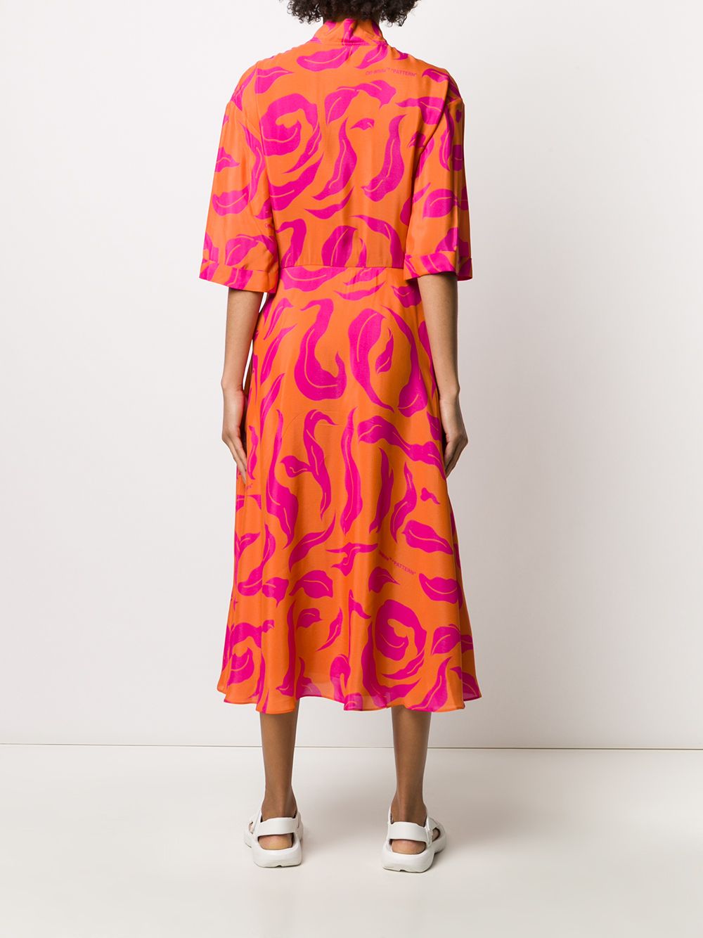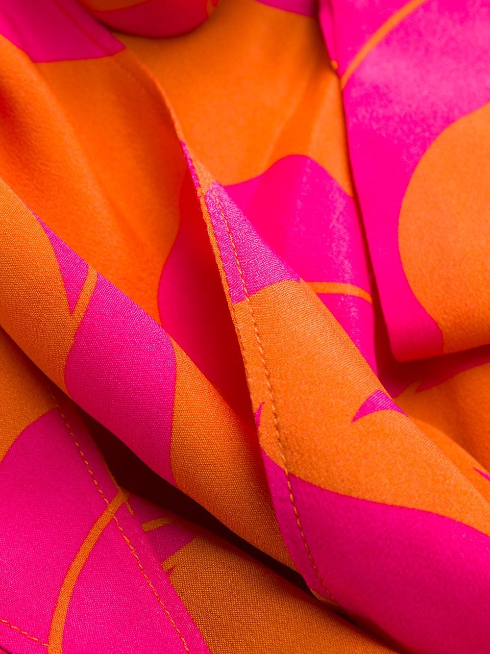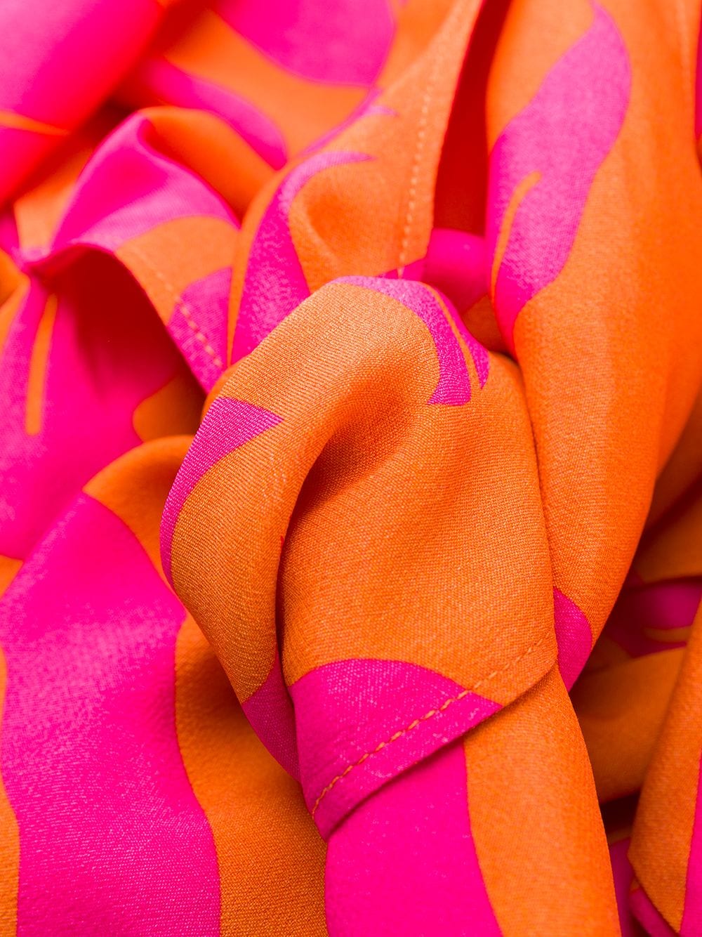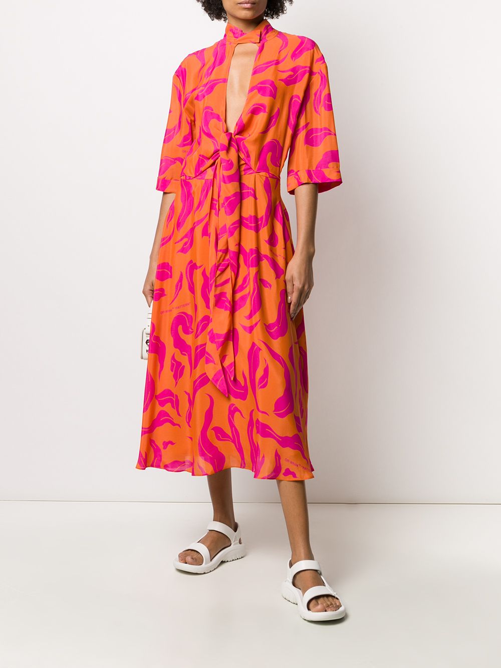 Much like Off-White, you're not one to blend into the background. That's what makes this orange and fuchsia pink leaf print plunge dress from Off-White so appealing. Tropical vibes. Featuring a stand-up collar, a plunge style, a tie fastening, half sleeves and a mid-calf length.
