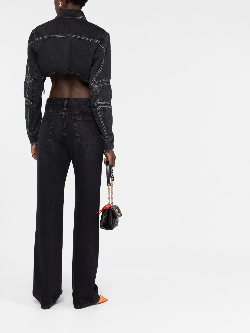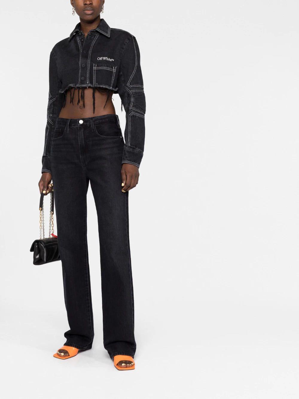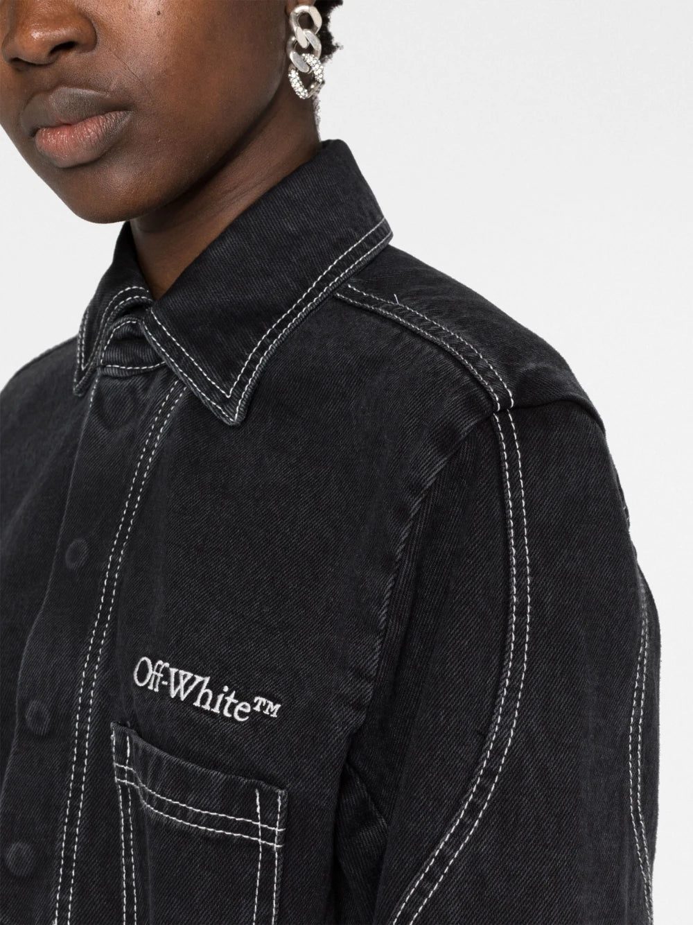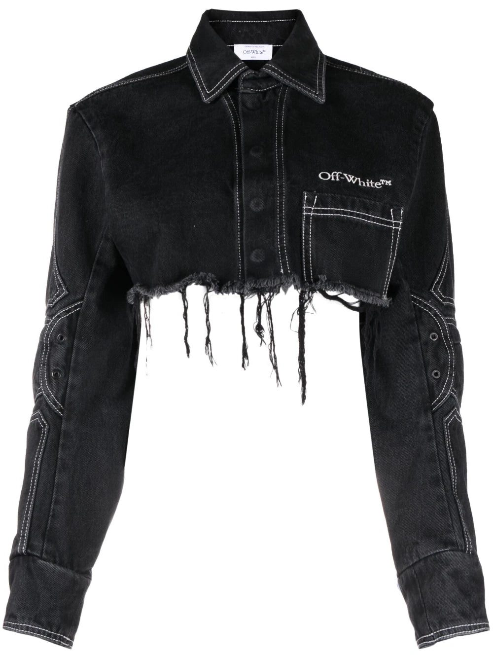 Crafted in a black denim fabrication, this Off-White jacket exhibits the brand's contemporary aesthetic. The design is defined by pits cropped silhouette and distressed finish while contrast stitching and logo embroidery at the chest combine for a tasteful finish.