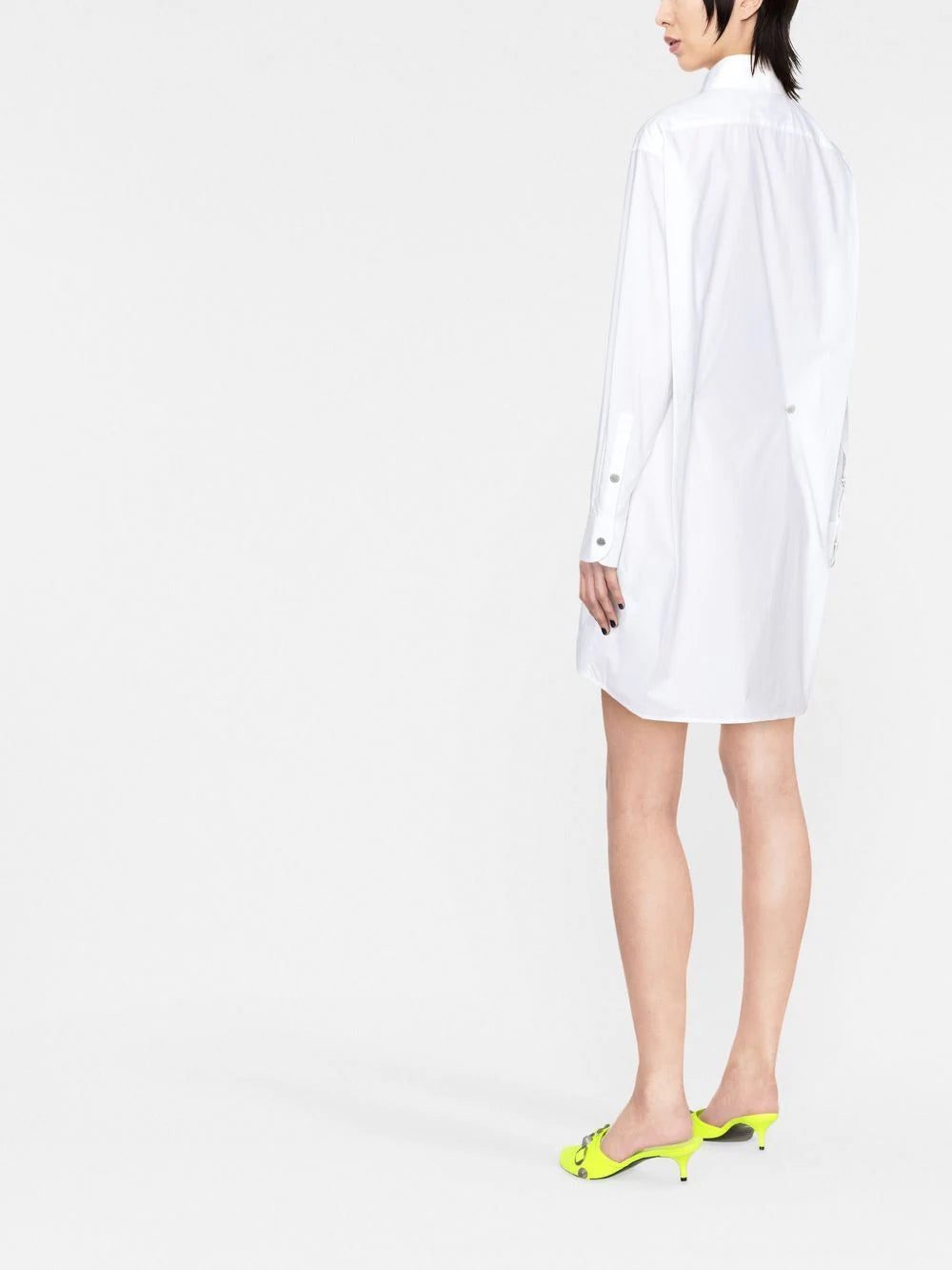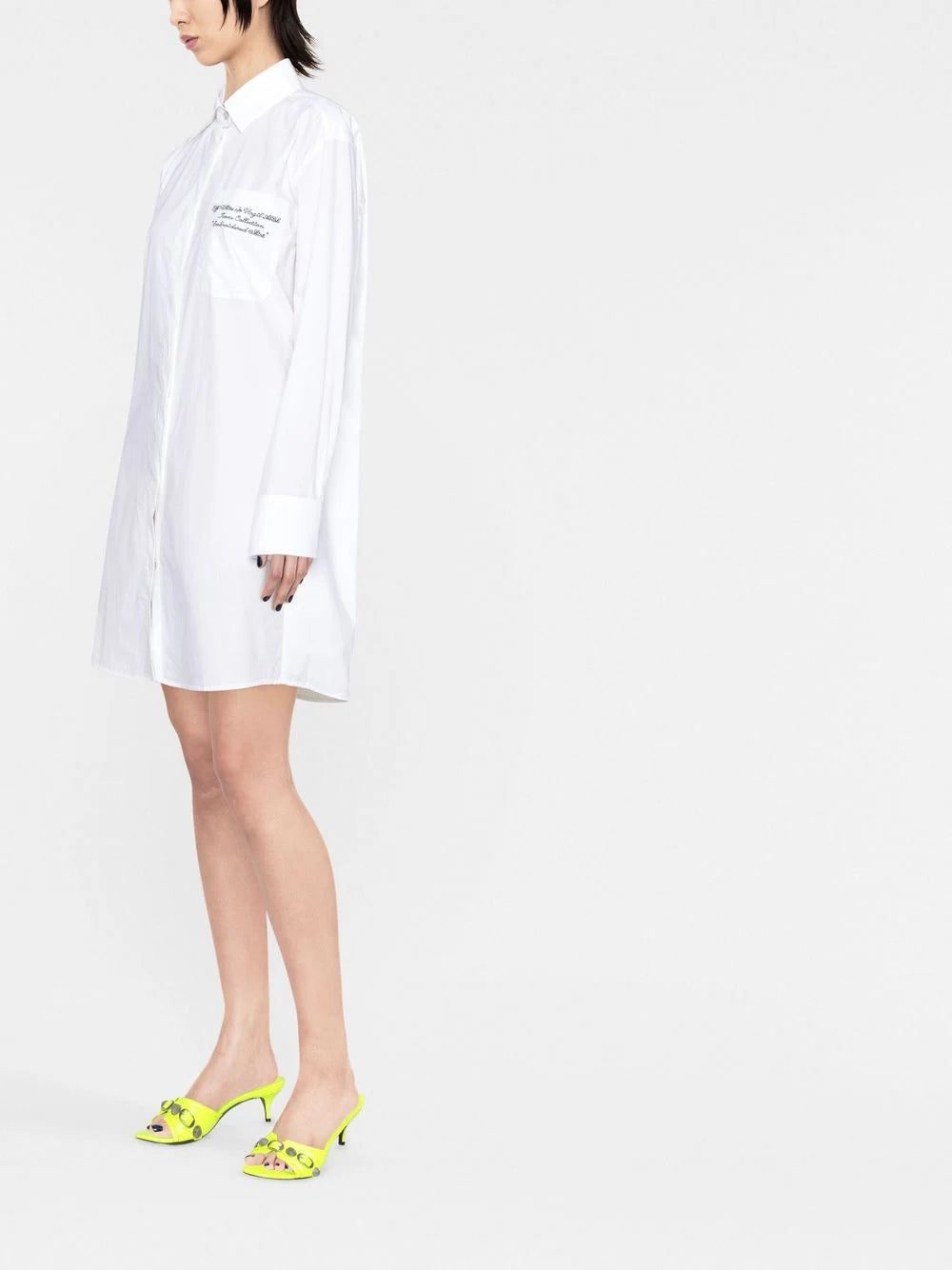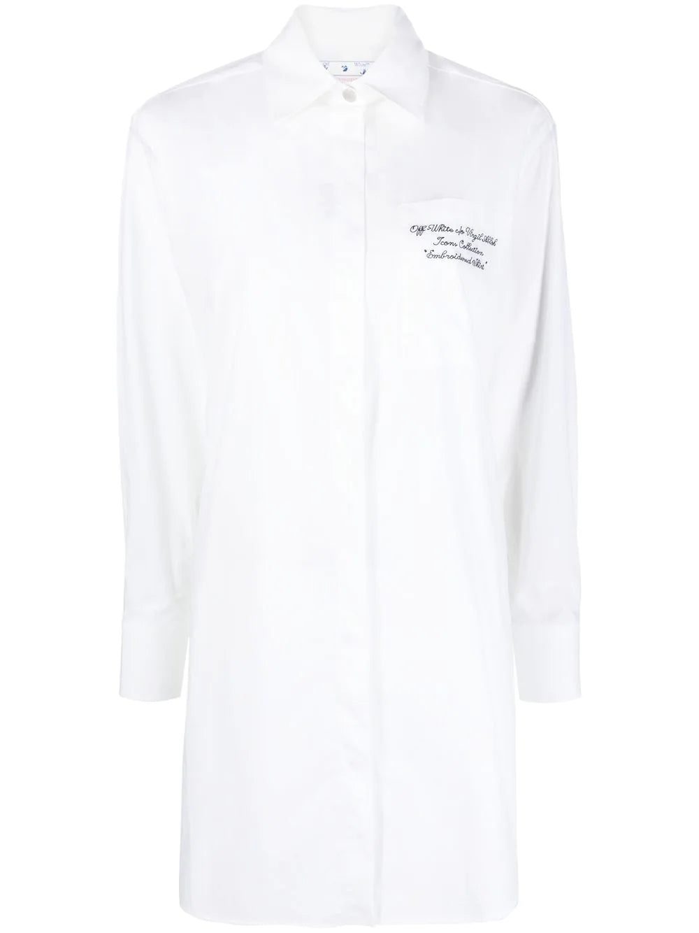 logo-embroidered shirt dress from OFF-WHITE featuring white, cotton, long sleeves, classic collar, embroidered logo at the chest, chest patch pocket and concealed front button fastening.