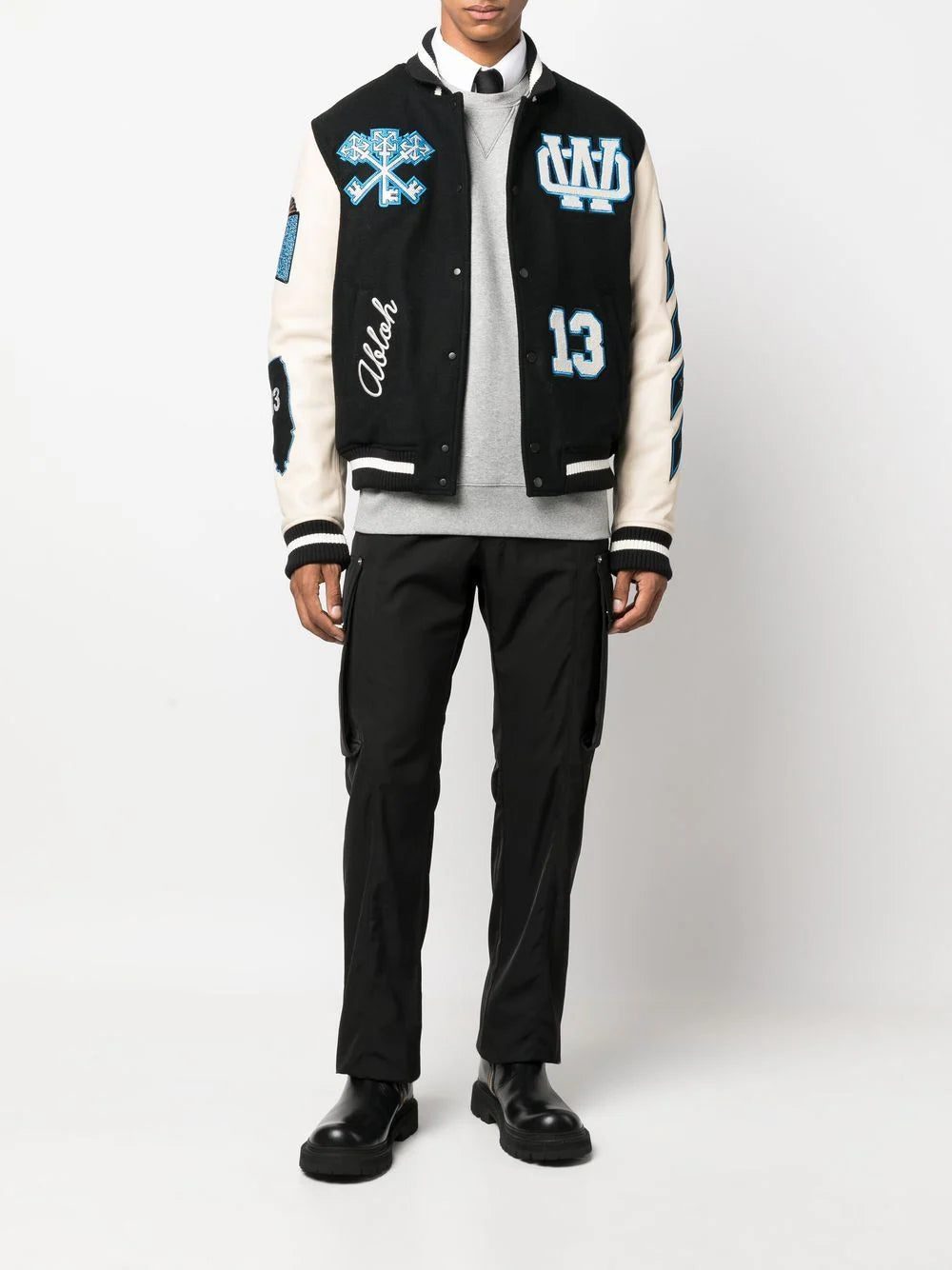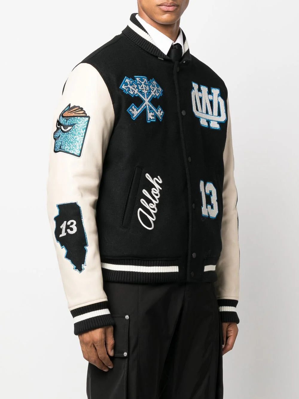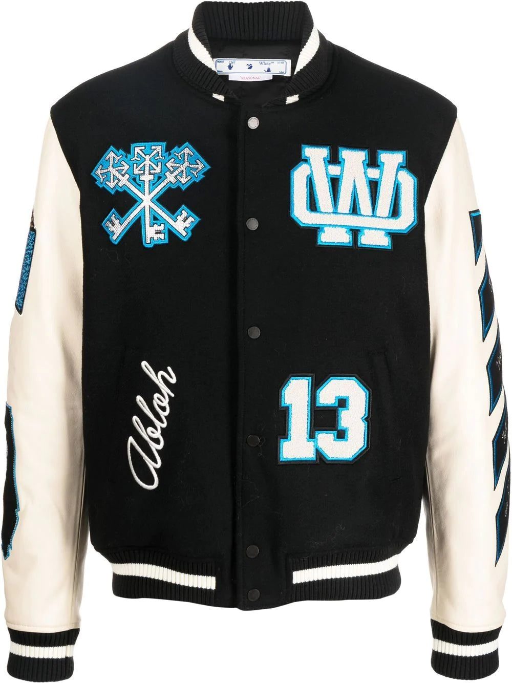 Off-White is known for adding a streetwear aesthetic to classic silhouettes. This is evidenced in this collegiate-inspired varsity jacket, which is adorned with multiple logo patches throughout, showcasing the label's branding-focused style.