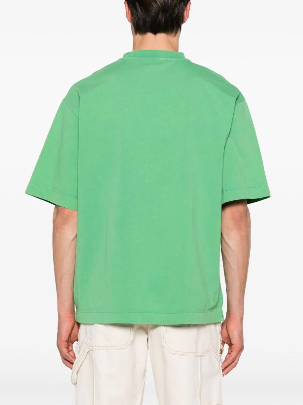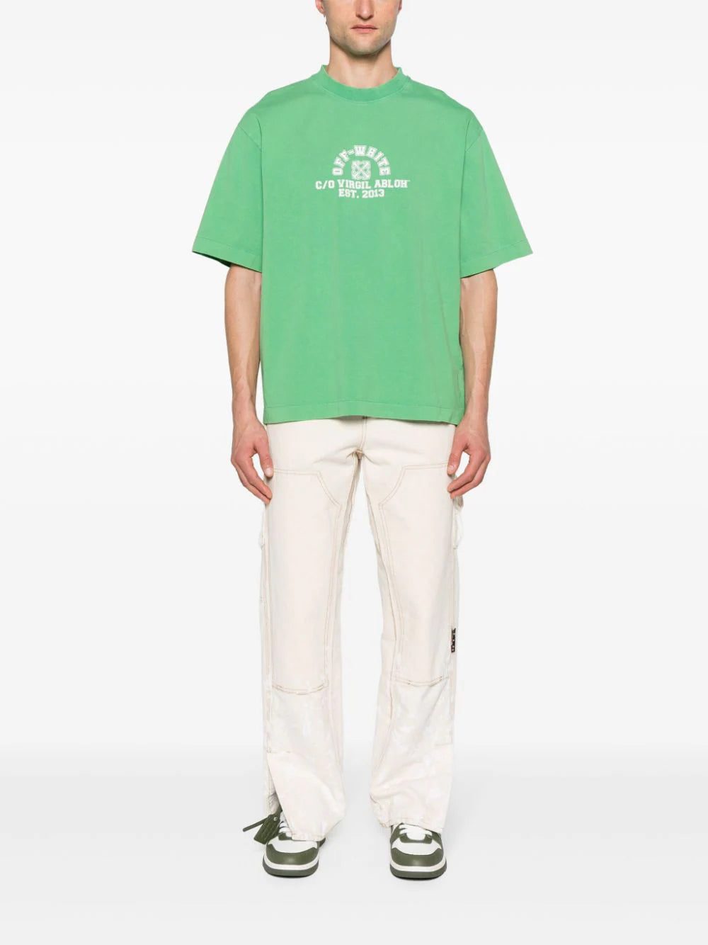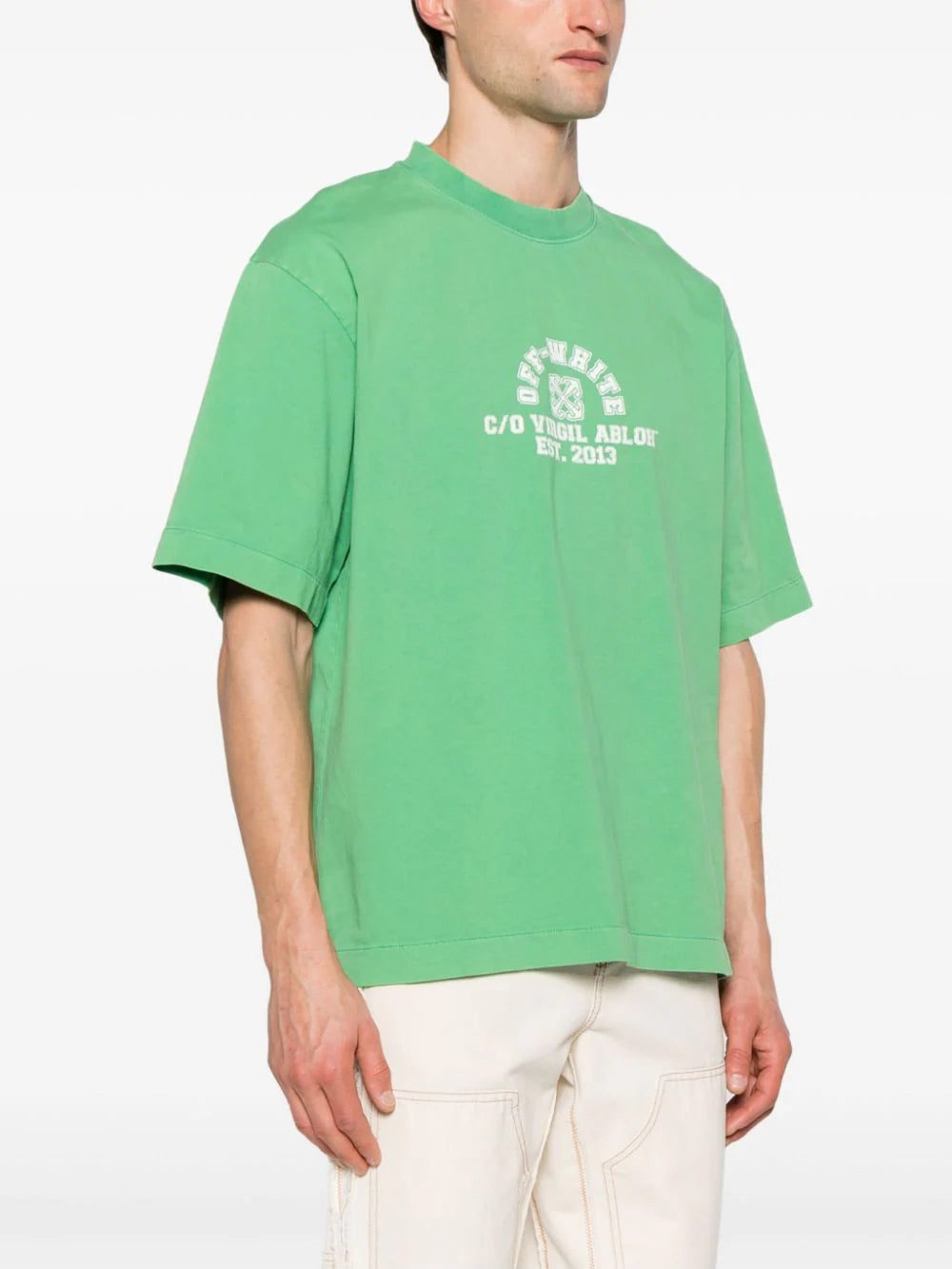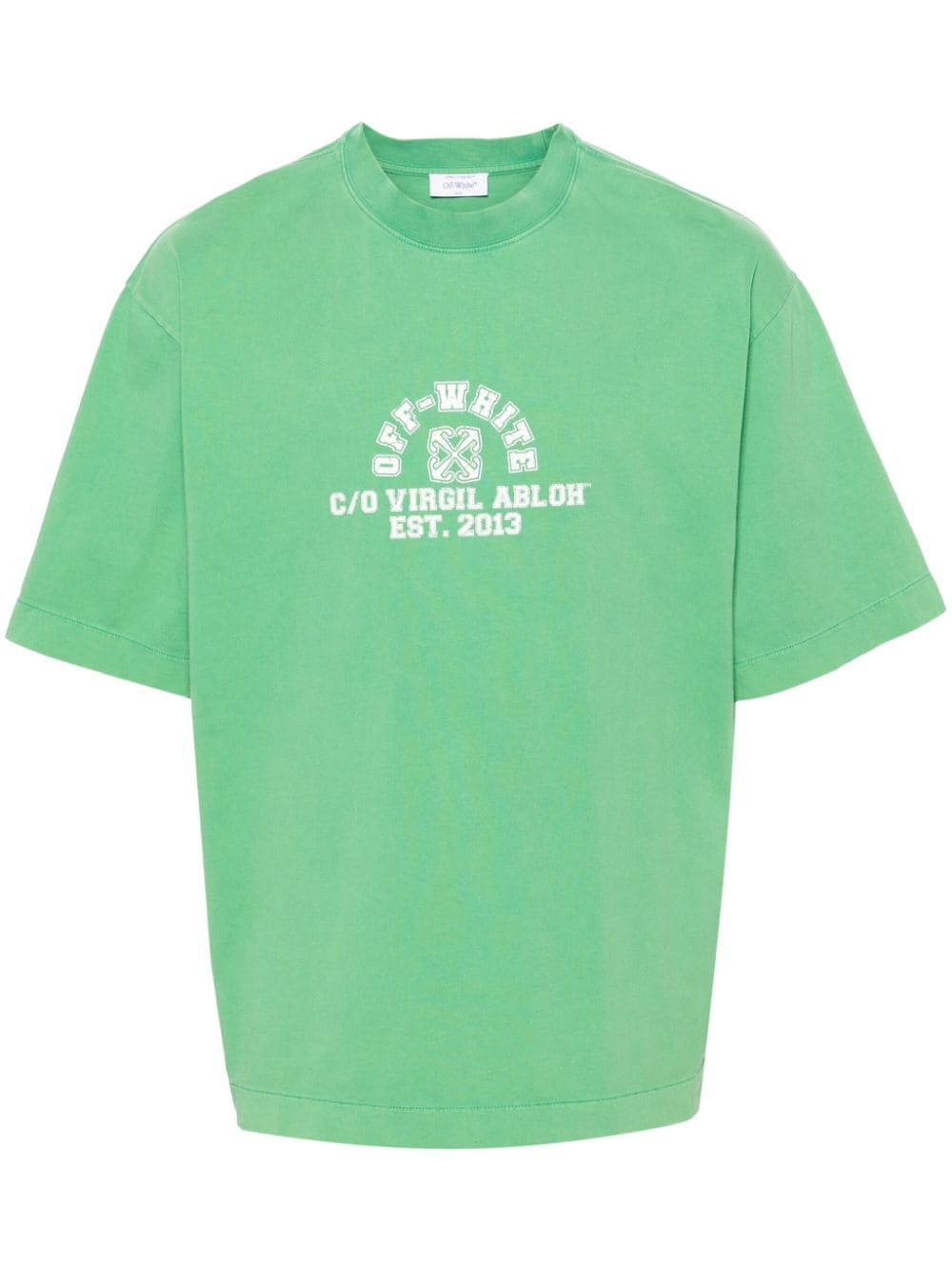 This green Off-White T-shirt is cut from washed cotton jersey and stamped with a faded logo at the chest that’s modelled after collegiate sports kits.