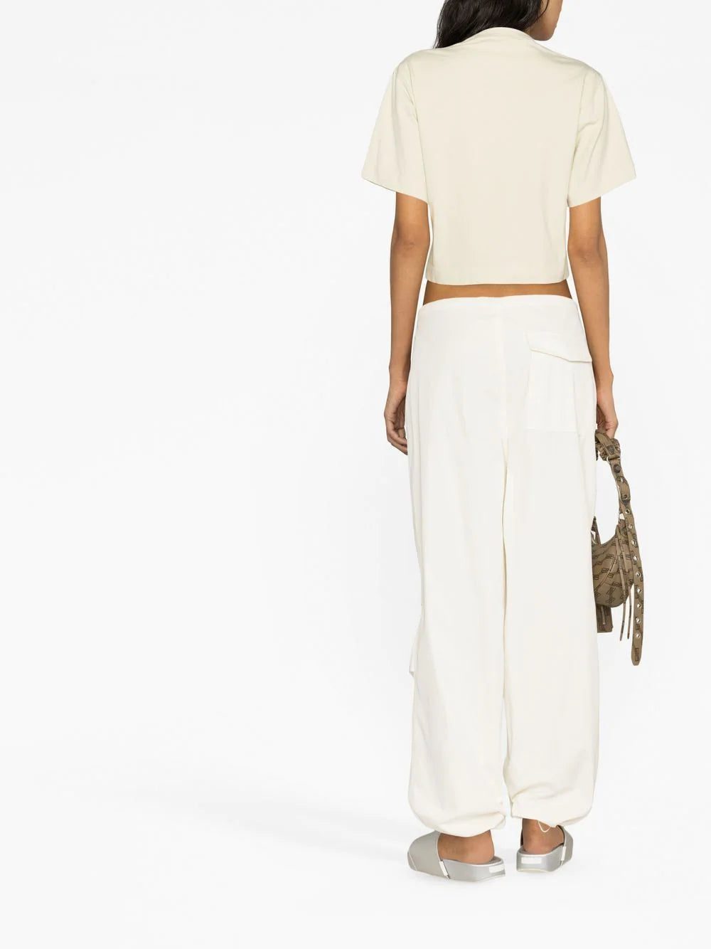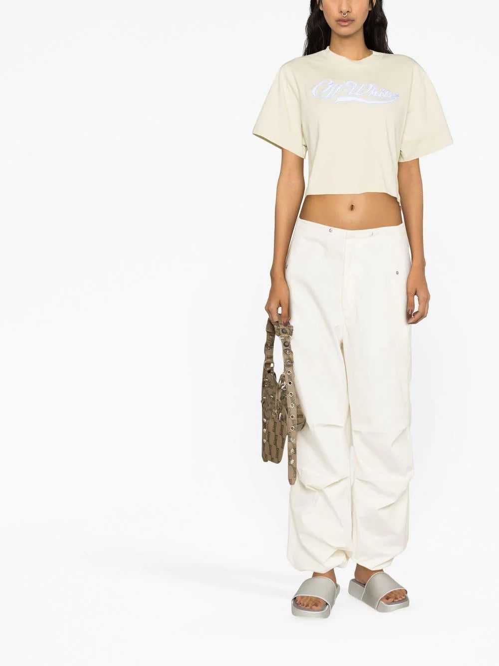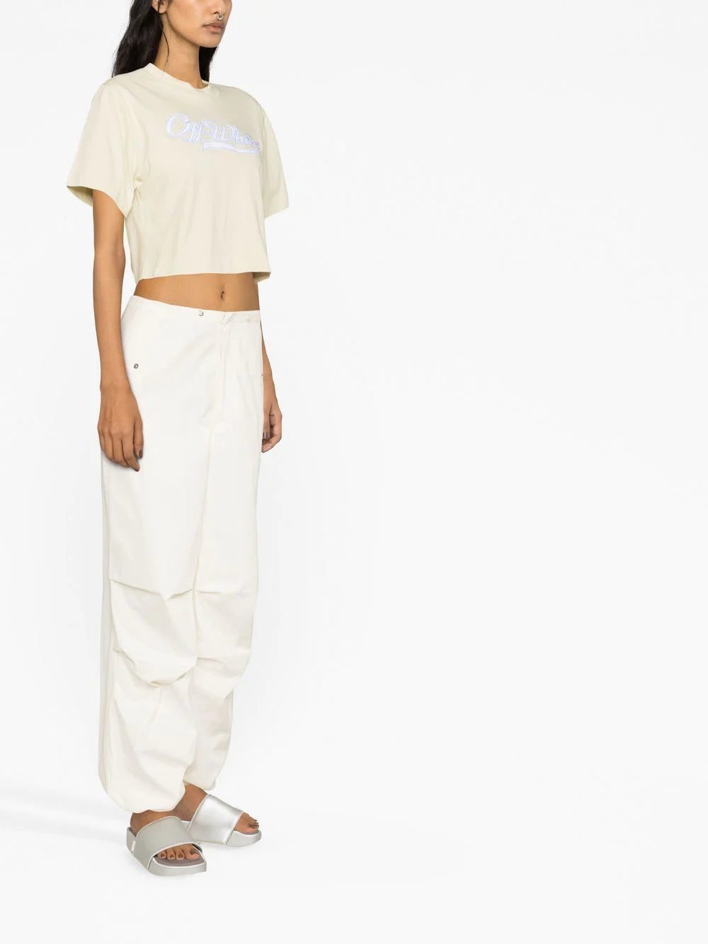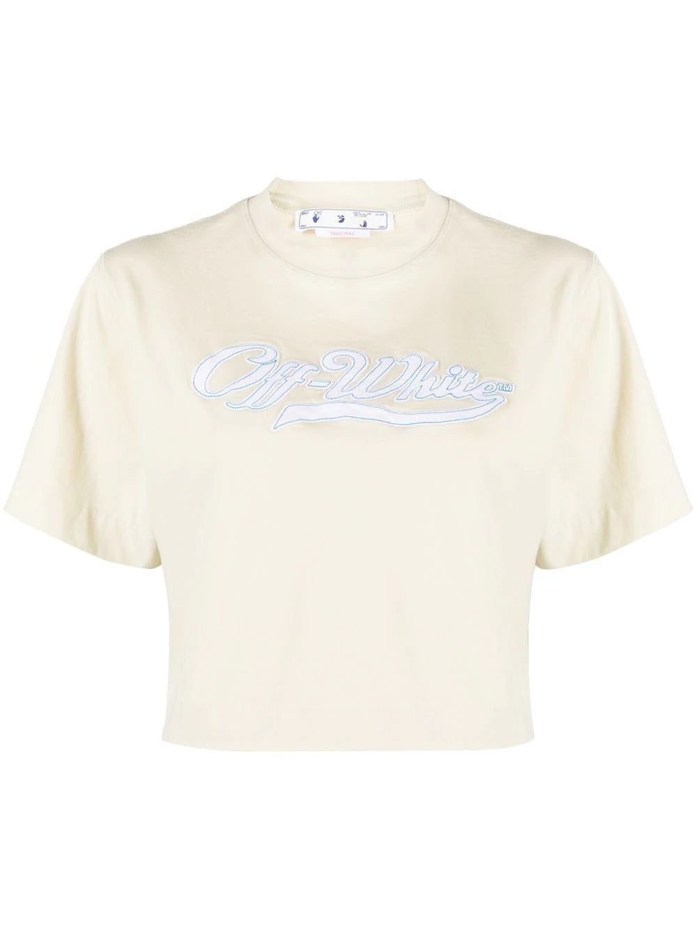 logo-print cropped T-shirt from OFF-WHITE featuring light beige, cotton blend, logo print to the front, crew neck, short sleeves, wide sleeves, straight hem and cropped.