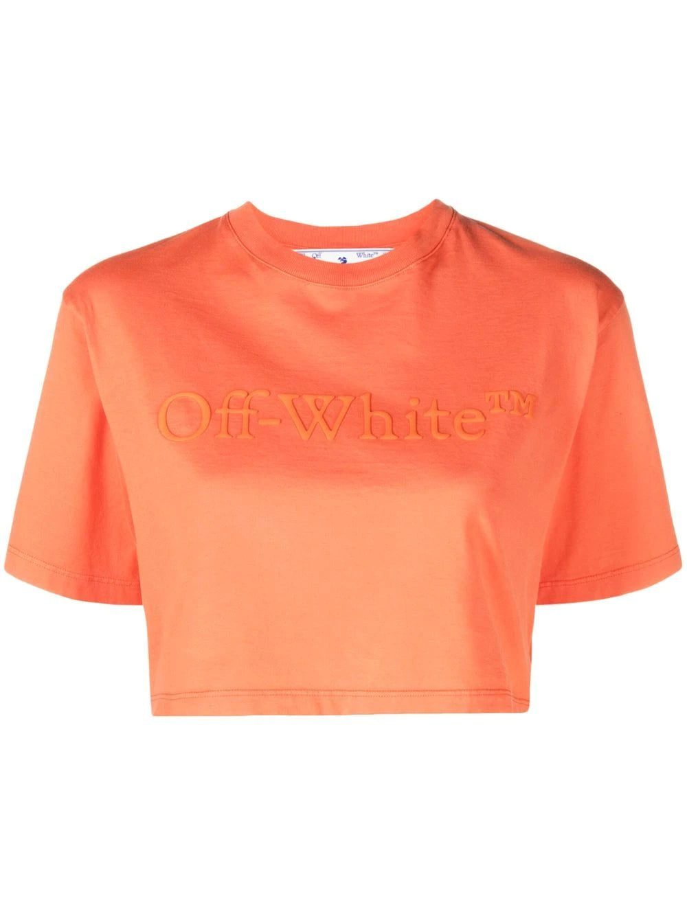 logo-print cropped T-shirt from OFF-WHITE featuring orange, cotton, logo print to the front, crew neck, short sleeves and cropped.