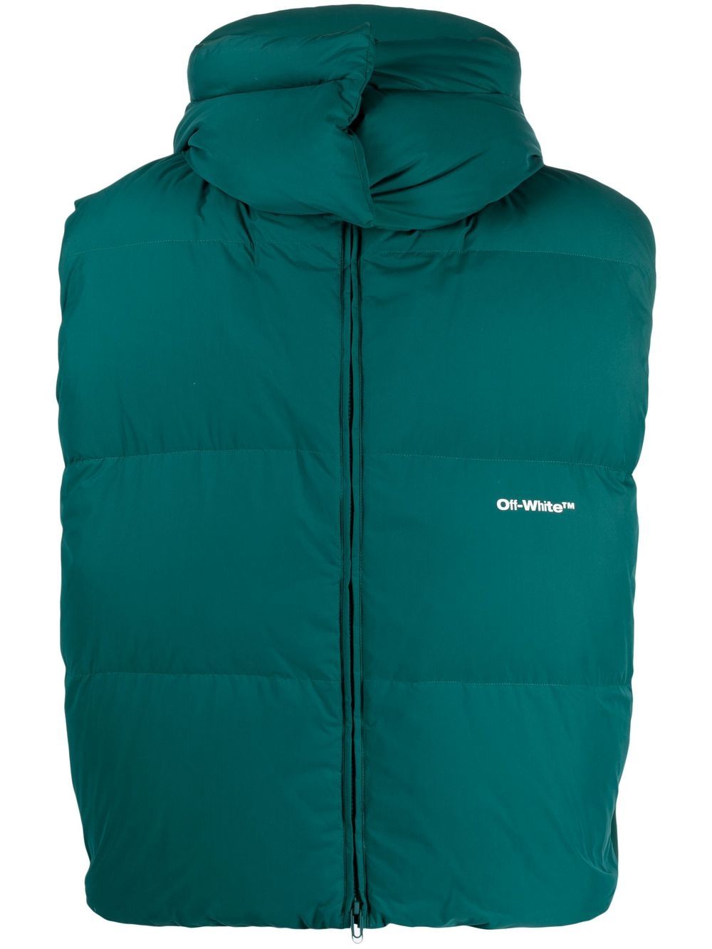 emerald green feather down padded design logo print to the front classic hood front zip fastening sleeveless