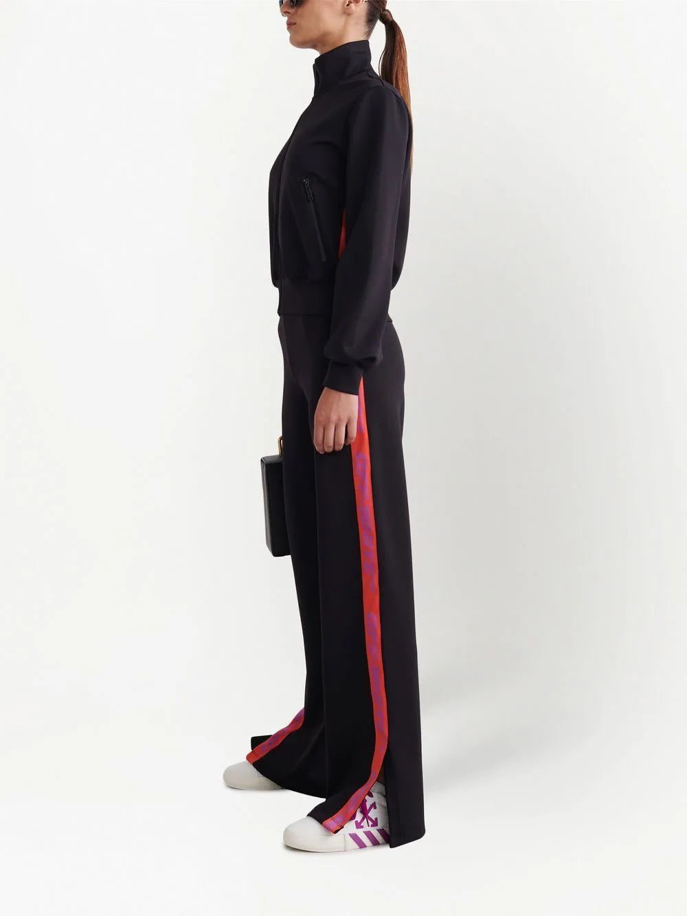 Off-White's track jacket is characterised by two contrasting side stripes in pink. This detailing is a nod to the label's love for logo-sprawled surfaces.