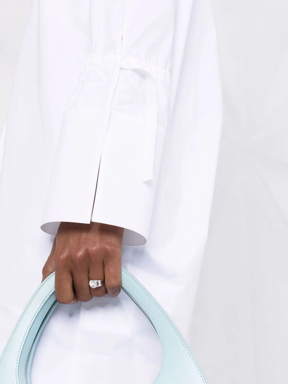 Off-White puts a signature contemporary twist on the shirtdress here, turning the classic silhouette into an unexpected design. An asymmetric construction creates this modern feel, reflecting the brand's idea of 'embracing the now in a sophisticated manner'.