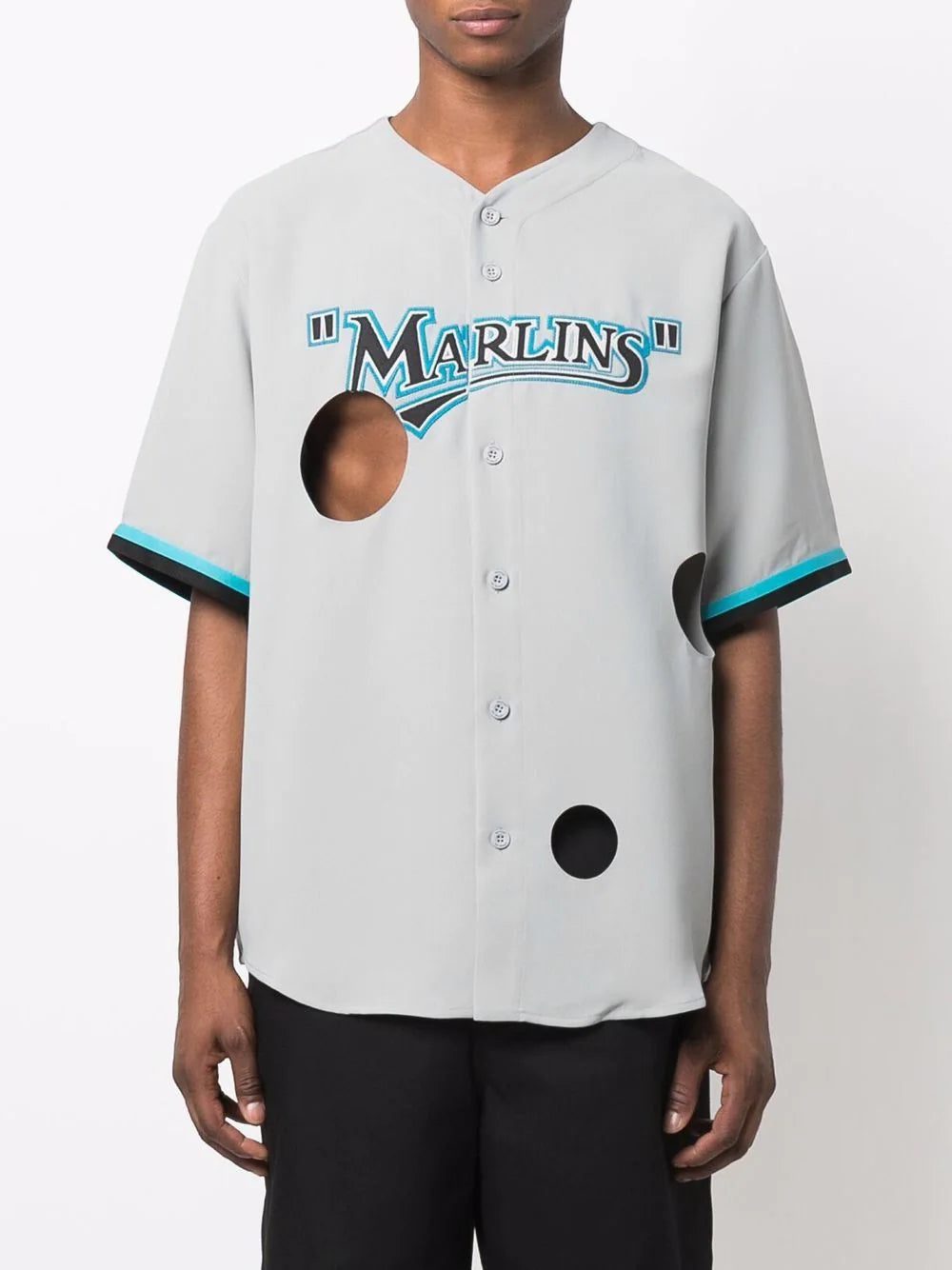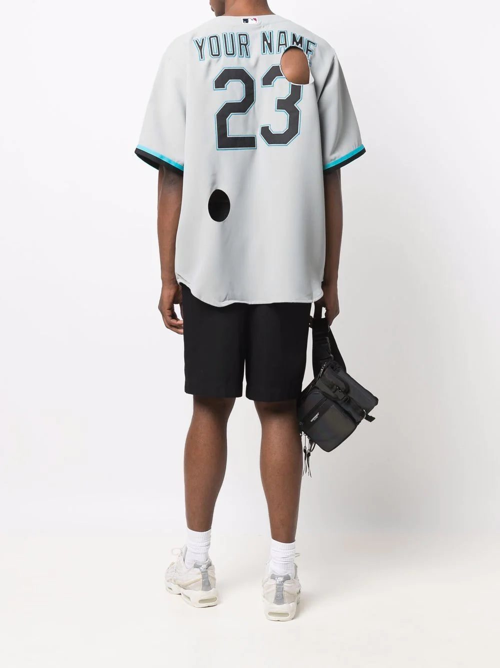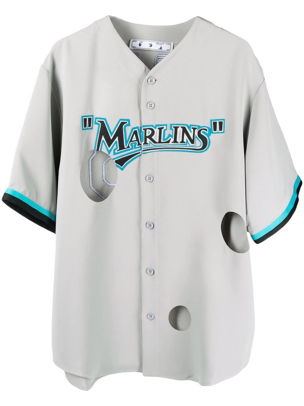 Off-White showcase a subversive take on sportswear with this Miami Marlins shirt. Featuring a classic jersey-style silhouette, the design is elevated with cut out detailing and a slogan print to the rear reading 'Your Name' in the brand's playful style.
