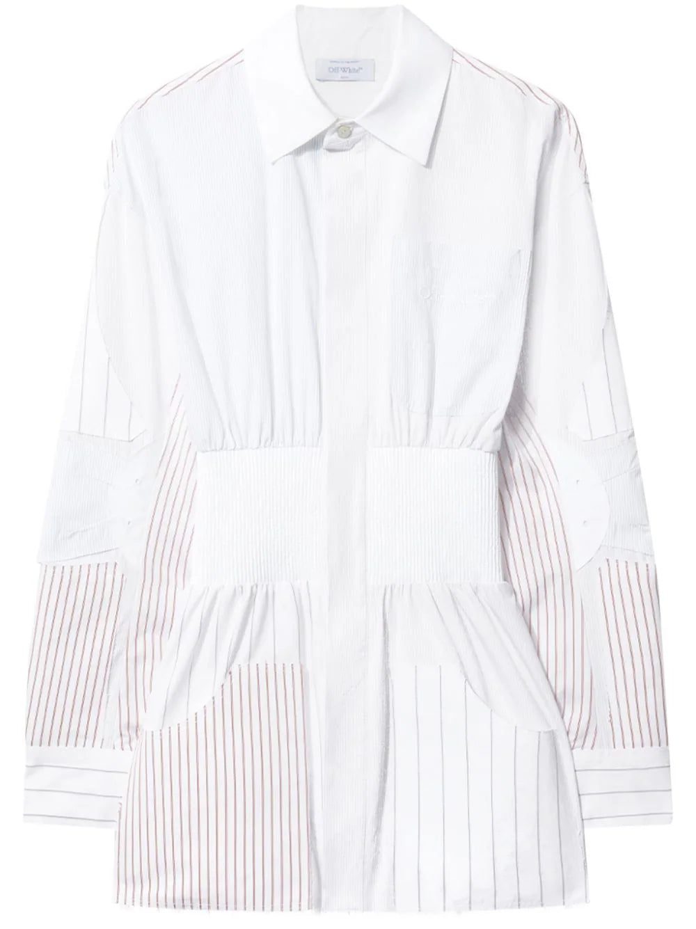 Motorcycle long-sleeved shirt dress from OFF-WHITE featuring white, cotton, vertical stripe pattern, spread collar, concealed front button fastening, long sleeves, fitted waistline, straight hem and above-knee length.