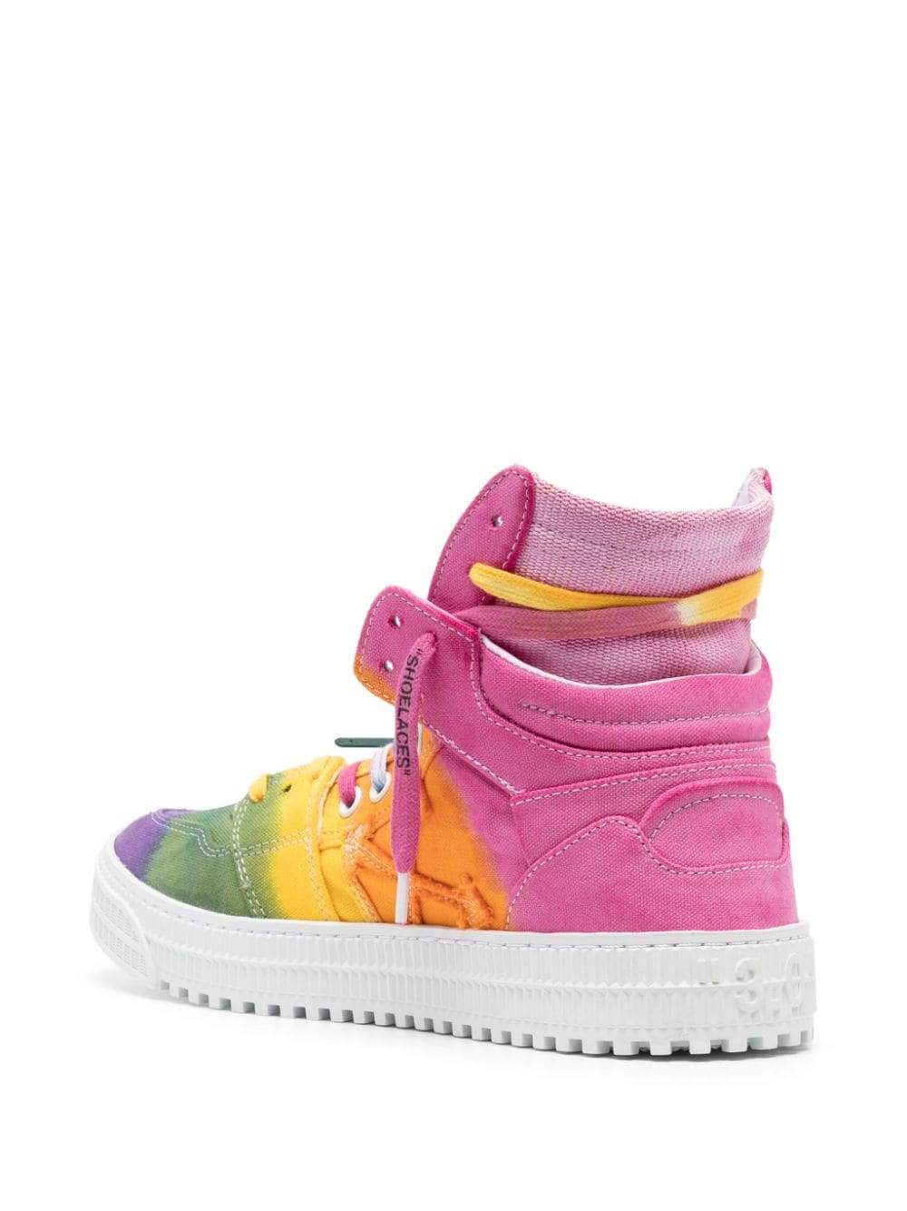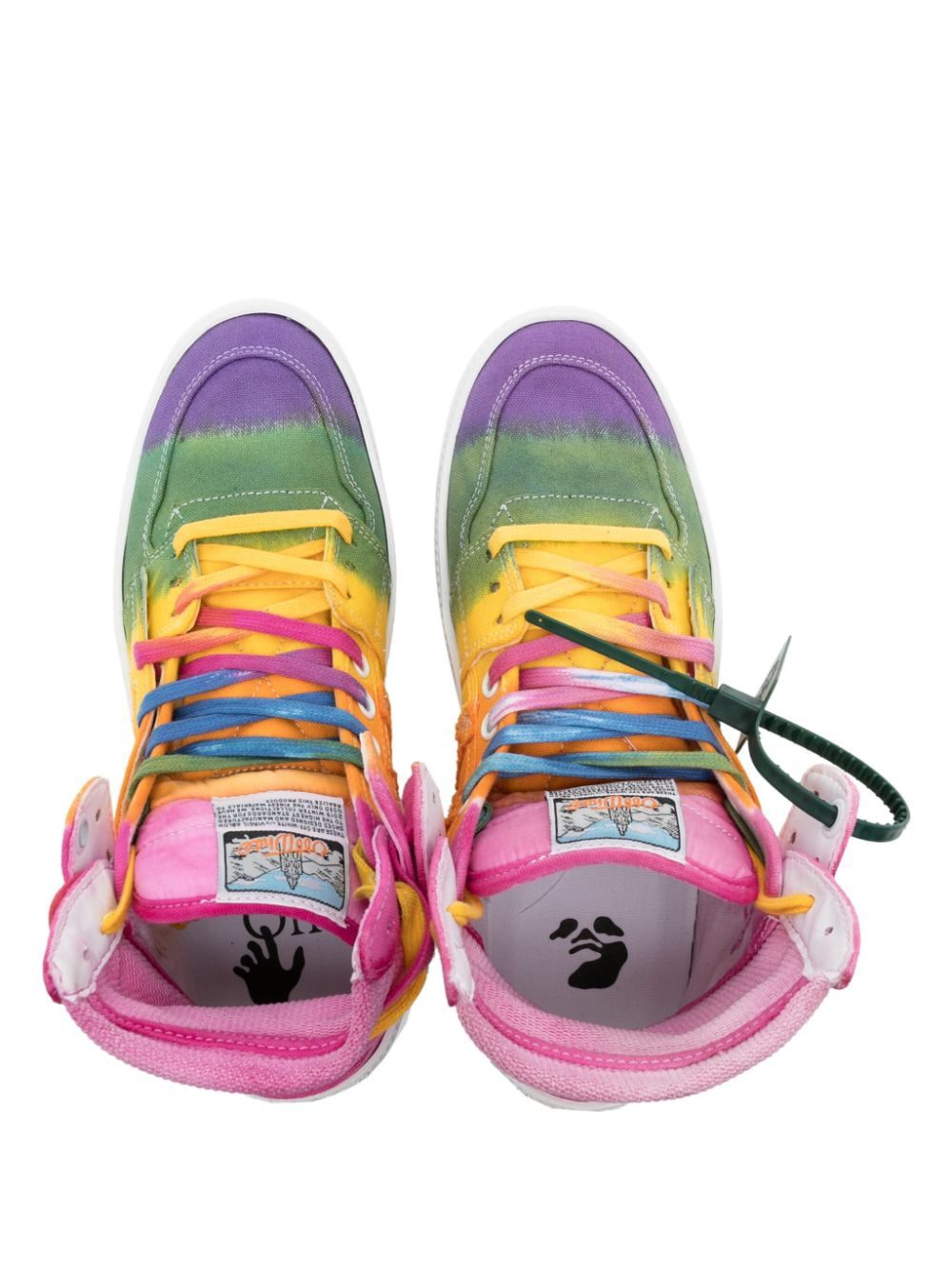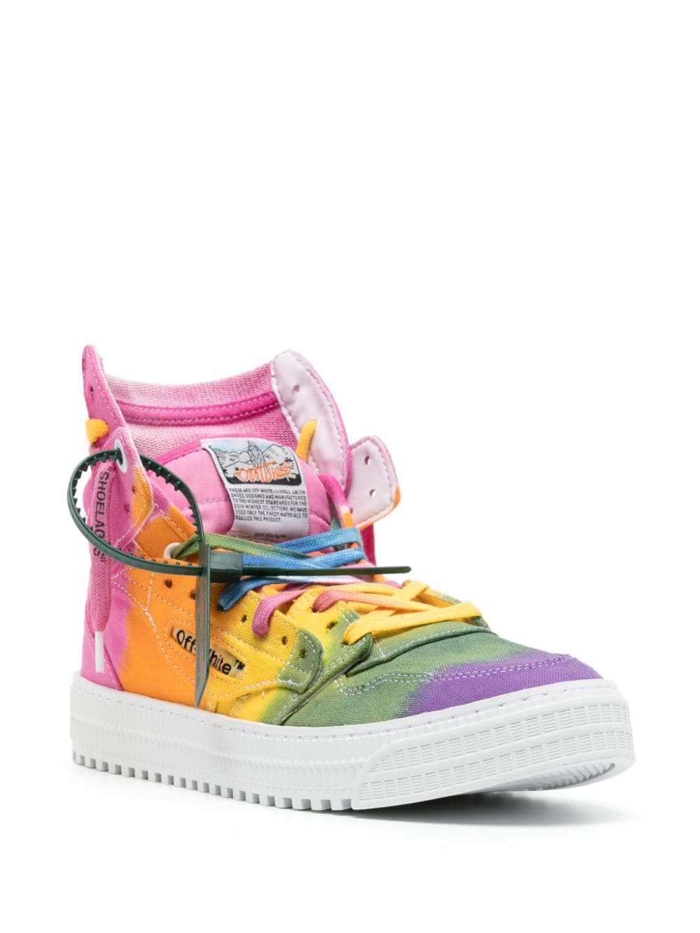 In rainbow hues, this iteration of Off White's Off Court 3.0 sneakers speak to the label's creative style. The high-top pair are crafted from canvas with a innovative panelled design. The signature Zip Tie tag adorns the side in dark green.