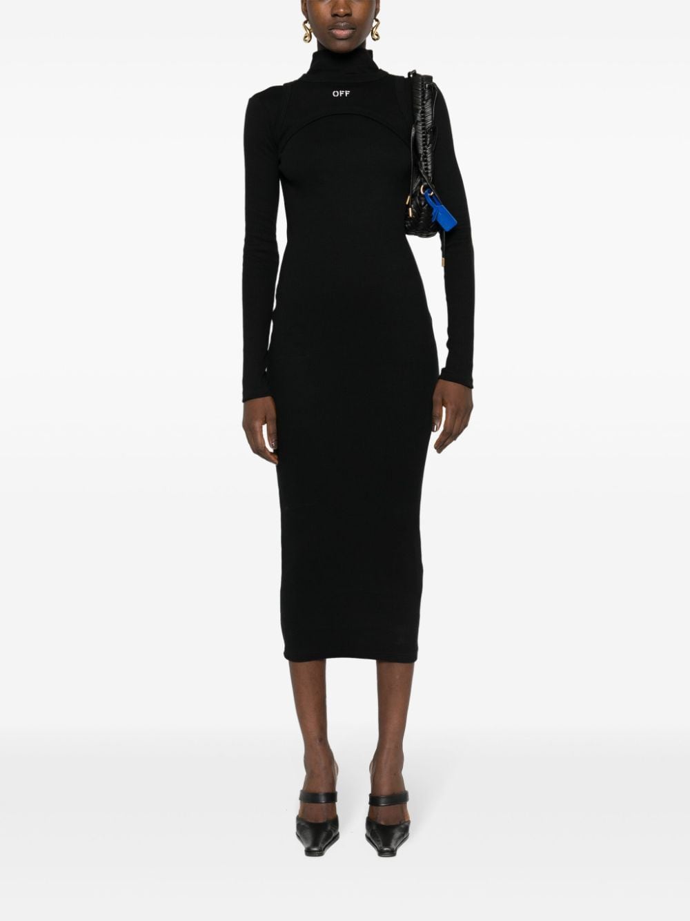 Exuding a sleek and sporty quality, this black dress by Off-White is made from stretch-cotton ribbed knit to a mid-length silhouette with a harness-like layer along the neckline. It is finished with the brand's signature Off Stamp logo embroidered at the chest.
