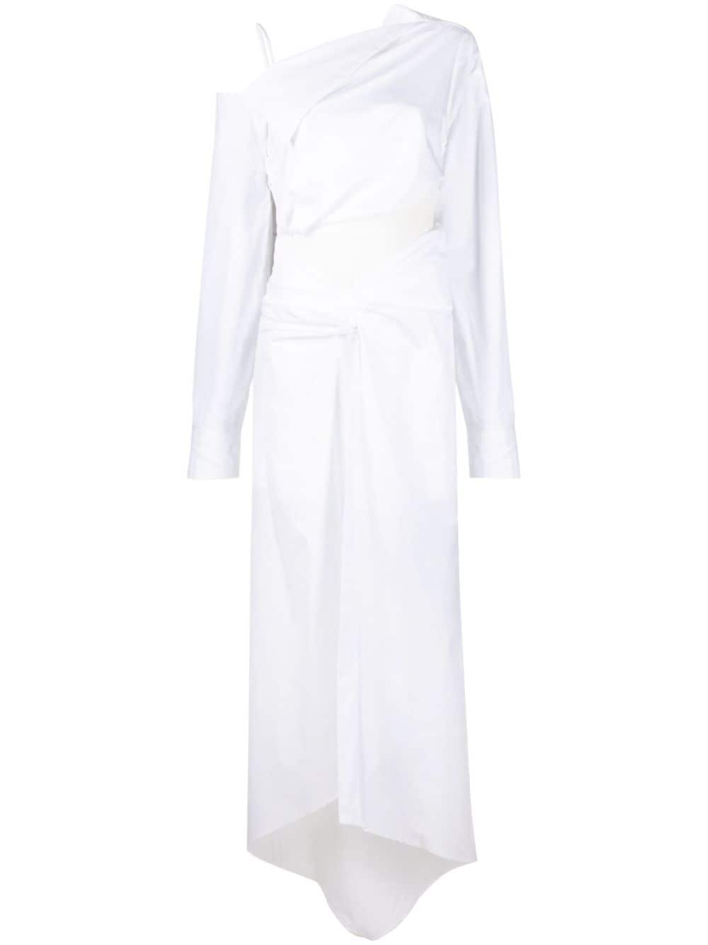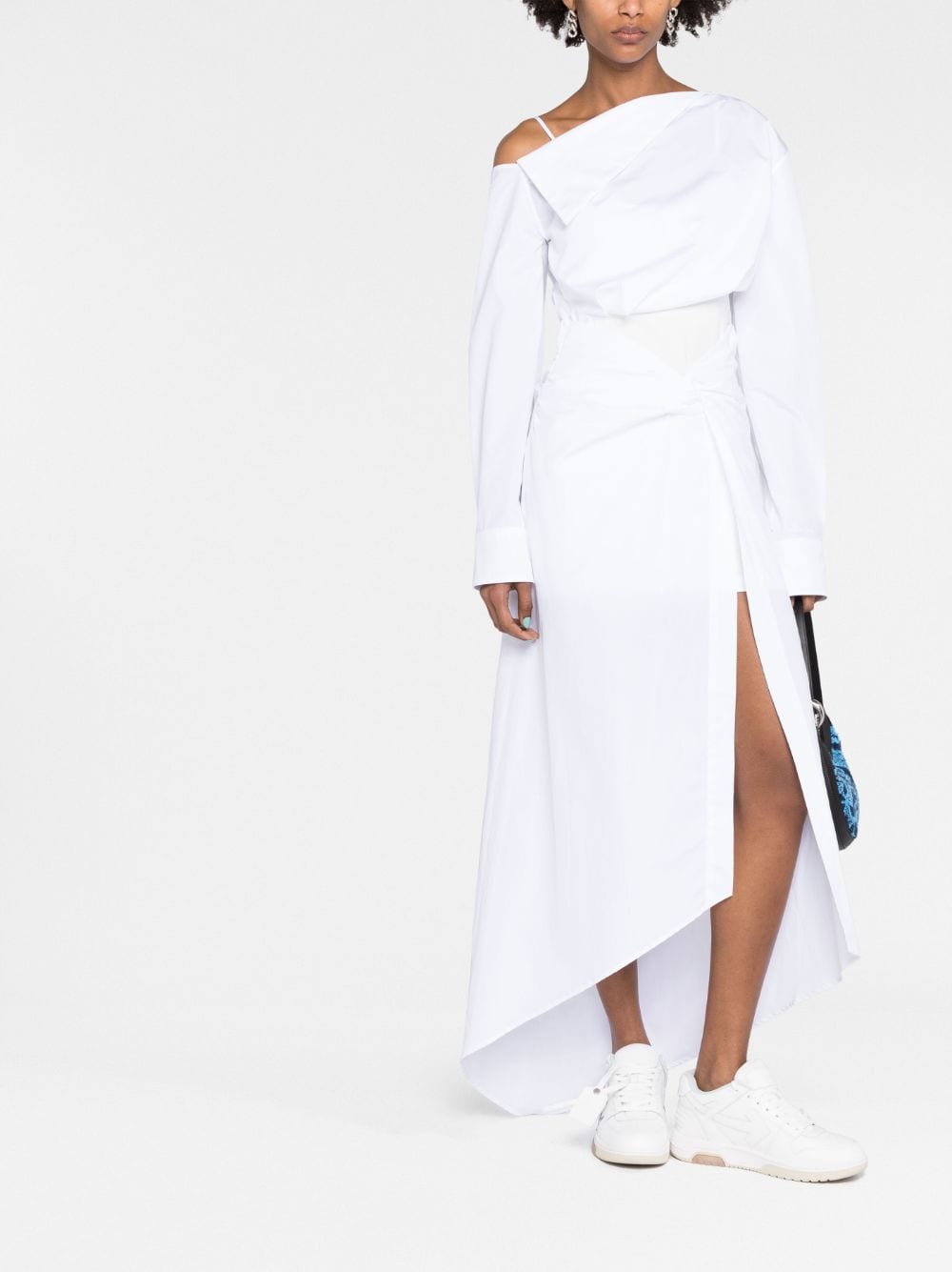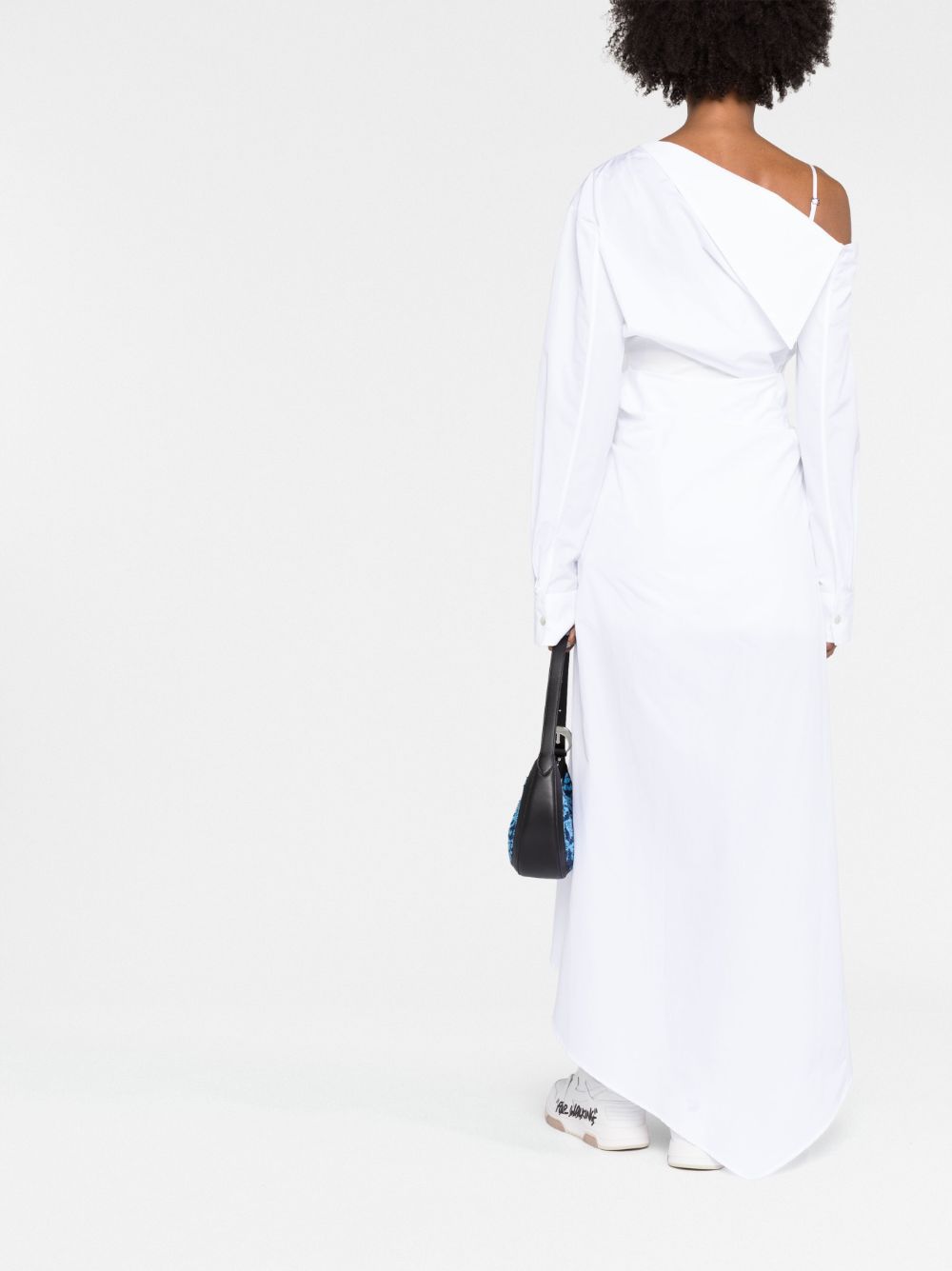 This one-shoulder dress gently nods to Off-White's penchant for deconstructed and innovative creations. The crisp white cotton construction and long sleeves nod to a classic shirt style contrasted by a one-shoulder silhouette and asymmetric skirt.