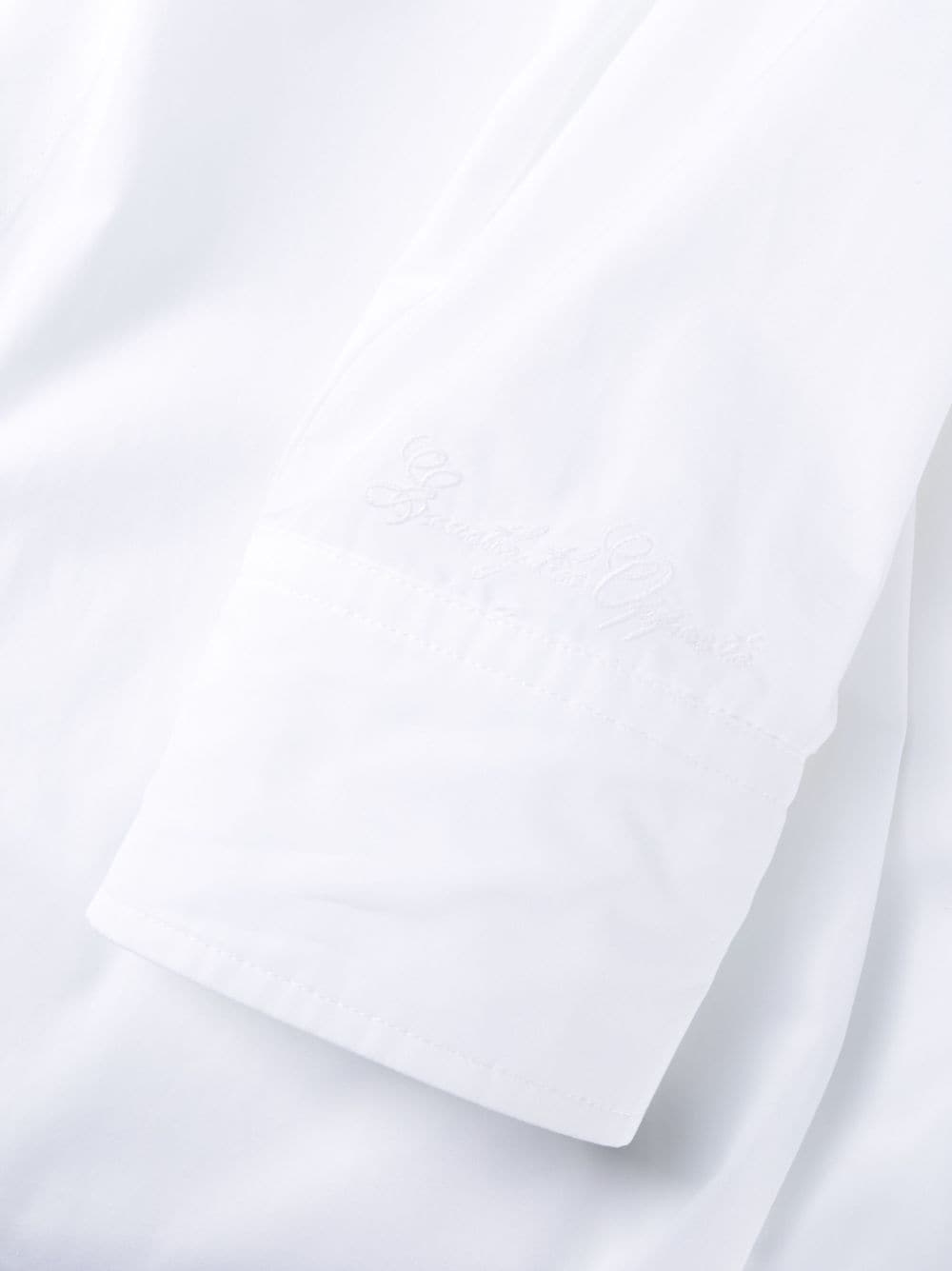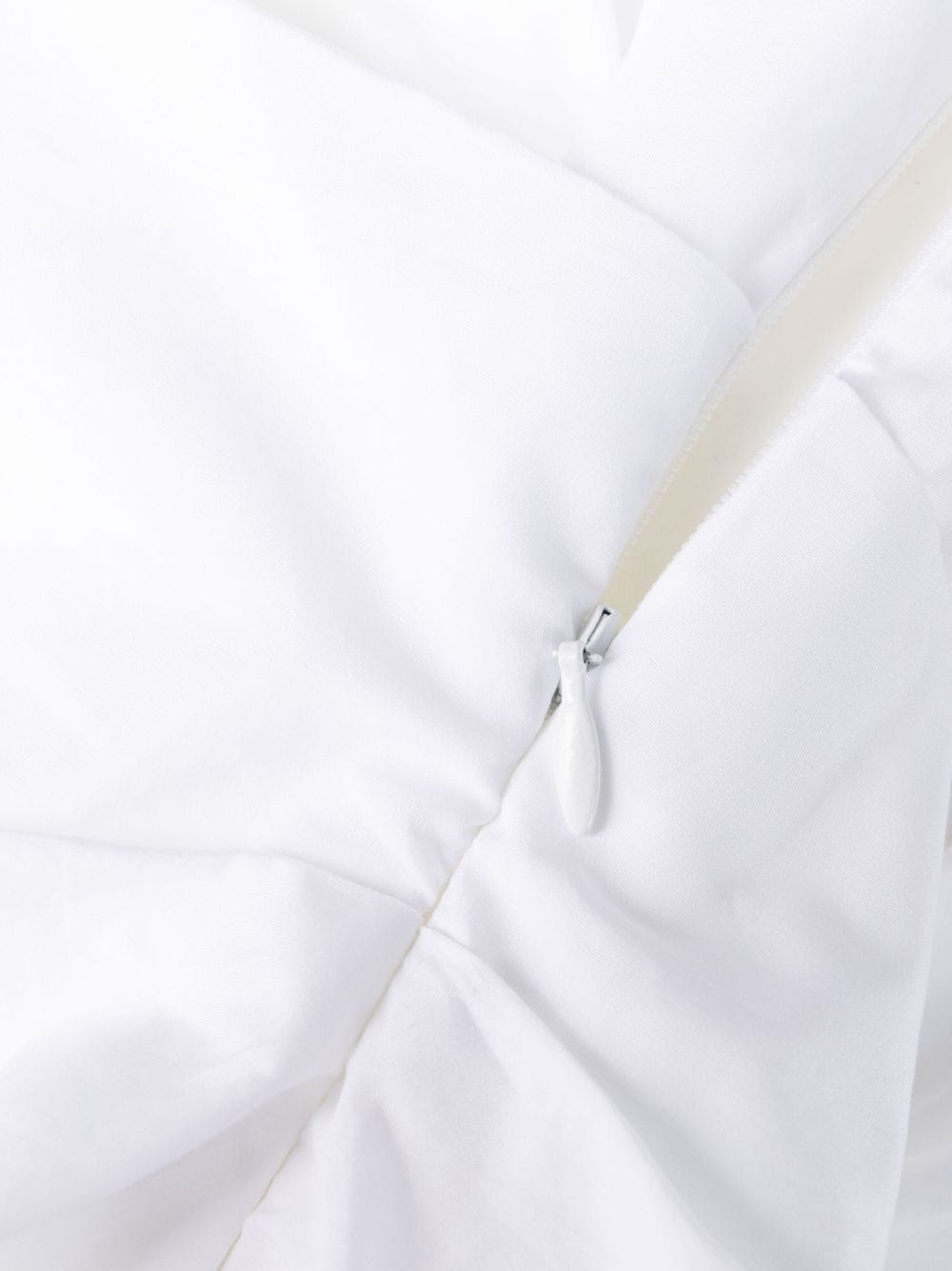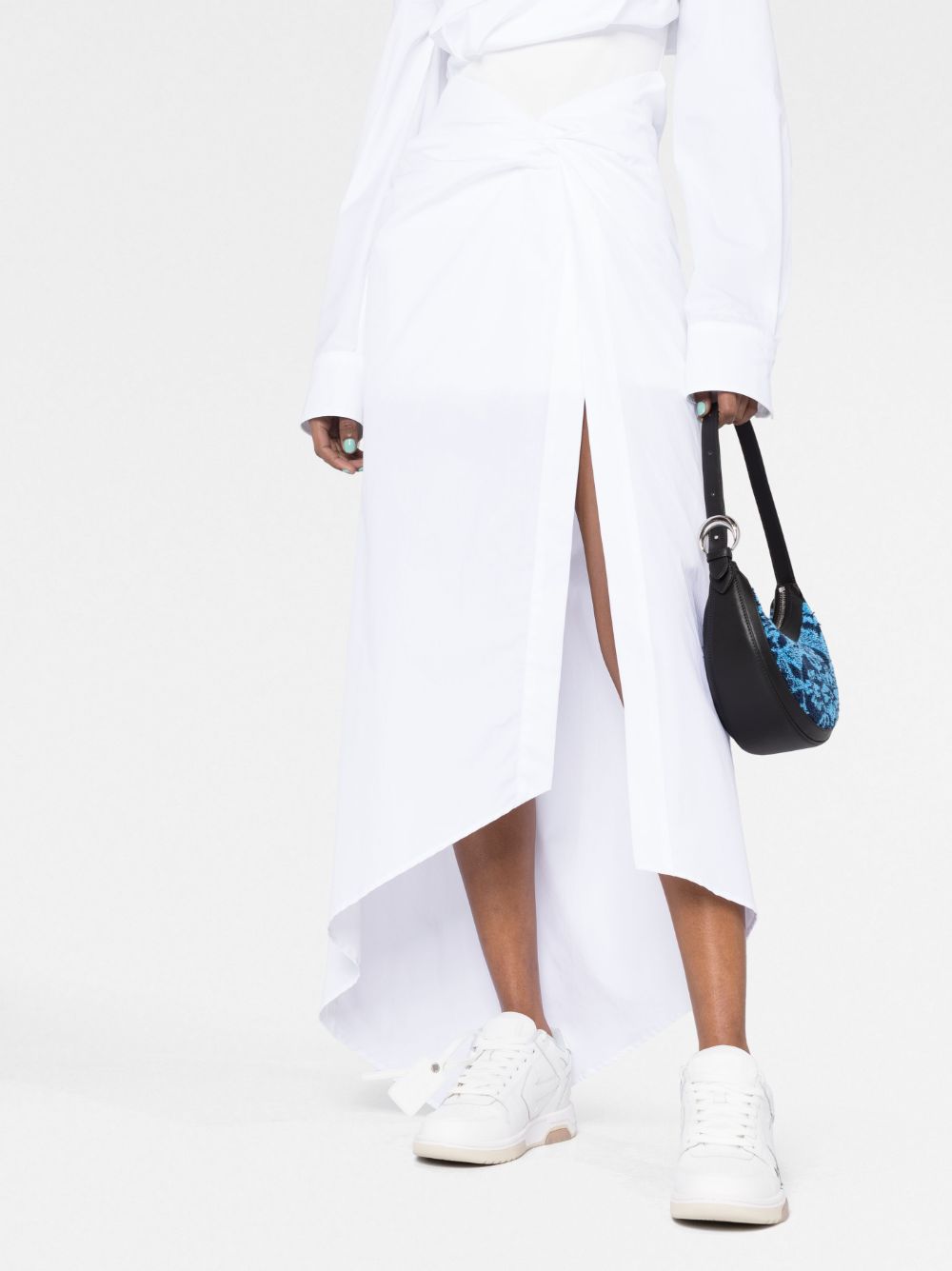 This one-shoulder dress gently nods to Off-White's penchant for deconstructed and innovative creations. The crisp white cotton construction and long sleeves nod to a classic shirt style contrasted by a one-shoulder silhouette and asymmetric skirt.