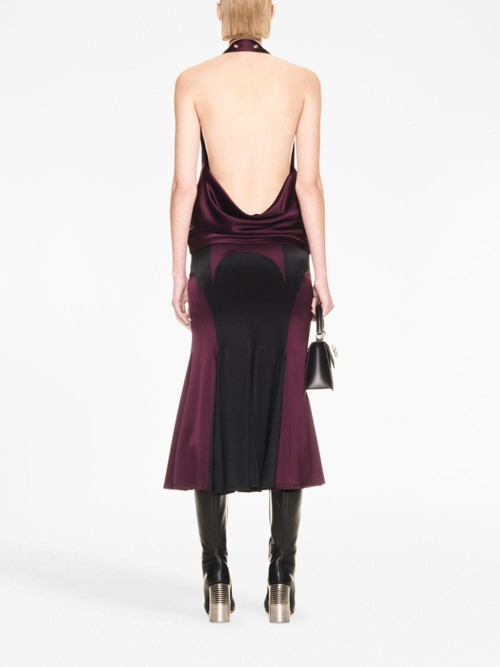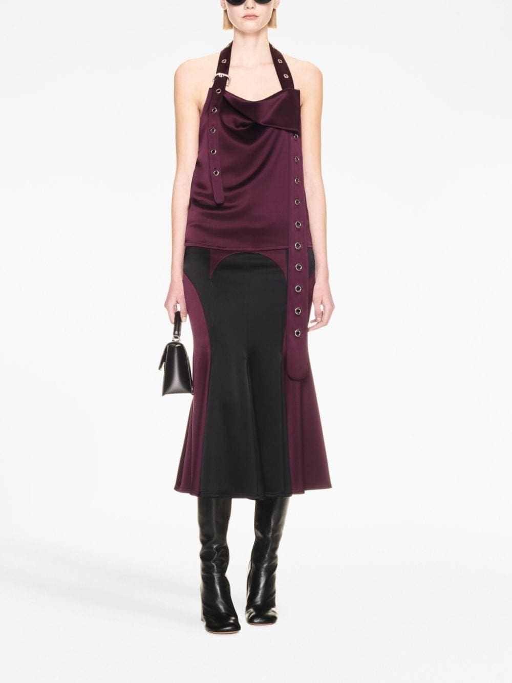 Avant-garde pieces take centre stage at Off-White for AW23, as evidenced by this burgundy top. It's characterised by its belted halterneck fastening, silver-tone eyelet detailing and open back that speaks to the collection's conceptual mood.