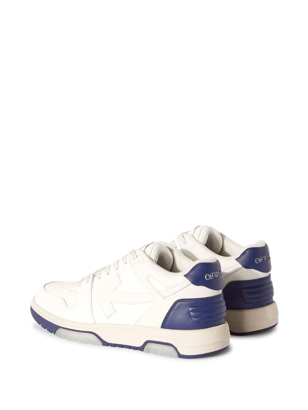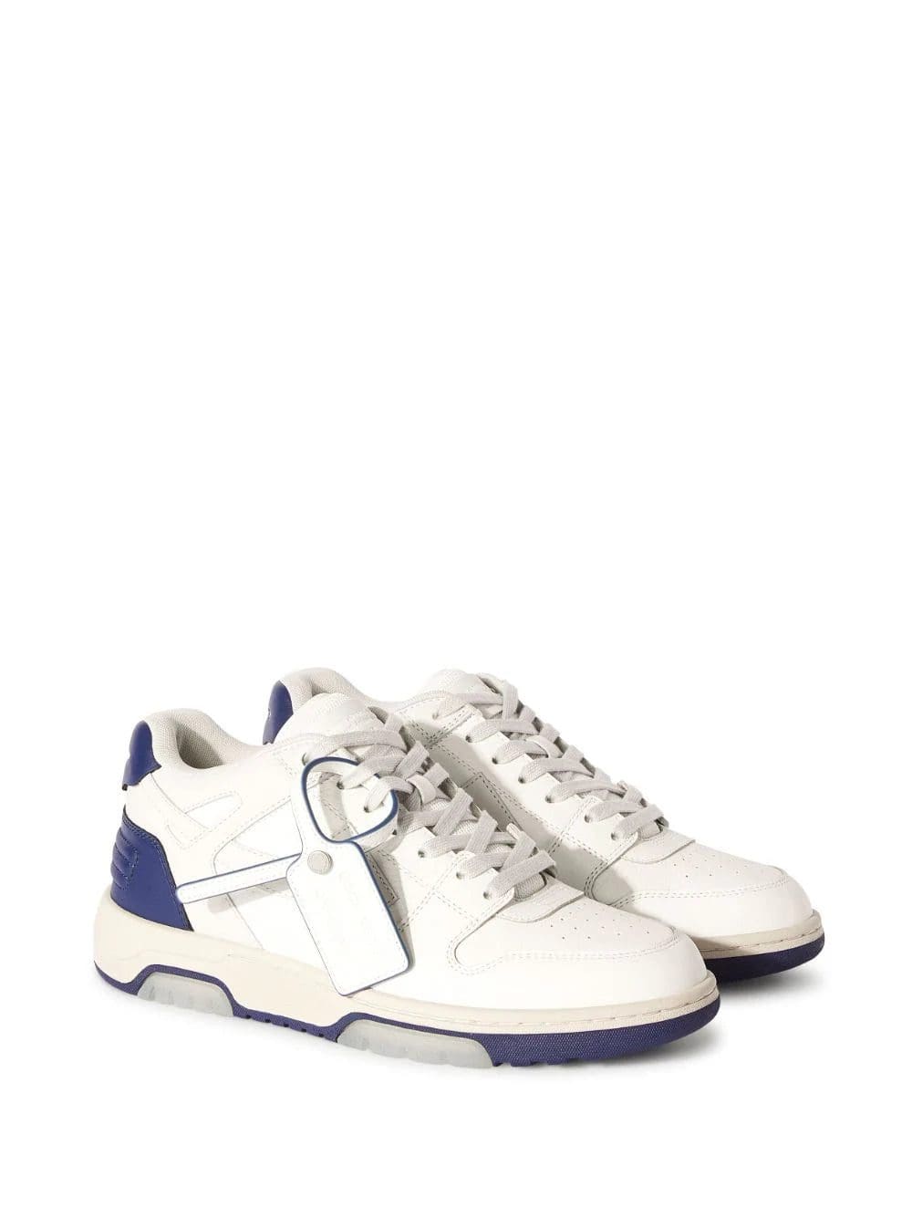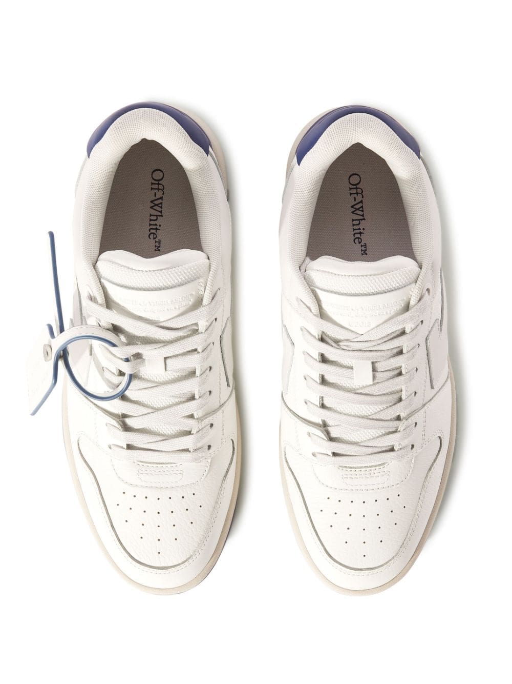 Off-White's signature Out Of Office sneakers draw inspiration from '80s silhouettes and are distinguished by the iconic Arrows motif and removable tag. For AW23, this familiar construction is refreshed in white and navy blue.