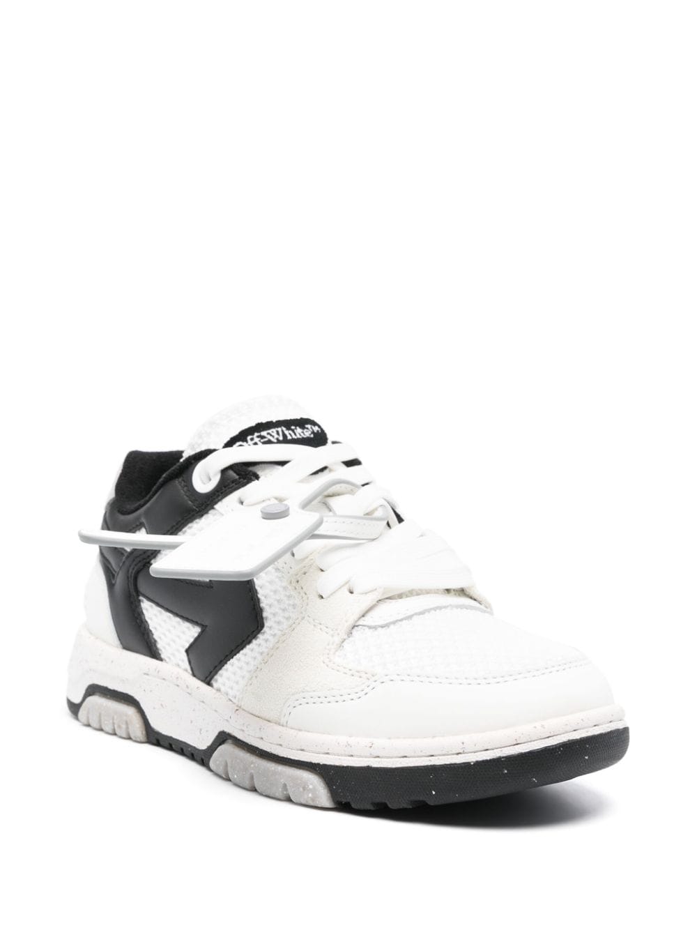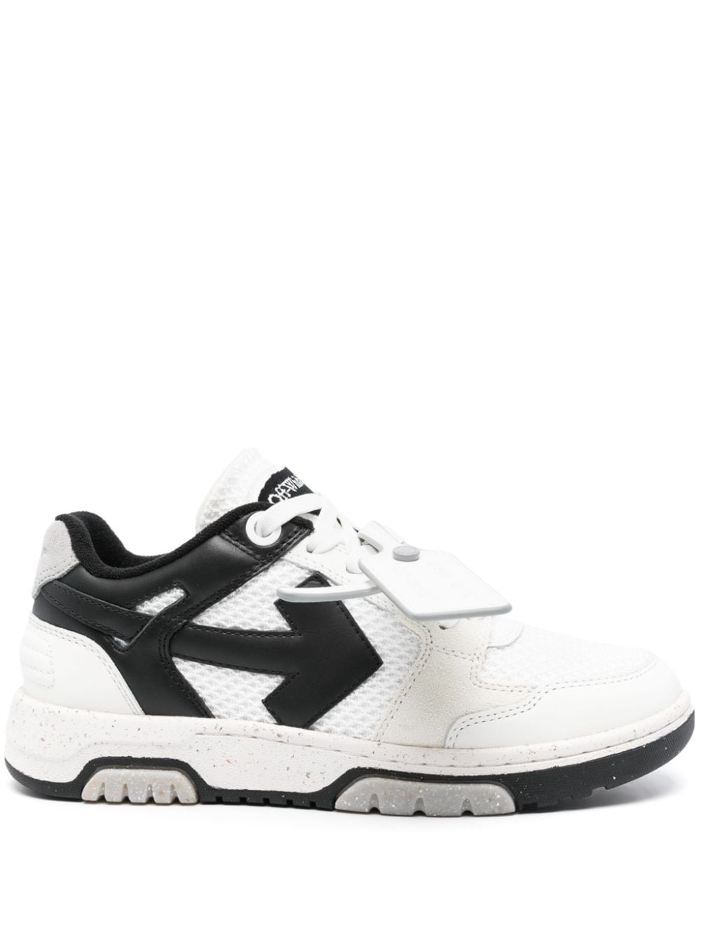 Off-White's Out of Office sneaker merges street, basketball, and running influences in a single design. Coupled with a suggesting name, the pair aims 'to empower the public to escape the mundane and to create their world of infinite possibilities. Crafted from leather, this iteration features signature brand motifs such as the arrow and zip tie tag in an eye-catching gold tone.