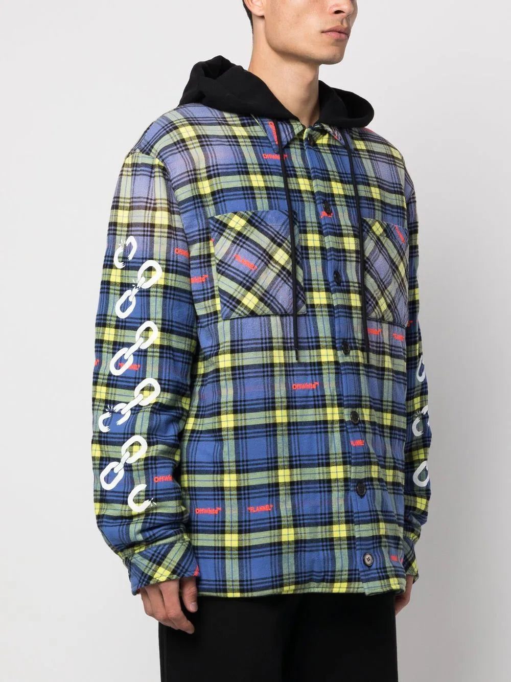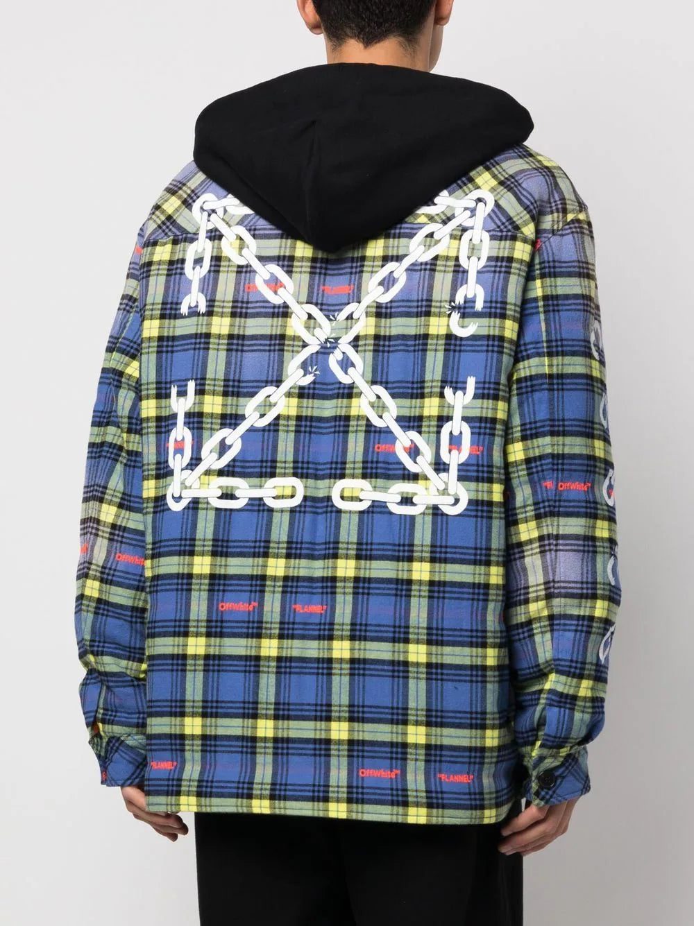Off-White adds a laid-back look to the shirt jacket silhouette with this design. The blue and multicolour construction welcomes a layered drawstring hood for a casual feel.