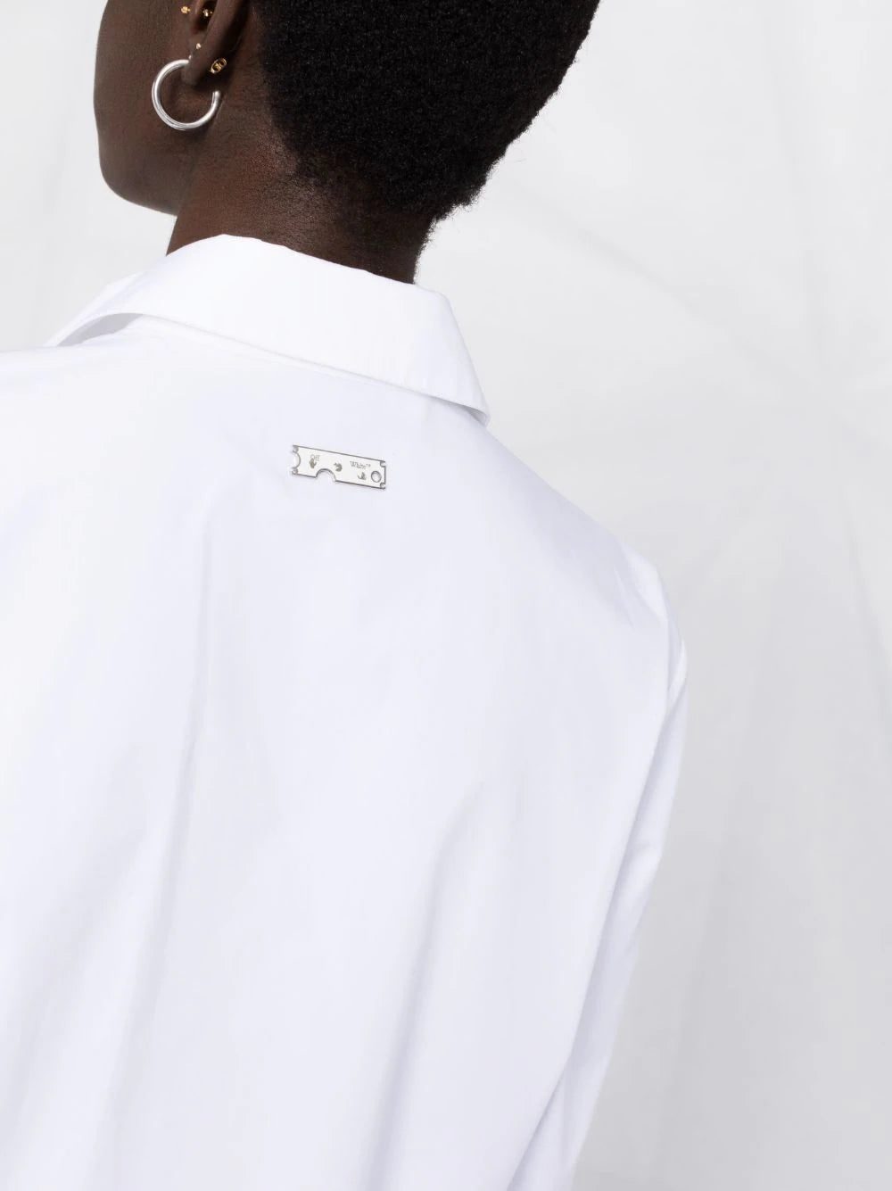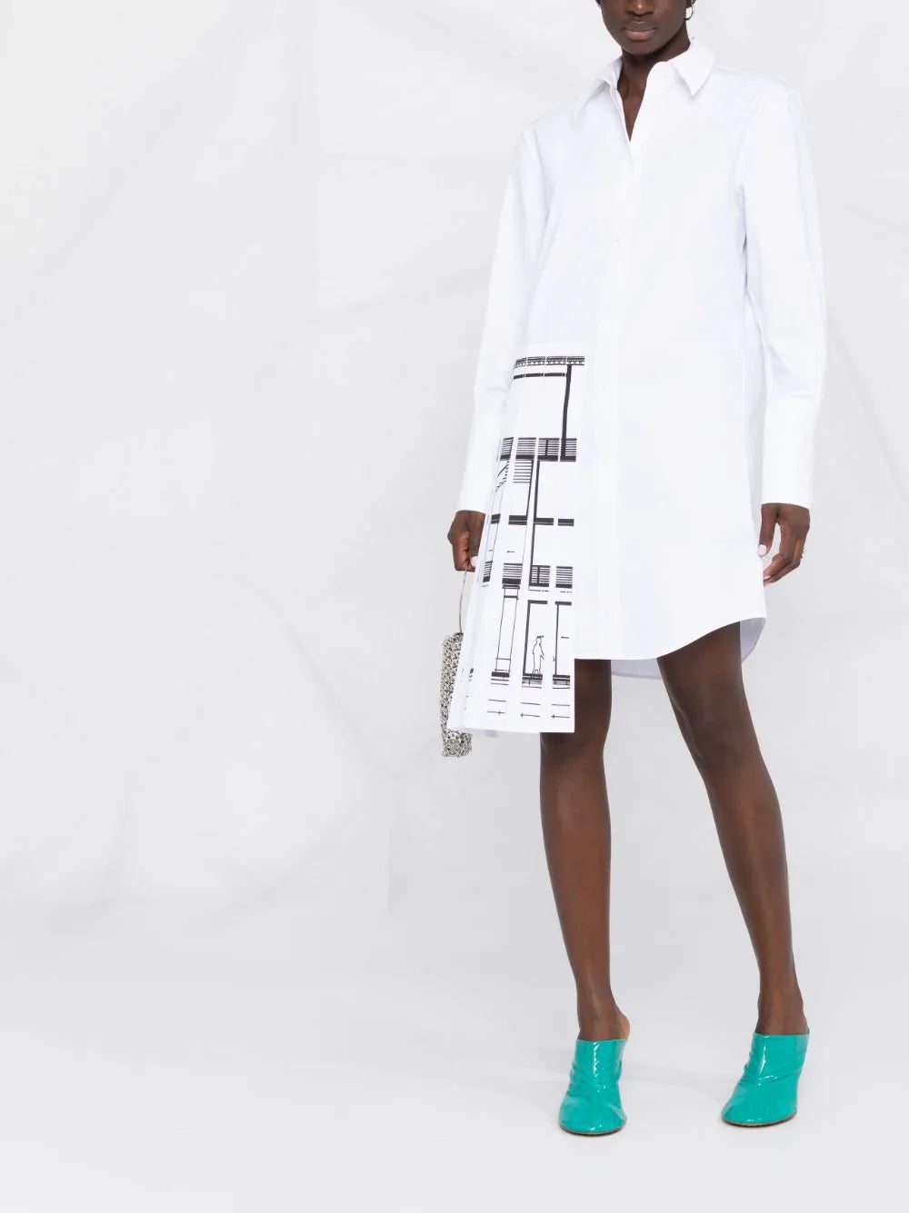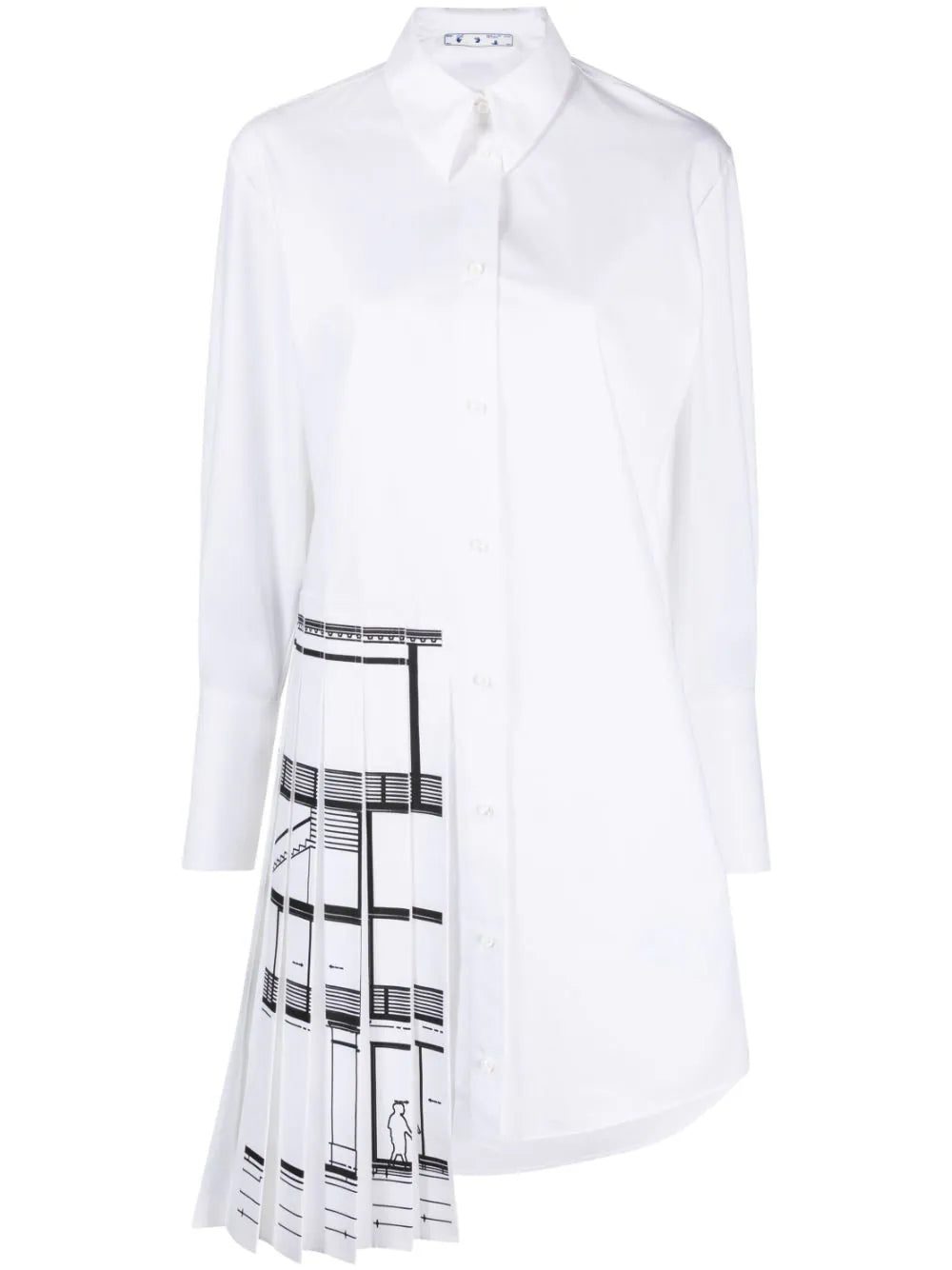 For its AW21 collection, Off-White brings a twist to classic pieces, such as this shirt-dress. Designed in traditional white cotton with a curved hem, it has a longer pleated panel on one side, which is printed in contrasting black.