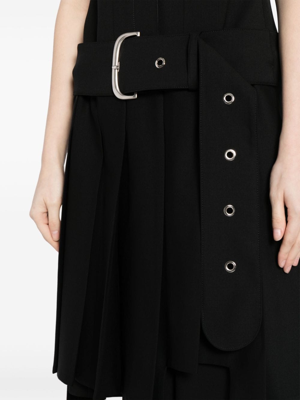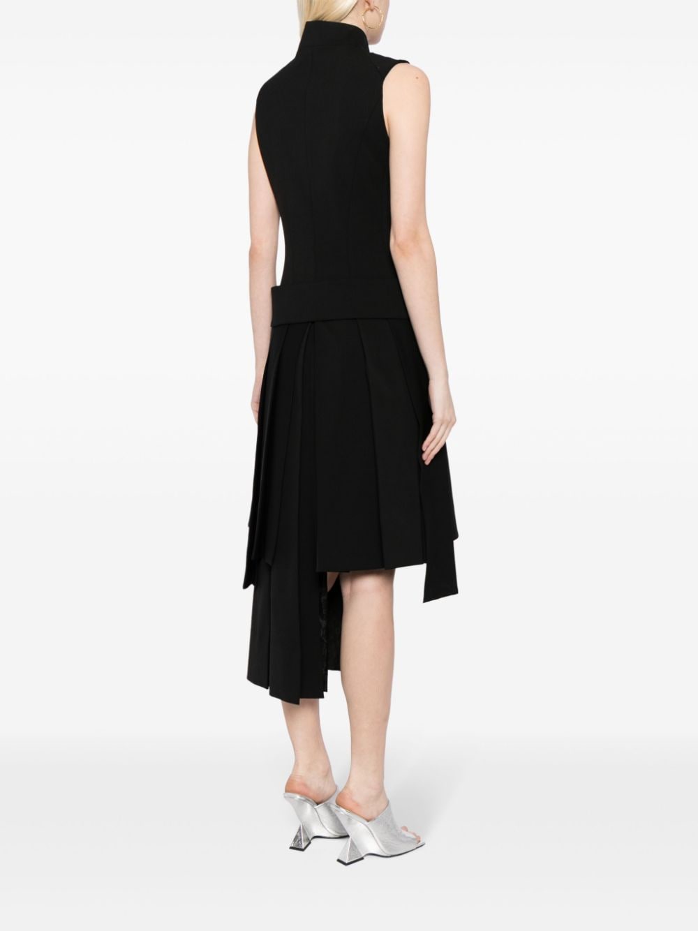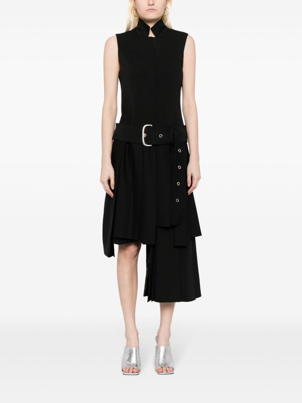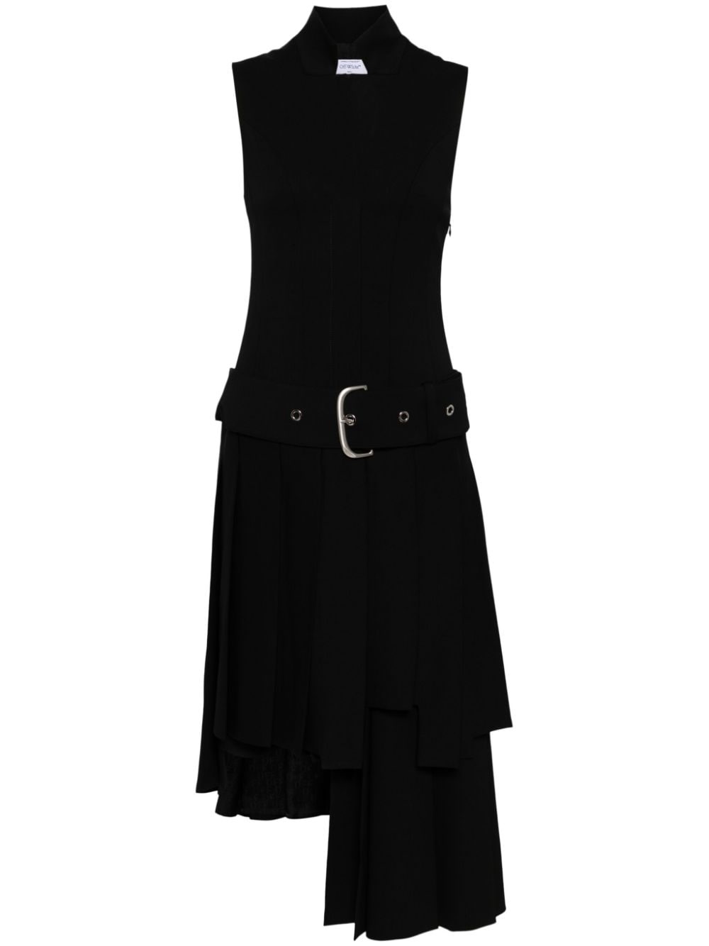 Off-White presents an innovative dress made from balck stretc-wool. Designed for an asymmetric shape and adorned with a partially pleated skirt and a belted waist for a defined silhouette.