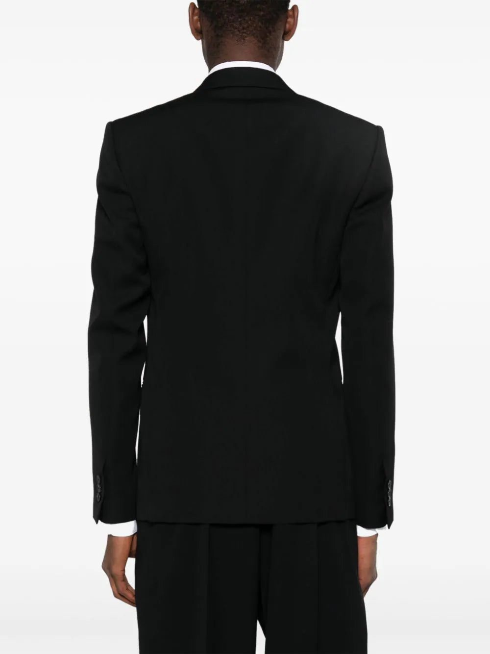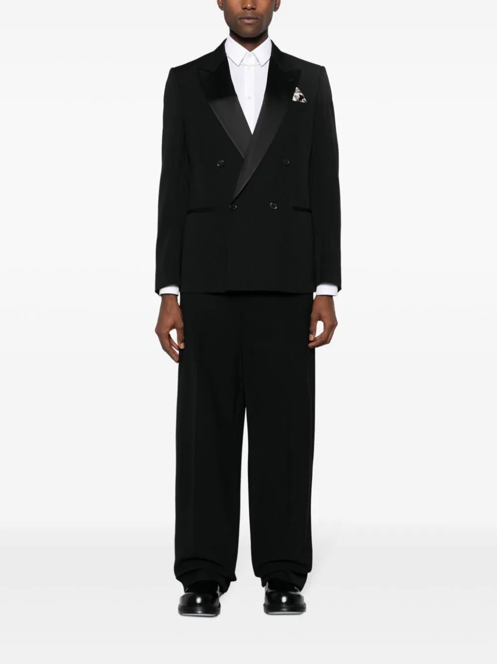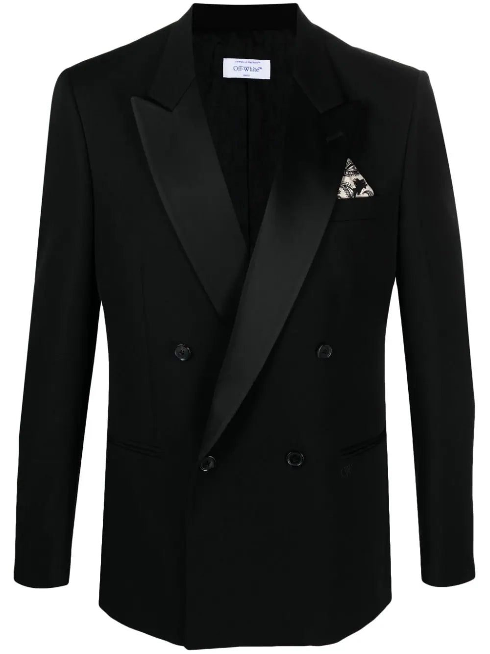 Off-White's tuxedo jacket proves the brand's expertise extends beyond streetwear. Impeccably cut from virgin wool in a double-breasted silhouette, it's backed with smooth satin and decorated with a pocket square.