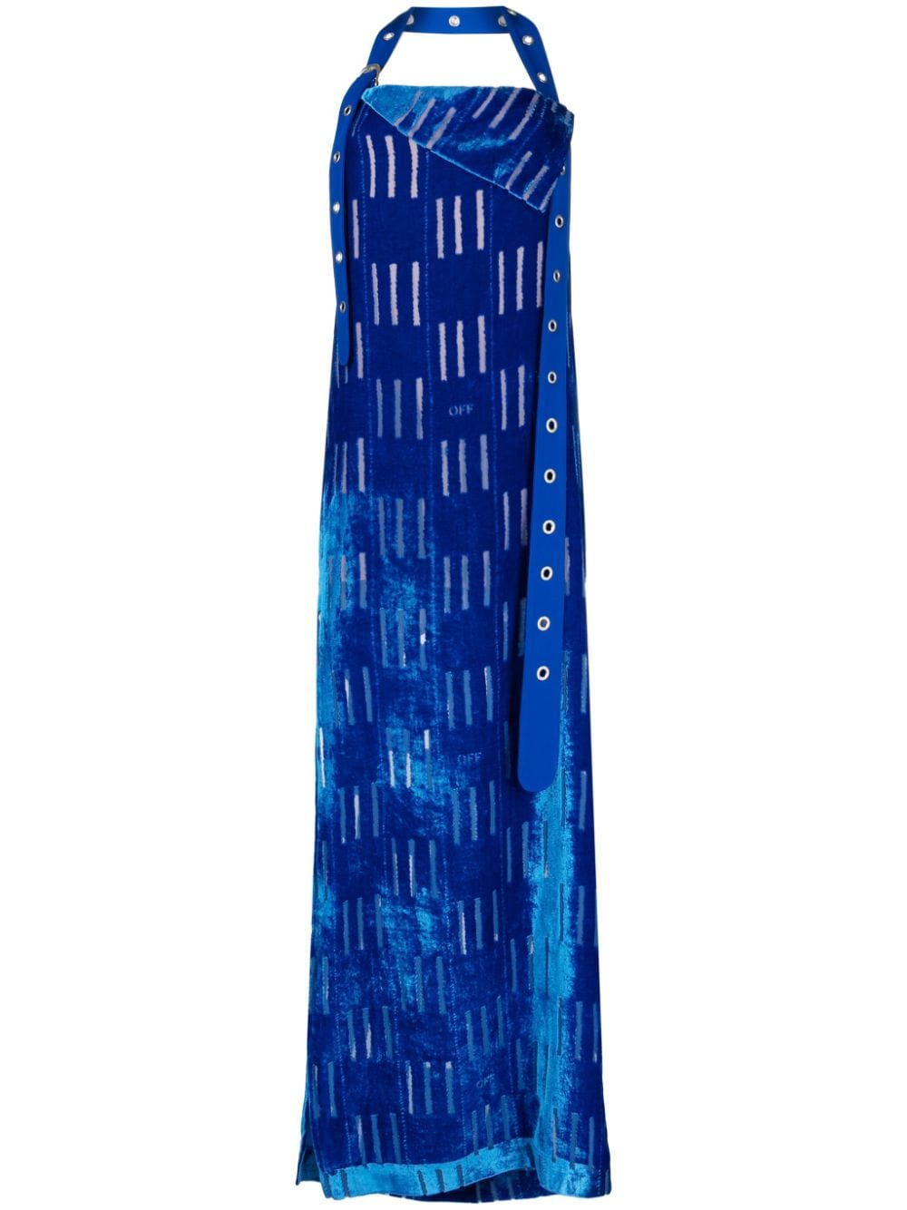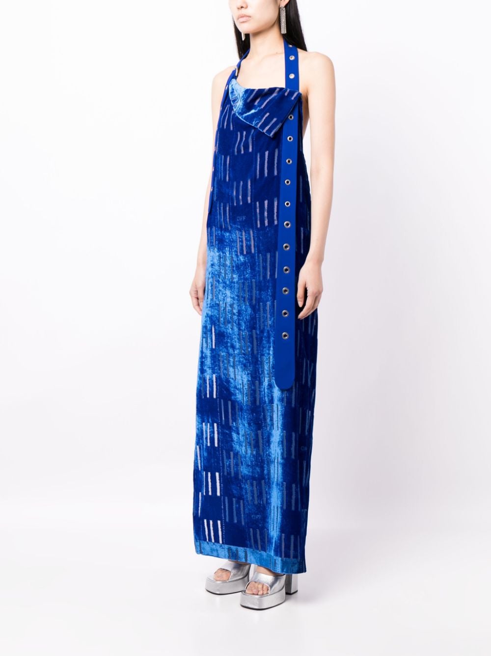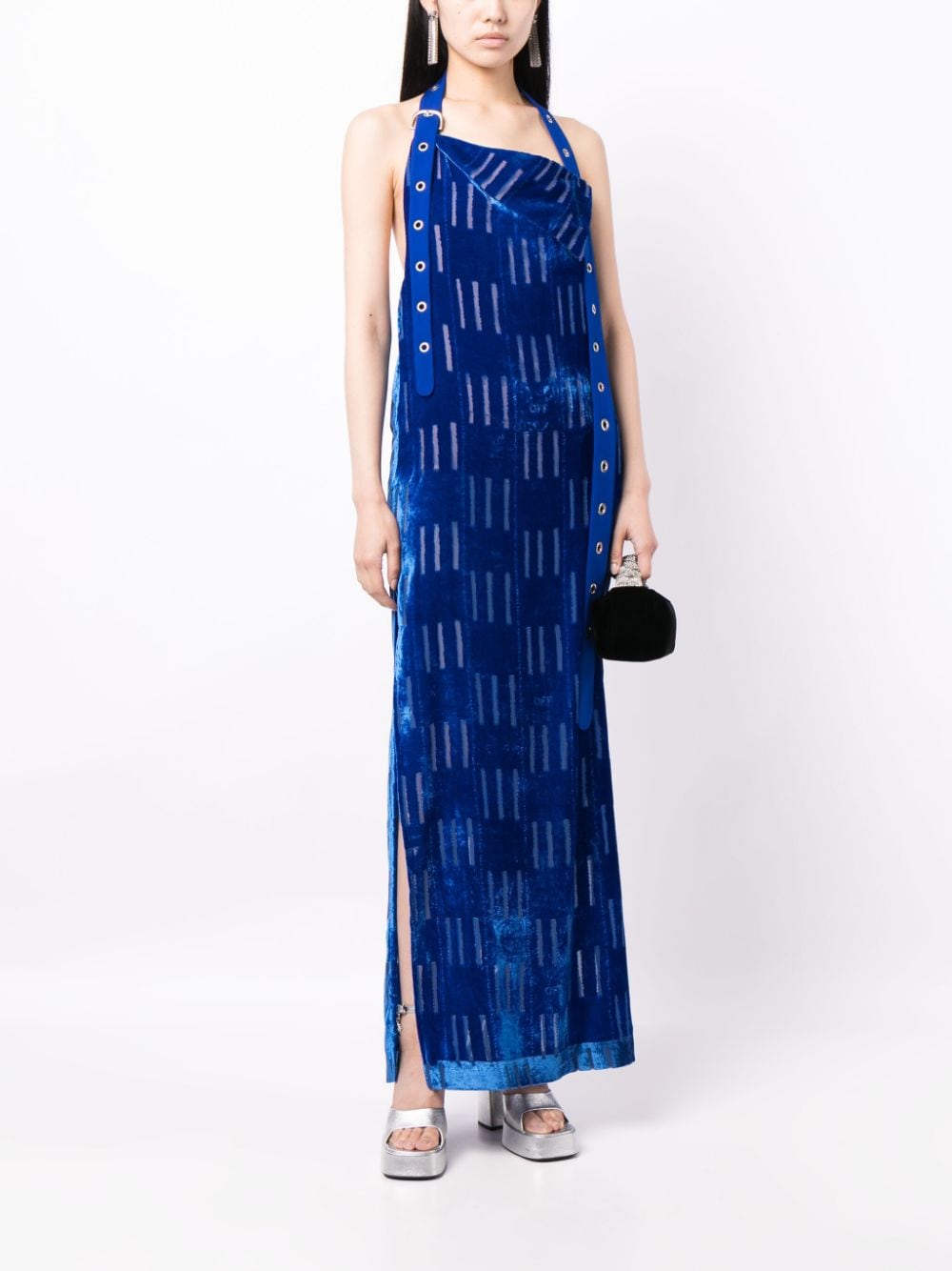 Inspired by the Japanese dyeing technique Shibori, this electric-blue dress is cut from devoré velvet with a geometric pattern. The halter neckline is created by an elongated buckled strap dotted with silver-tone eyelets in a nod to the label's utilitarian inspirations.